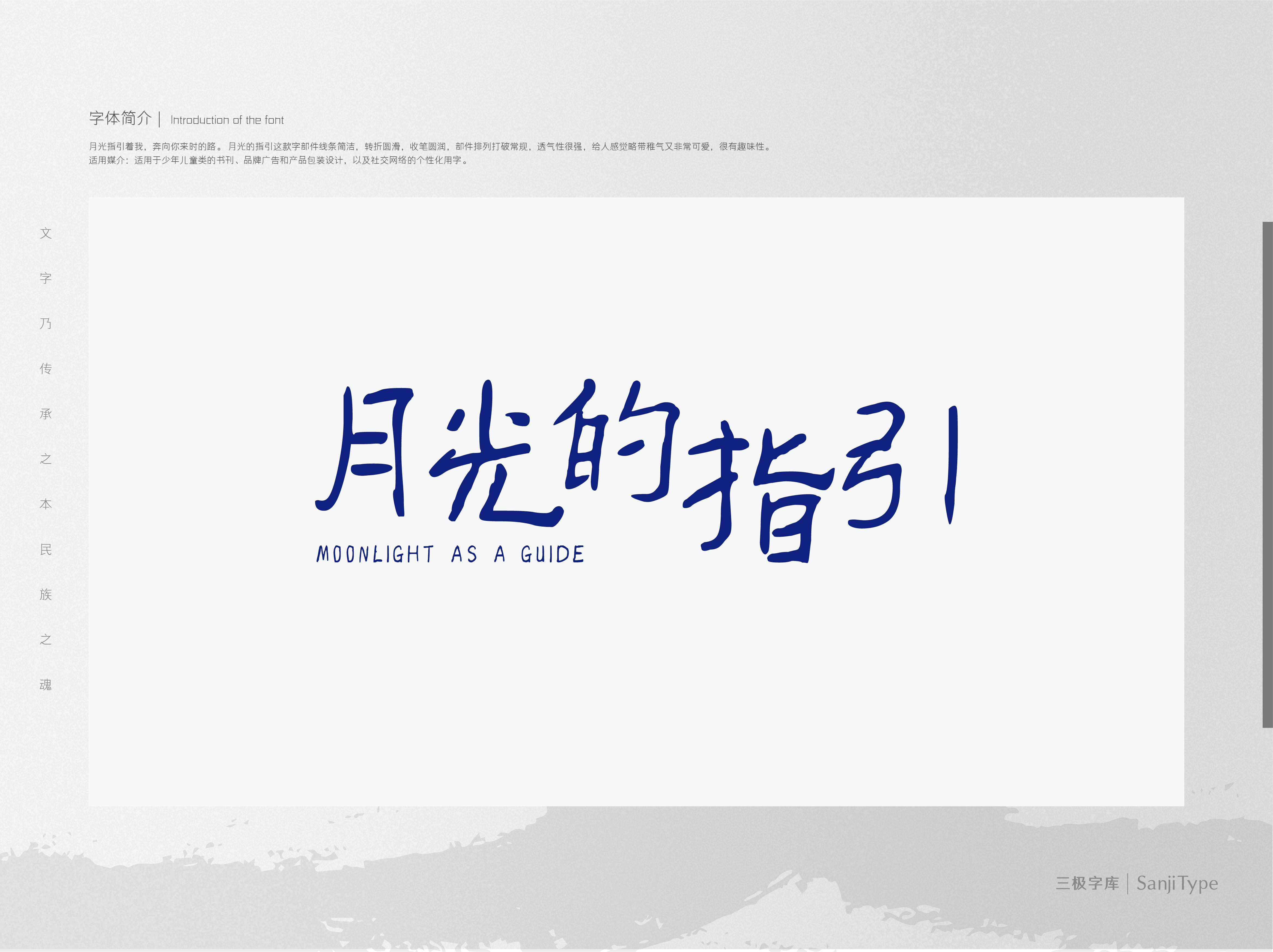 月光的指引这款字字面规整成矩形,部件线条简洁,转折圆滑,收笔圆润,能够胜任标题与正文用字。部件排列打破常规,透气性很强,给人感觉略带稚气又非常可爱,具有趣味性。适用于少年儿童类的书刊、品牌广告和产品包装设计,以及社交网络的个性化用字。