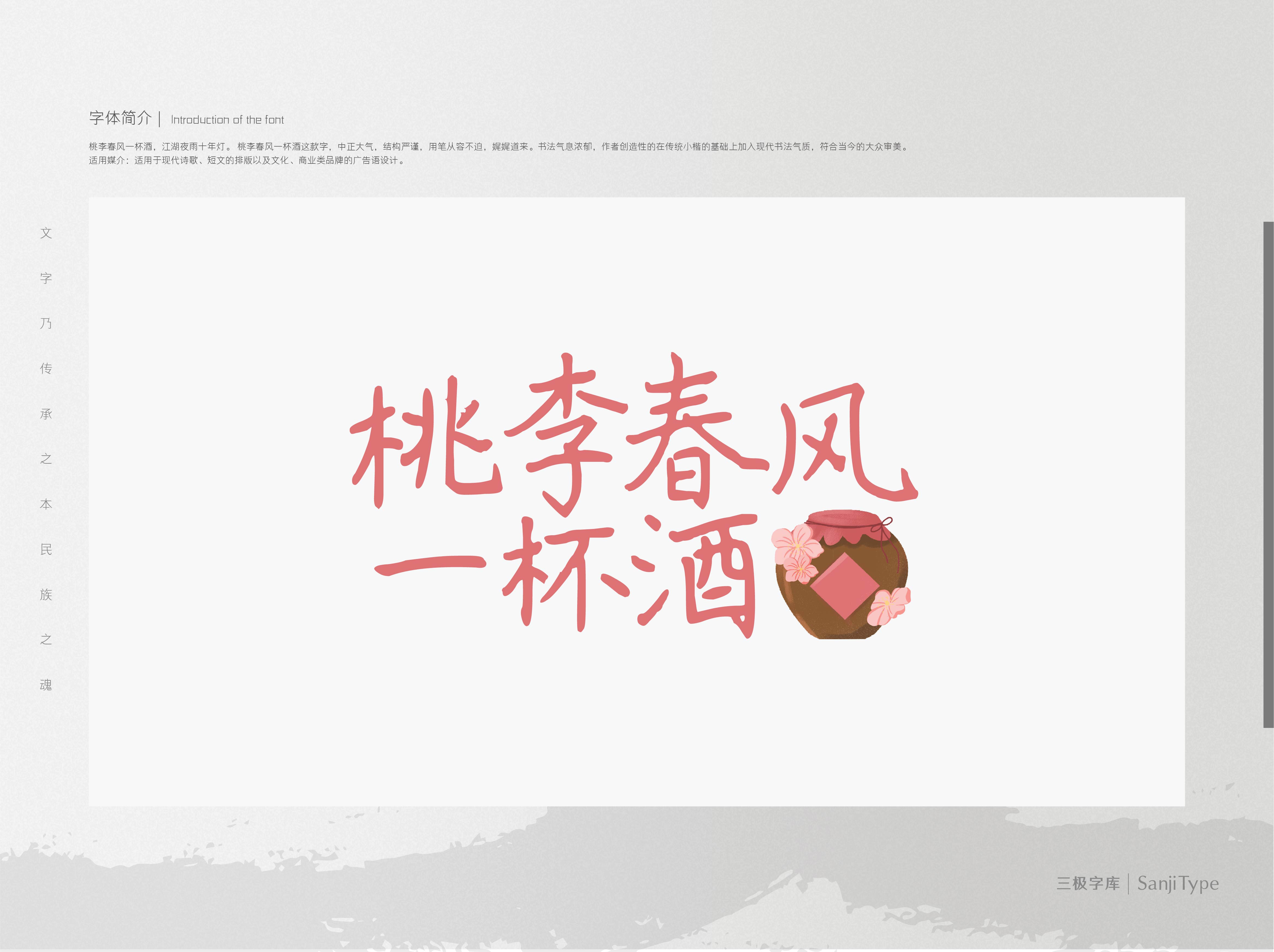 桃李春风一杯酒这款字,中正大气,结构严谨,用笔从容不迫,娓娓道来。书法气息浓郁,作者创造性地在传统小楷的基础上加入现代书法气质,符合当今的大众审美。适用于现代诗歌、短文的排版以及文化、商业类品牌的广告语设计。