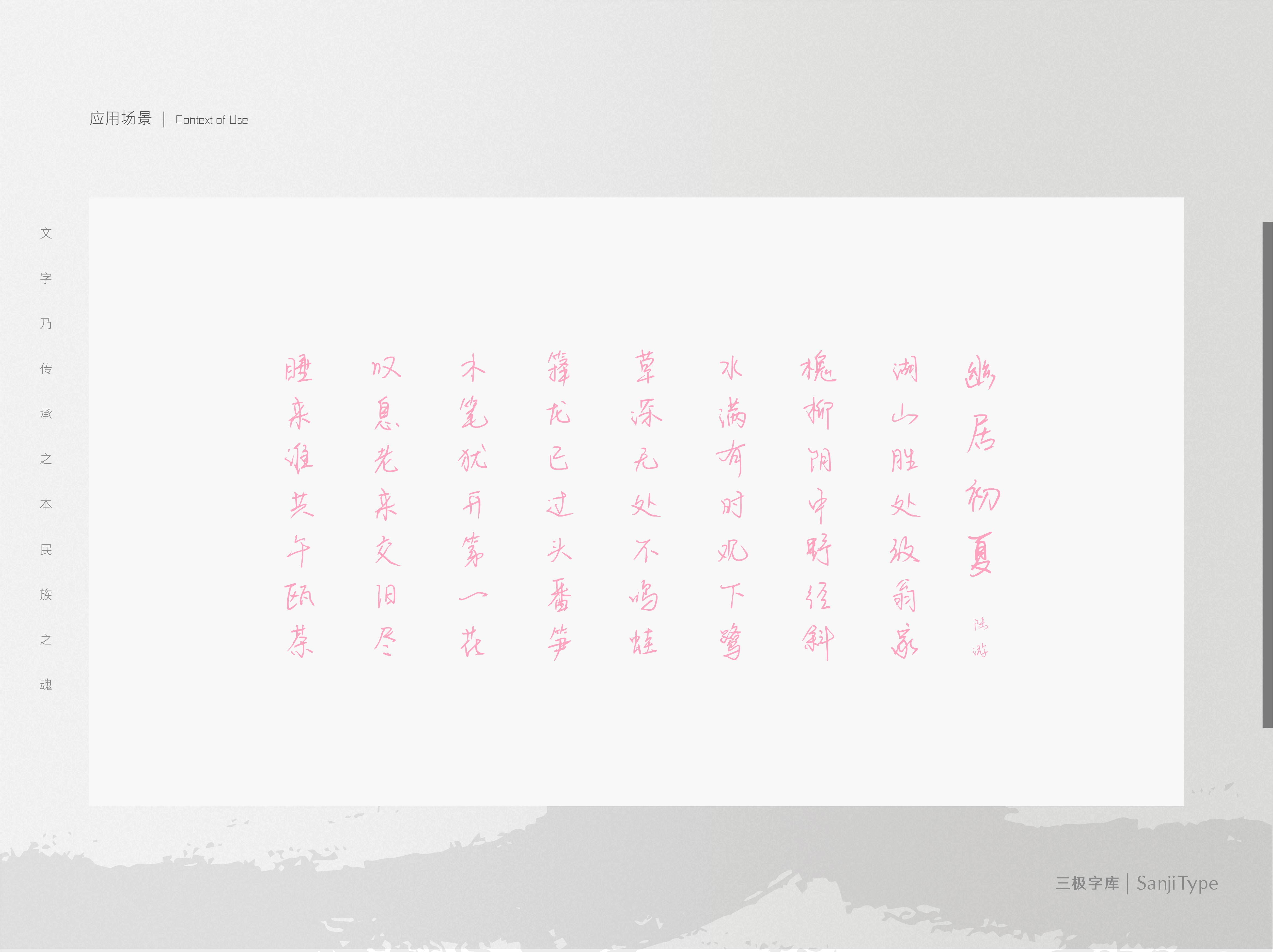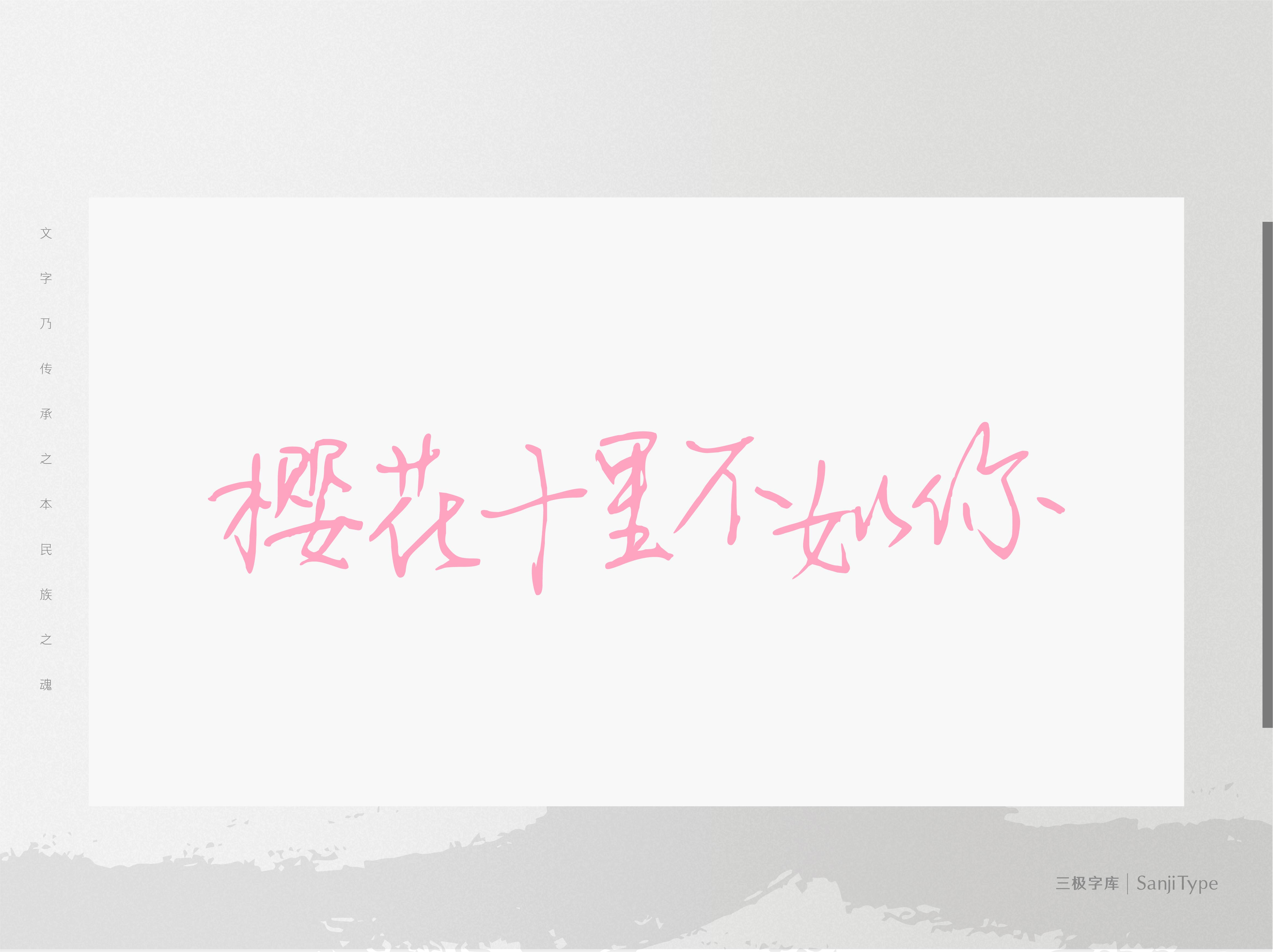樱花十里不如你是一款连笔较多的行楷风格手写体。笔画自然随性,体现字体的速度感和流畅感。适用于文艺类的书刊、品牌广告和产品包装设计,以及社交网络的个性化用字。