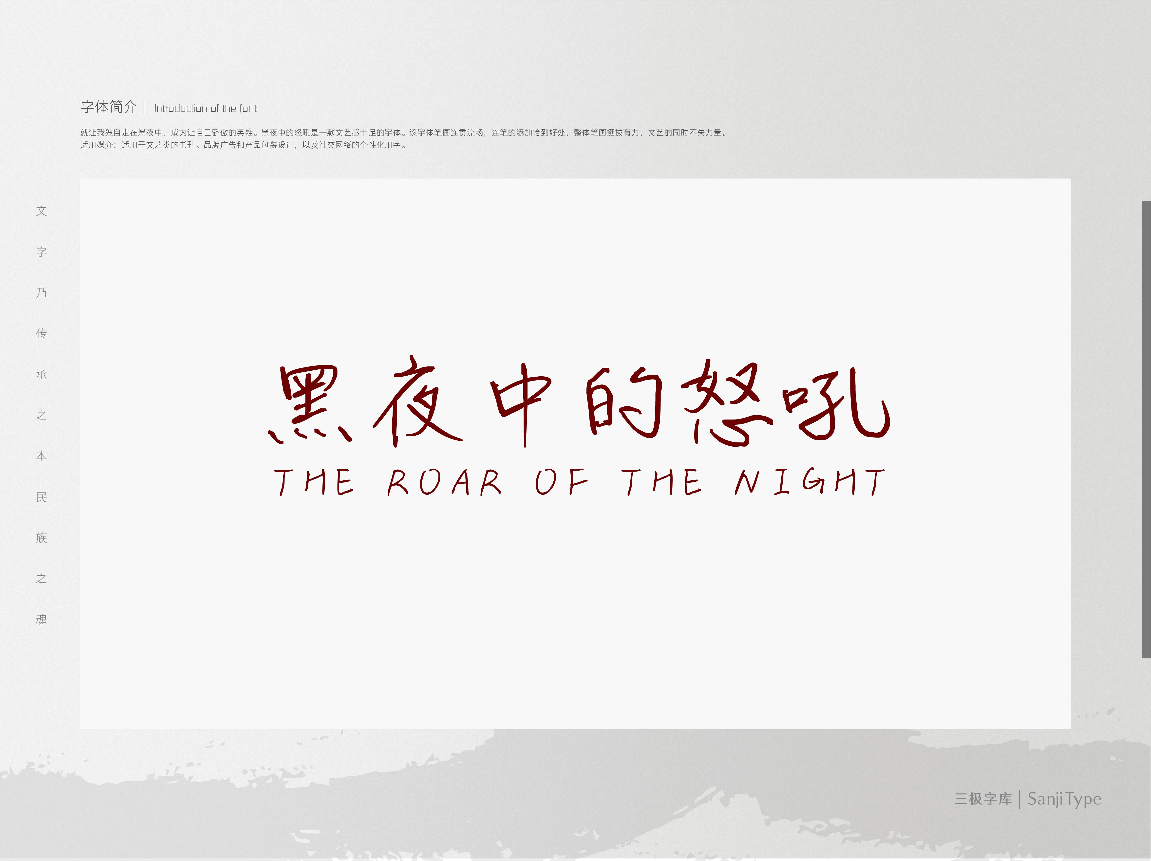 黑夜中的怒吼是一款苍劲有力的字体。该字体笔画连贯流畅,连笔的添加恰到好处,整体笔画挺拔有力,文艺的同时不失力量。适用于文艺类的书刊、品牌广告和产品包装设计,以及社交网络的个性化用字。