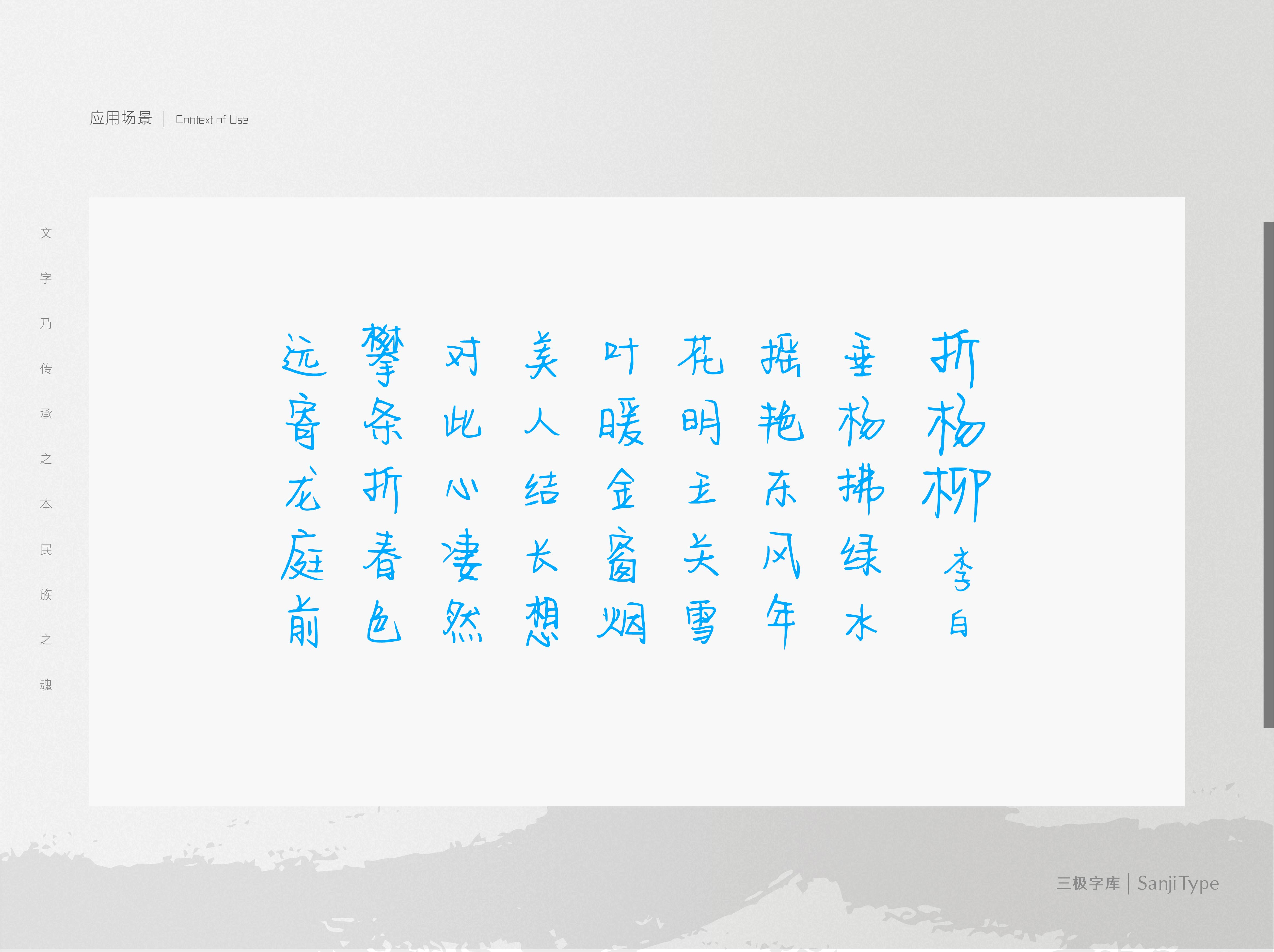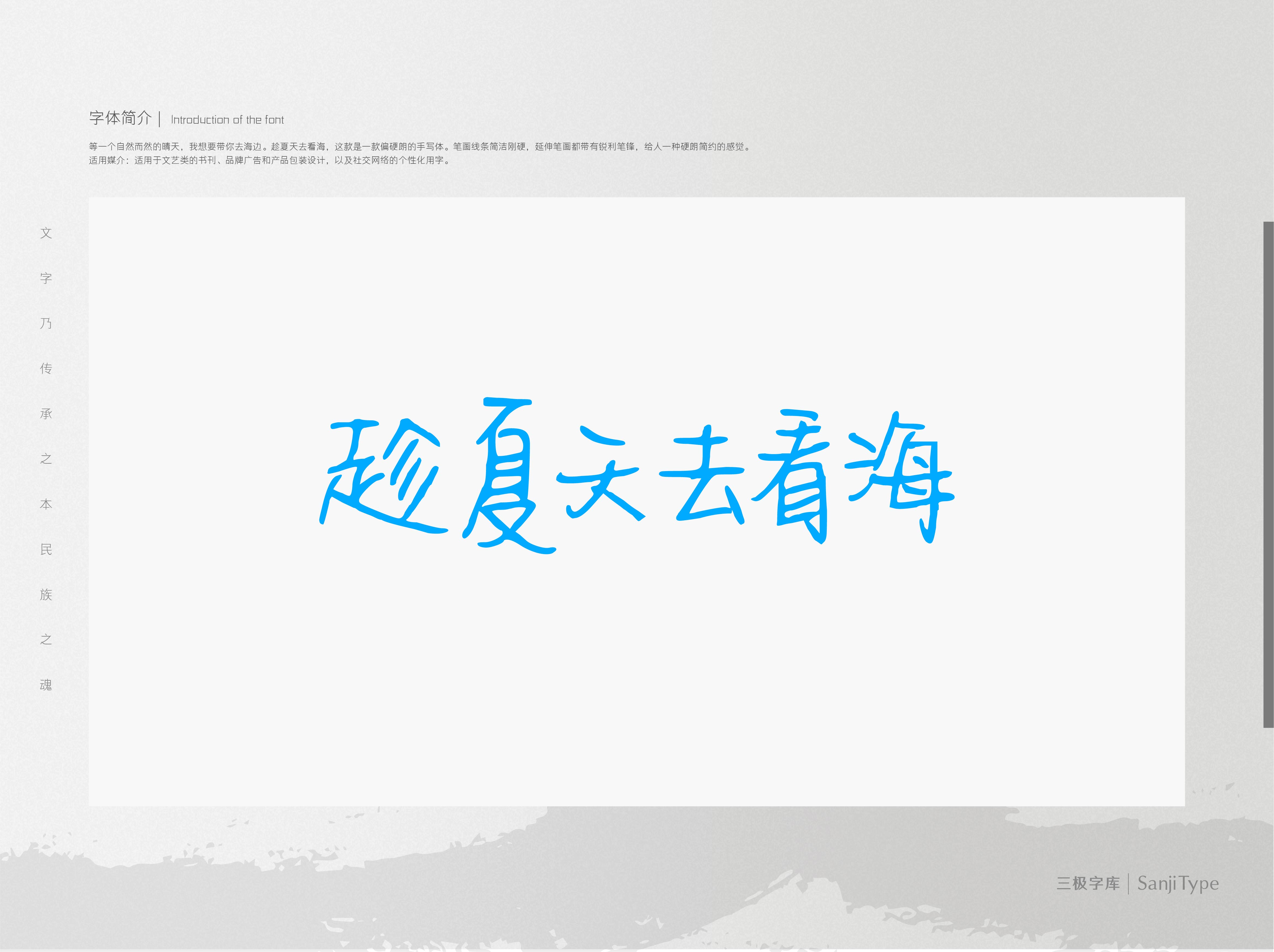 趁夏天去看海,这款是一款偏硬朗的手写体。笔画线条简洁刚硬,延伸笔画都带有锐利笔锋,给人一种硬朗简约的感觉。适用于文艺类的书刊、品牌广告和产品包装设计,以及社交网络的个性化用字。