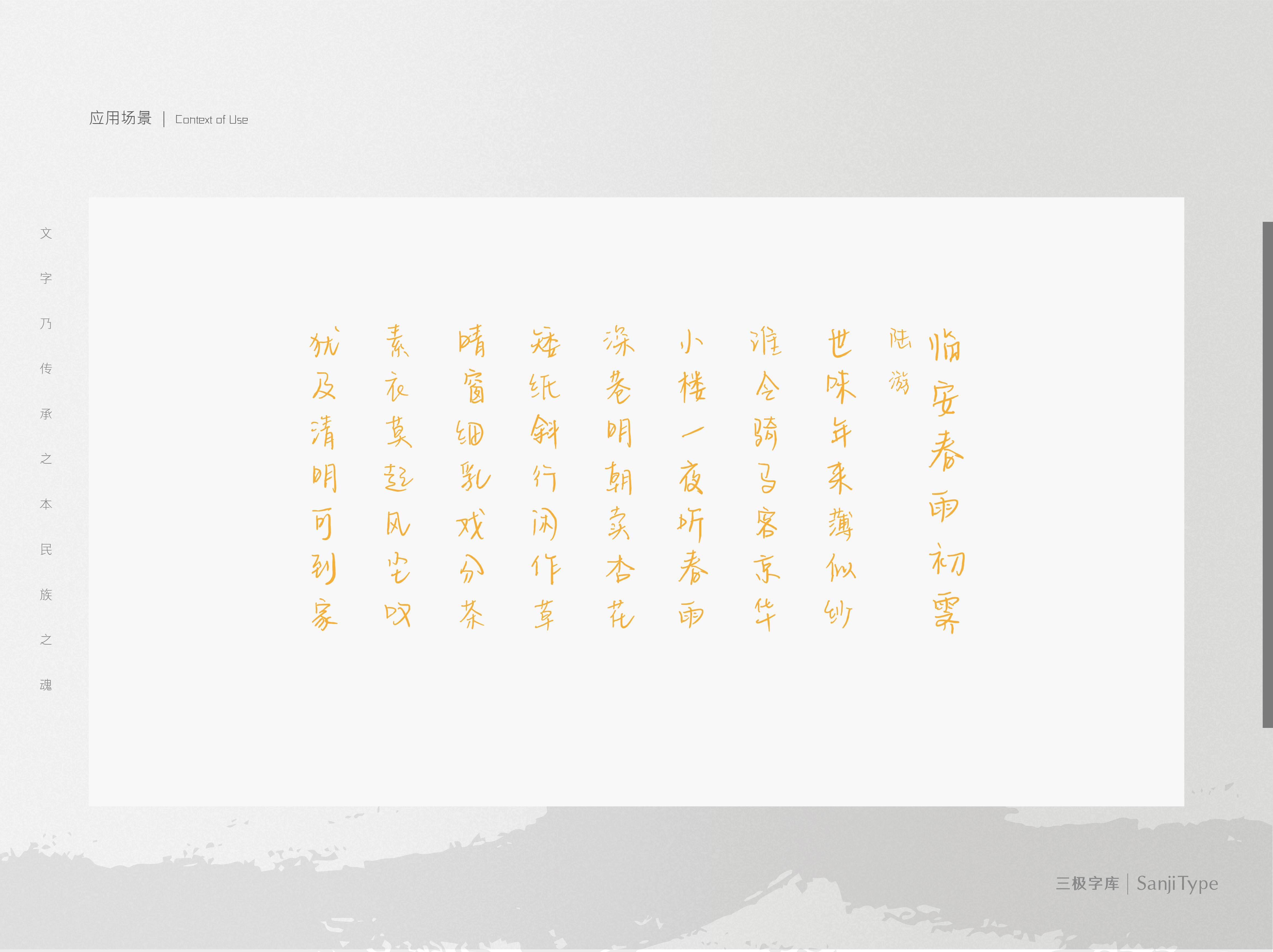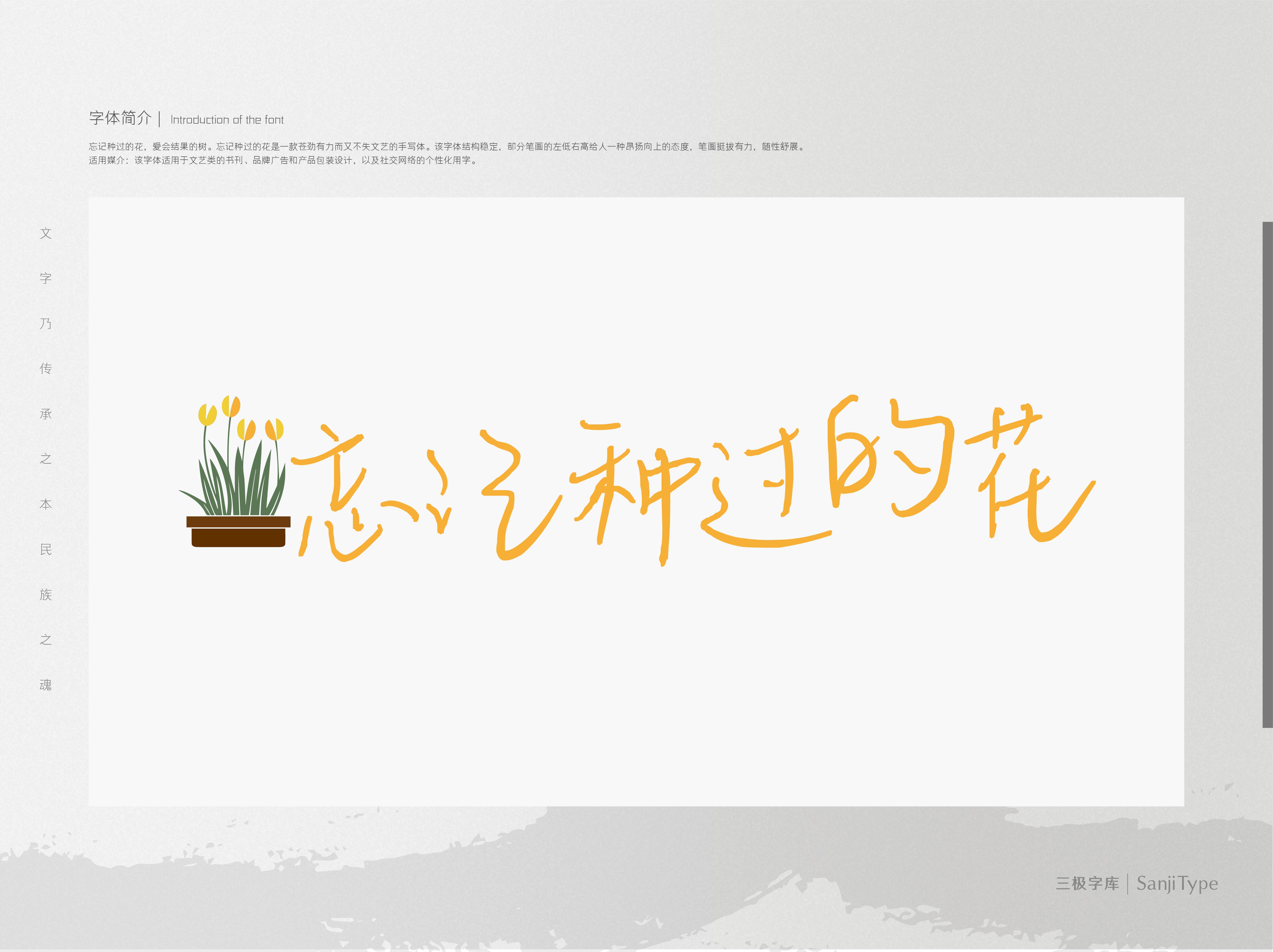 忘记种过的花是一款苍劲有力而又不失文艺的手写体。该字体结构稳定,部分笔画的左低右高给人一种昂扬向上的态度,笔画挺拔有力,随性舒展。该字体适用于文艺类的书刊、品牌广告和产品包装设计,以及社交网络的个性化用字。