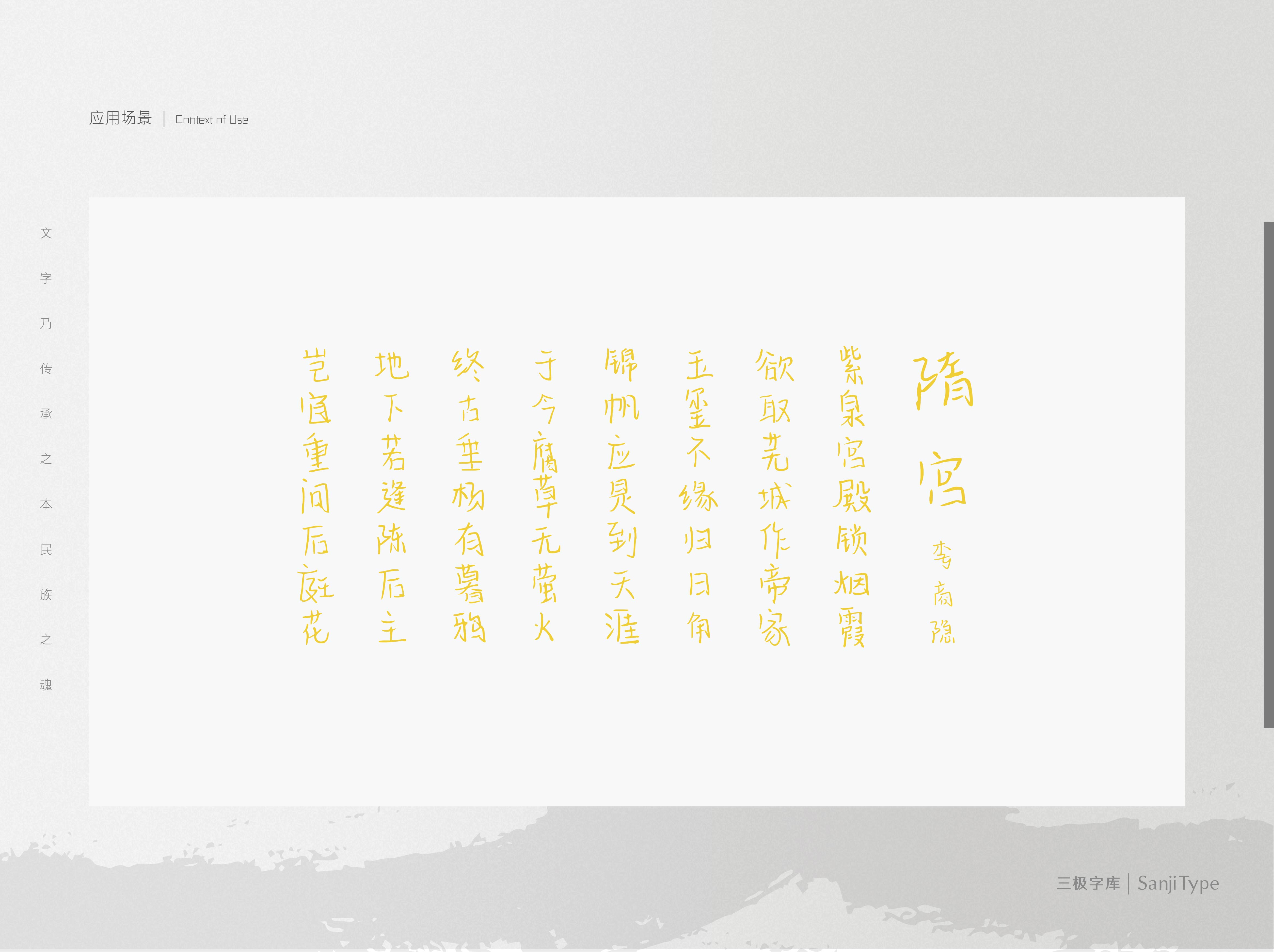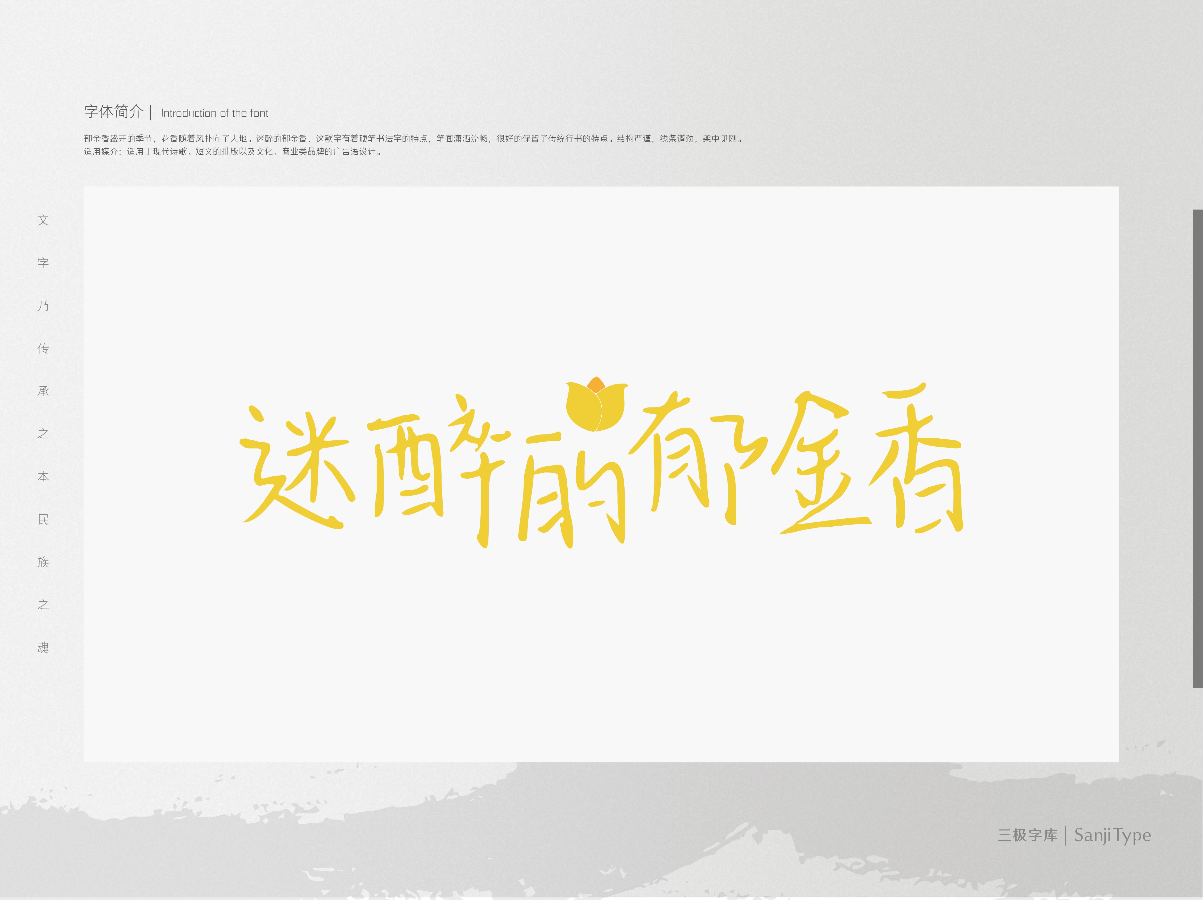 迷醉的郁金香,这款字有着硬笔书法字的特点,笔画潇洒流畅,很好的保留了传统行书的特点。结构严谨,线条遒劲,柔中见刚。适用于现代诗歌、短文的排版以及文化、商业类品牌的广告语设计。