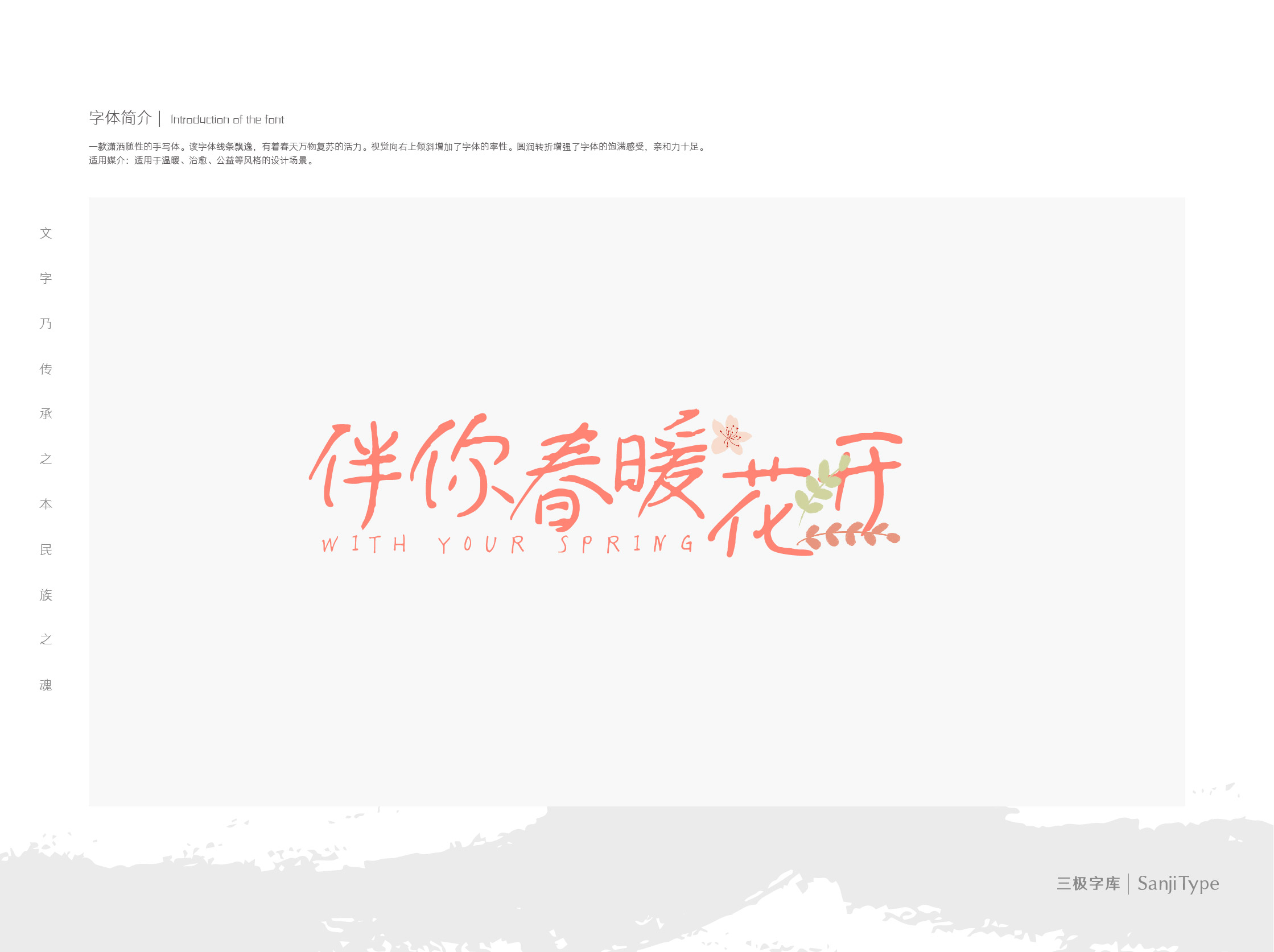 伴你春暖花开是一款潇洒随性的手写体。该字体线条飘逸,有着春天万物复苏的活力。视觉向右上倾斜增加了字体的率性。圆润转折增强了字体的饱满感受,亲和力十足。适用于温暖、治愈、公益等风格的设计场景。