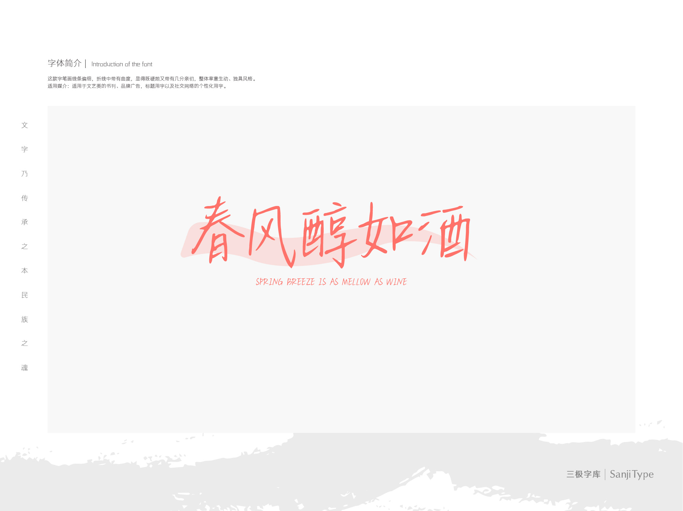 春风醇如酒这款字笔画线条偏细,折线中带有曲度,显得既硬朗又带有几分亲切,整体率意生动、独具风格。适用于文艺类的书刊、品牌广告,标题用字以及社交网络的个性化用字。