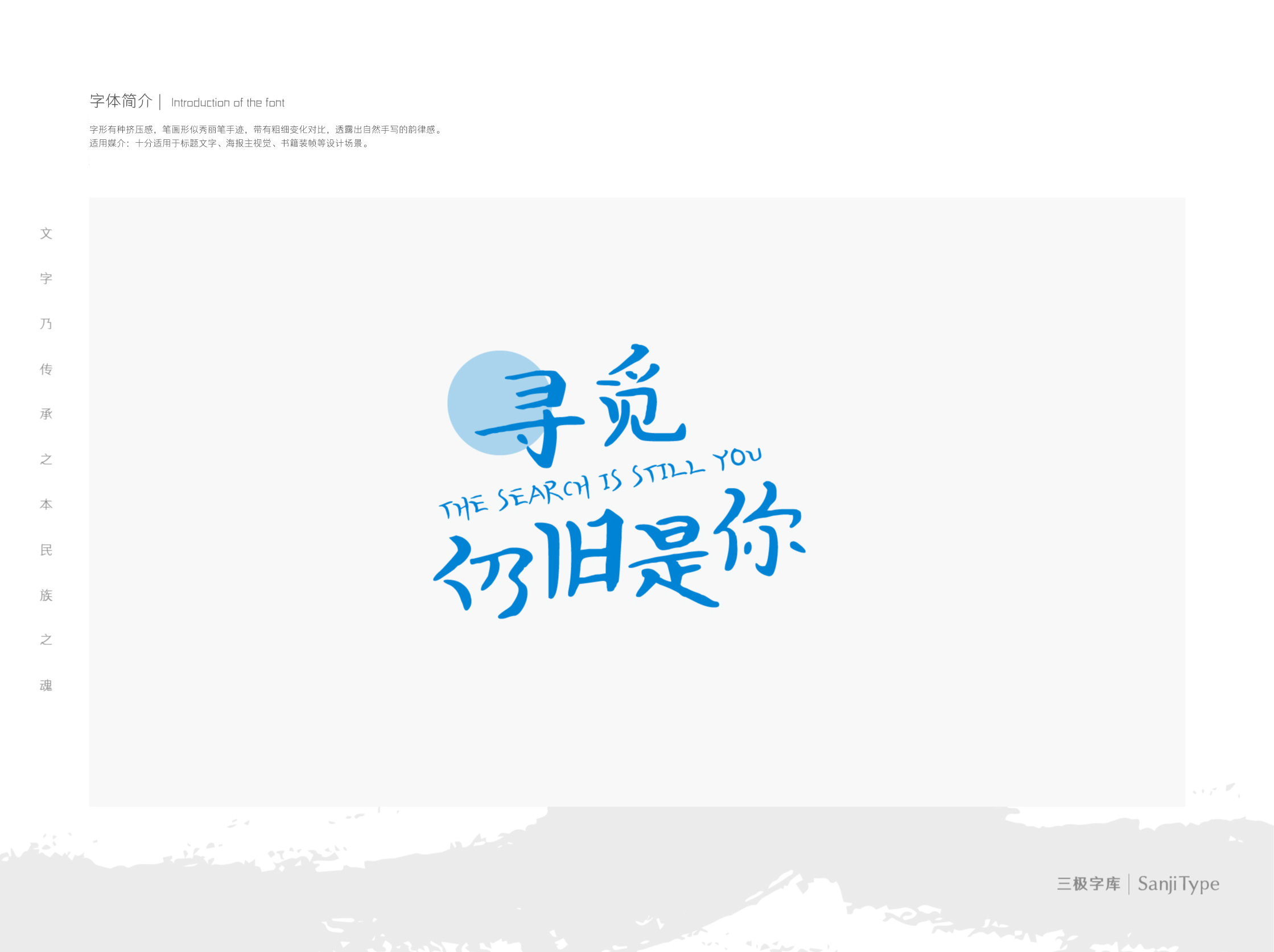 “寻觅依旧是你”的字形有种挤压感,笔画形似秀丽笔手迹,带有粗细变化对比,透露出自然手写的韵律感。十分适用于标题文字、海报主视觉、书籍装帧等设计场景。