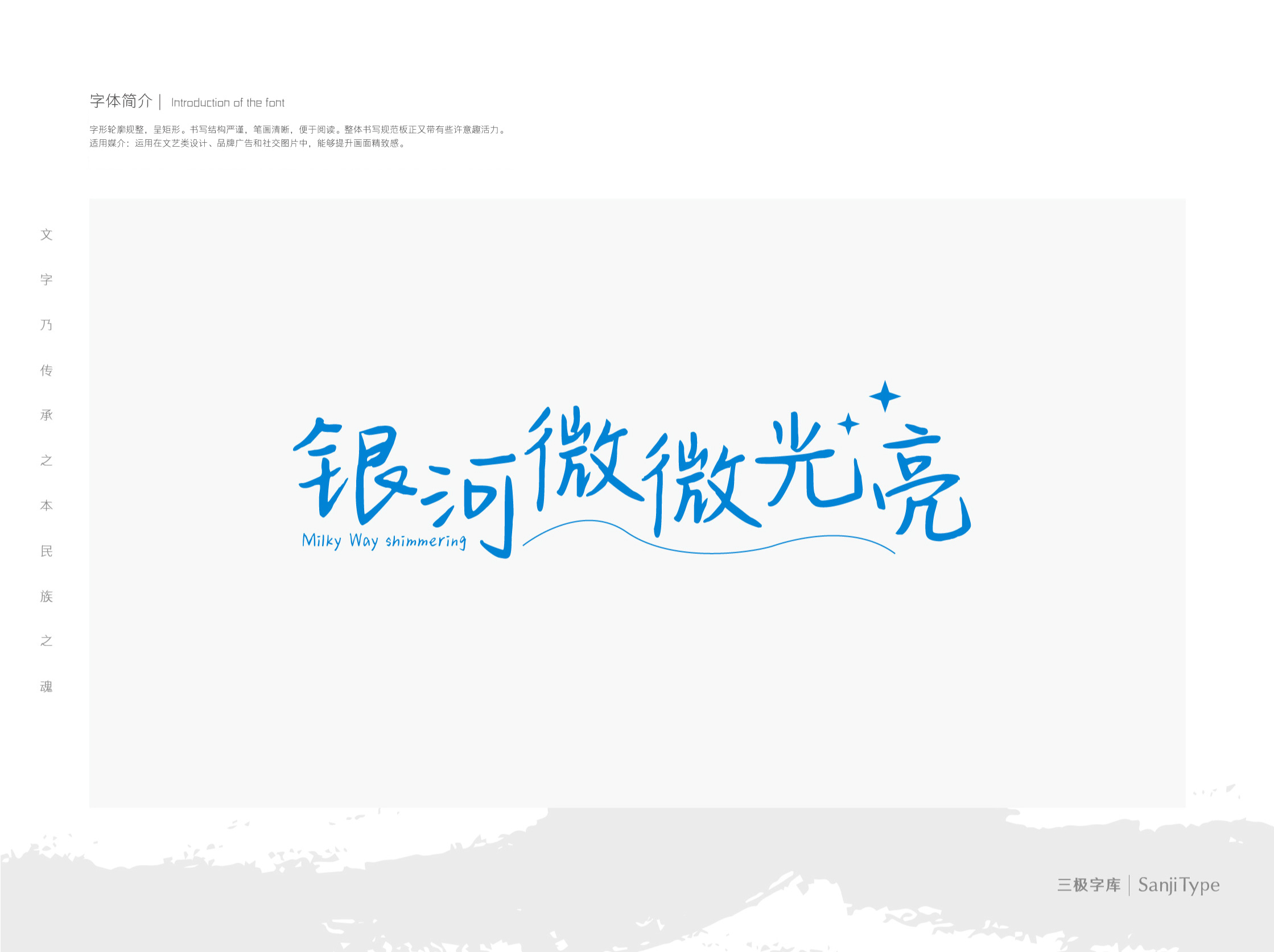 银河微微光亮的字形轮廓规整,呈矩形。书写结构严谨,笔画清晰,便于阅读。整体书写规范板正又带有些许意趣活力。运用在文艺类设计、品牌广告和社交图片中,能够提升画面精致感。