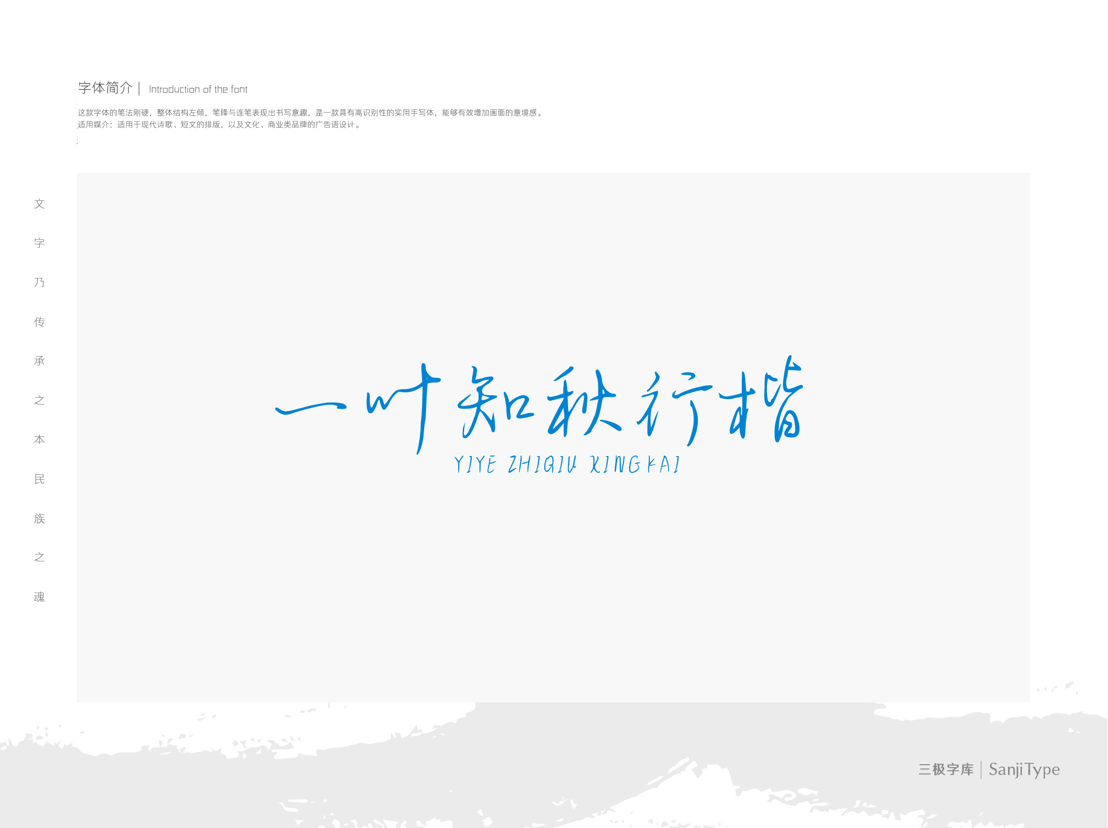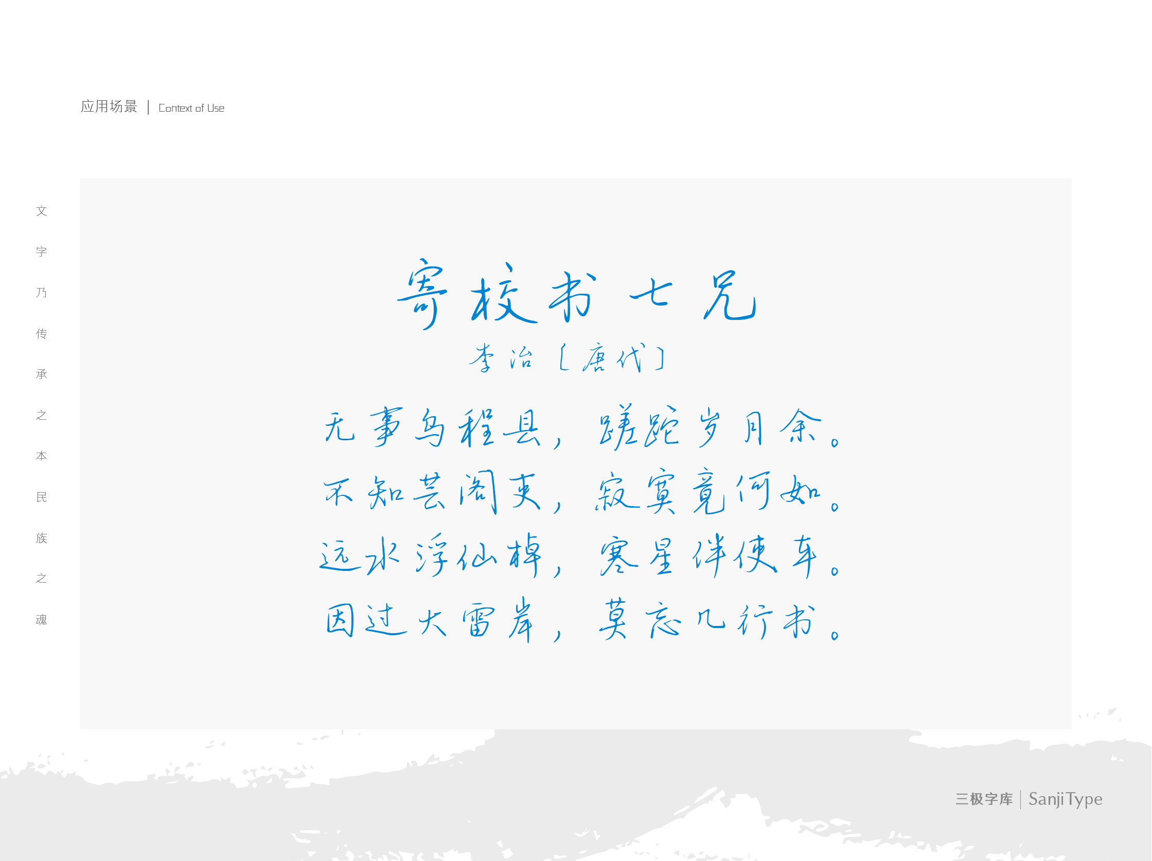 这款字体的笔法刚硬,整体结构左倾,笔锋与连笔表现出书写意趣,是一款具有高识别性的实用手写体,能够有效增加画面的意境感。适用于现代诗歌、短文的排版,以及文化、商业类品牌的广告语设计。