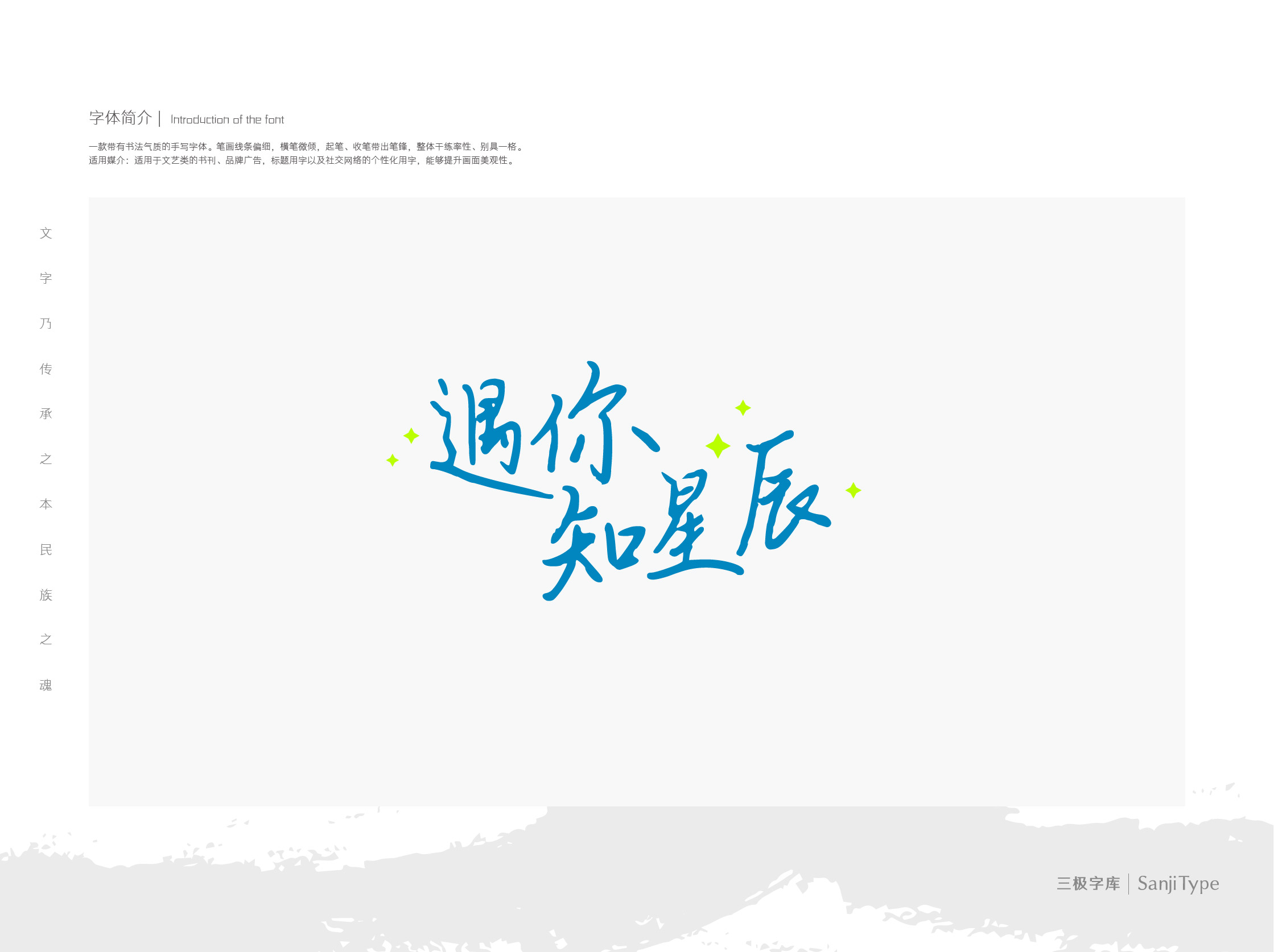 遇你知星辰是一款带有书法气质的手写字体。笔画线条偏细,横笔微倾,起笔、收笔带出笔锋,整体干练率性、别具一格。适用于文艺类的书刊、品牌广告,标题用字以及社交网络的个性化用字,能够提升画面美观性。