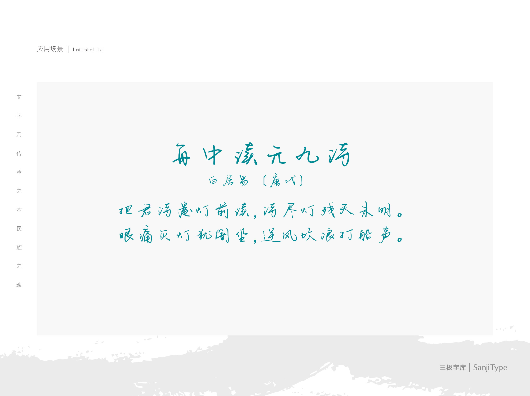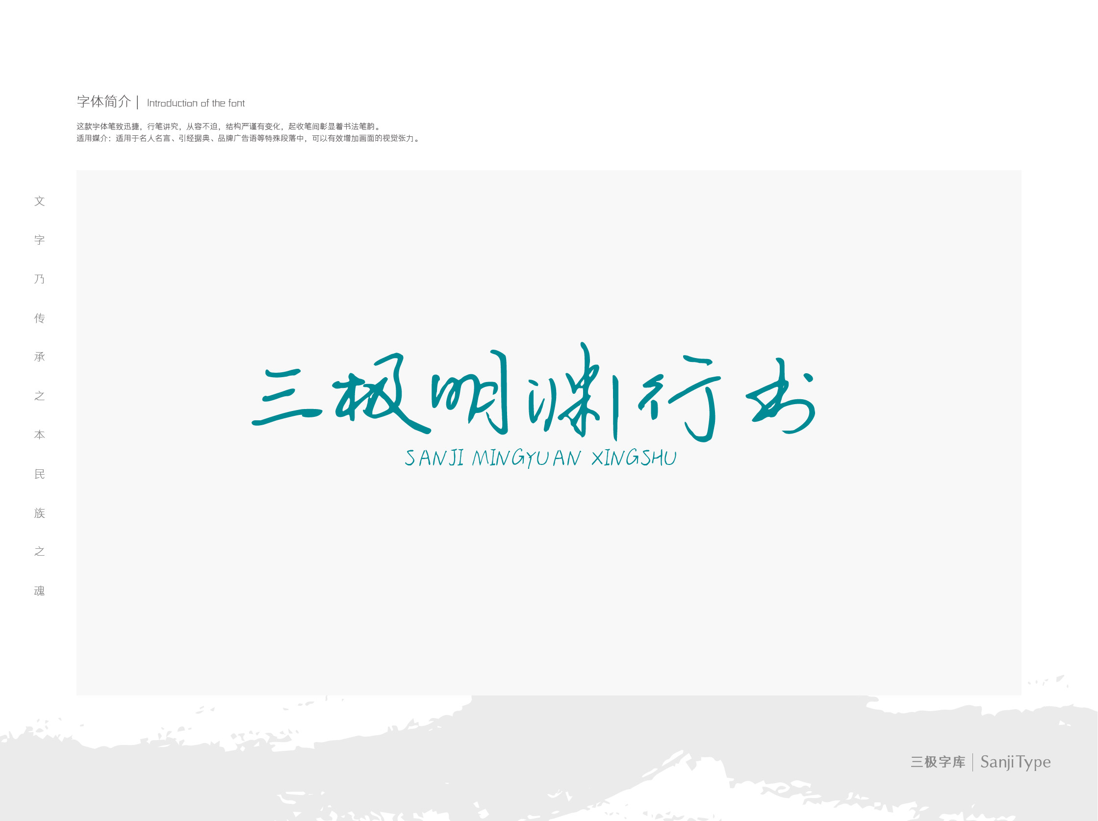 三极明渊行书这款字体笔致迅捷,行笔讲究,从容不迫,结构严谨有变化,起收笔间彰显着书法笔韵。适用于名人名言、引经据典、品牌广告语等特殊段落中,可以有效增加画面的视觉张力。