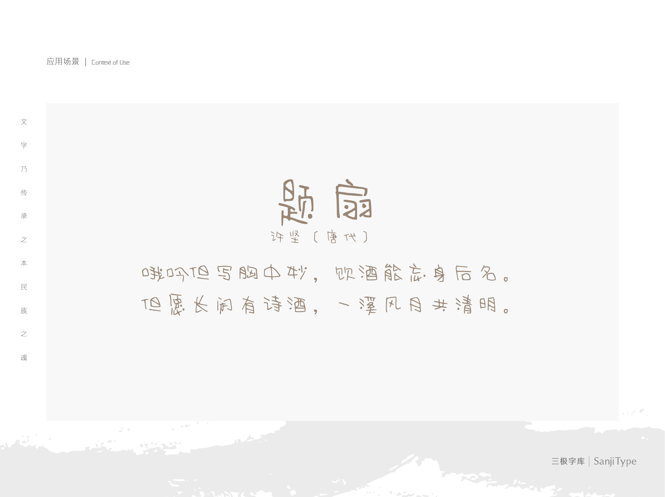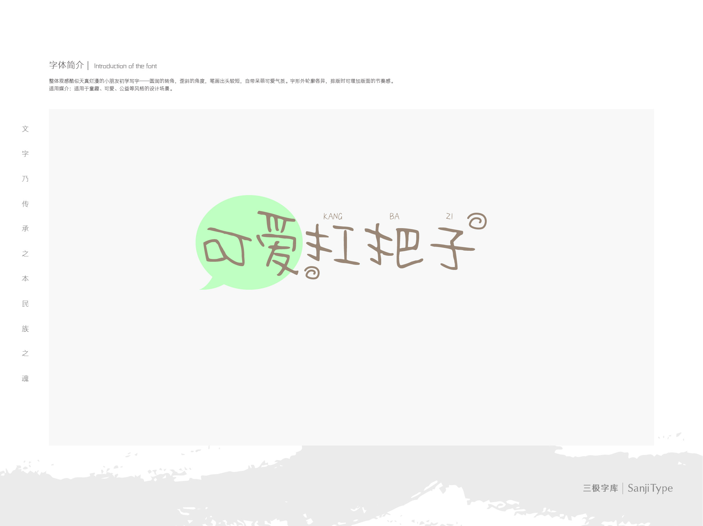 “可爱扛把子”的整体观感酷似天真烂漫的小朋友初学写字——圆润的转角,歪斜的角度,笔画出头较短,自带呆萌可爱气质。字形外轮廓各异,排版时可增加版面的节奏感。适用于童趣、可爱、公益等风格的设计场景。
