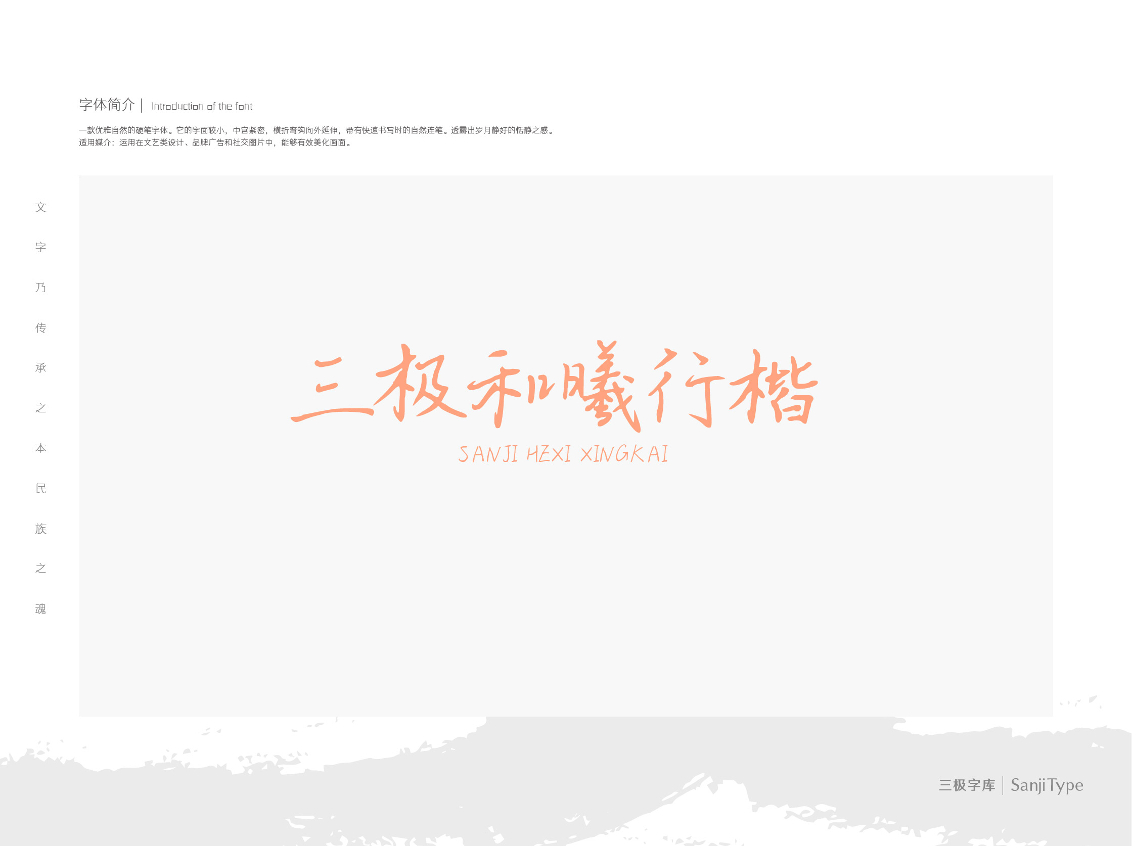 三极和曦行楷是一款优雅自然的硬笔字体。它的字面较小,中宫紧密,横折弯钩向外延伸,带有快速书写时的自然连笔。透露出岁月静好的恬静之感。运用在文艺类设计、品牌广告和社交图片中,能够有效美化画面。