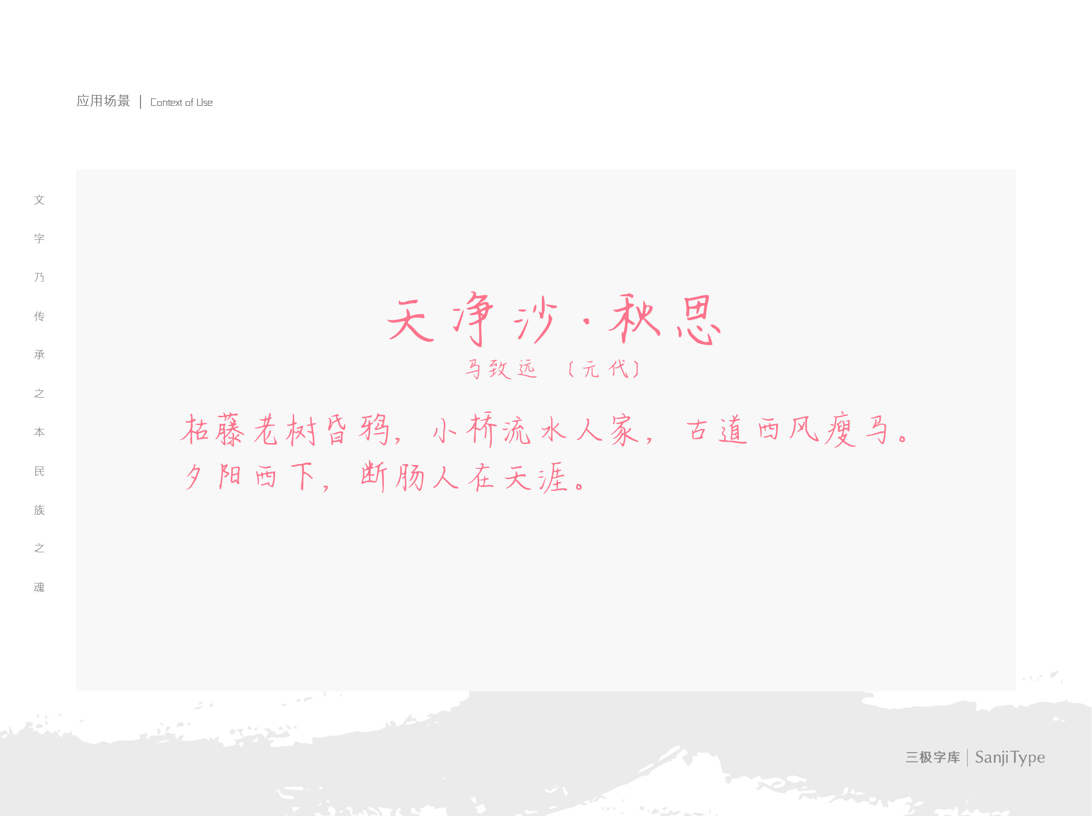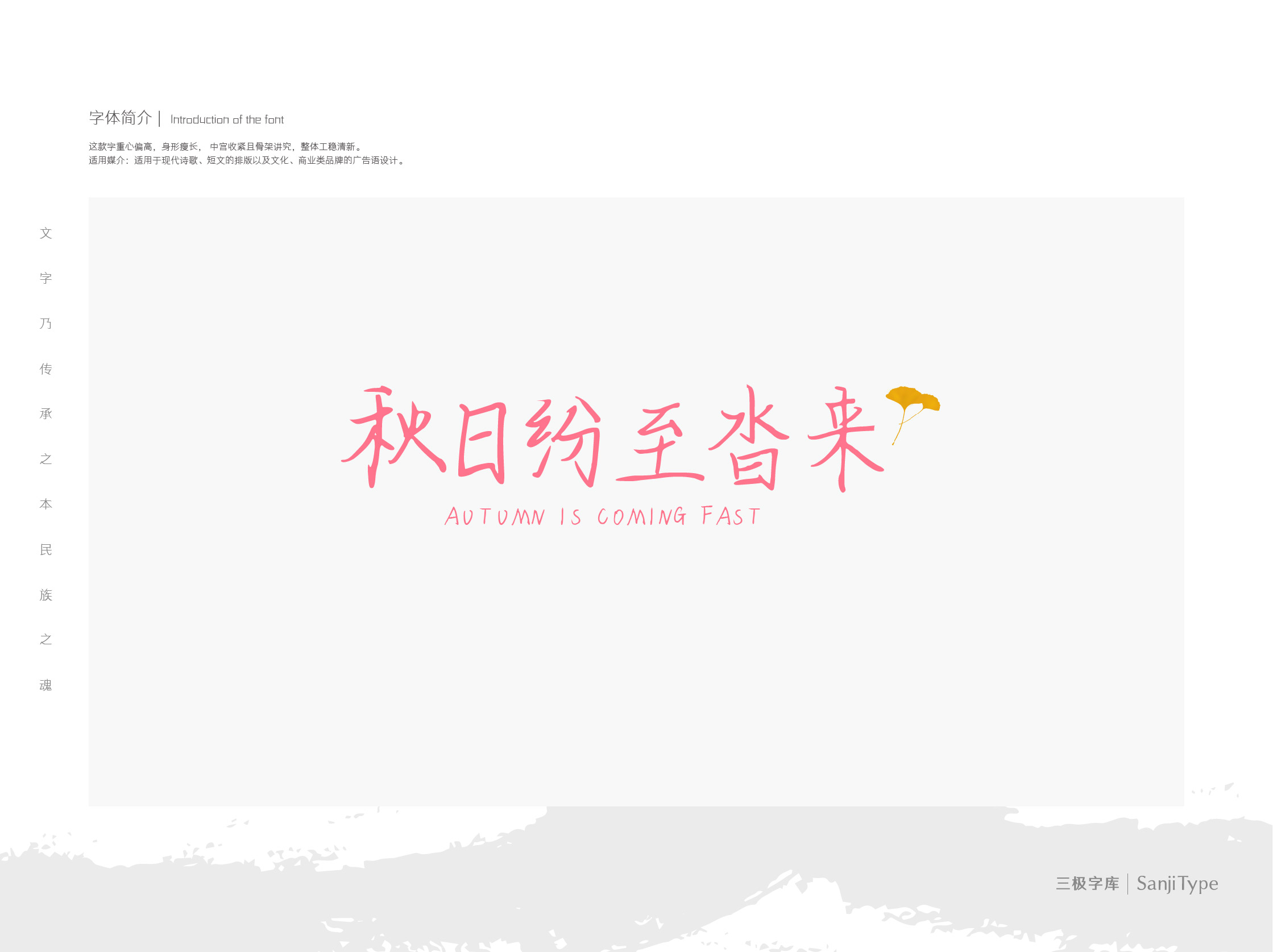 秋日纷至沓来这款字重心偏高,身形瘦长, 中宫收紧且骨架讲究,整体工稳清新。适用于现代诗歌、短文的排版以及文化、商业类品牌的广告语设计。