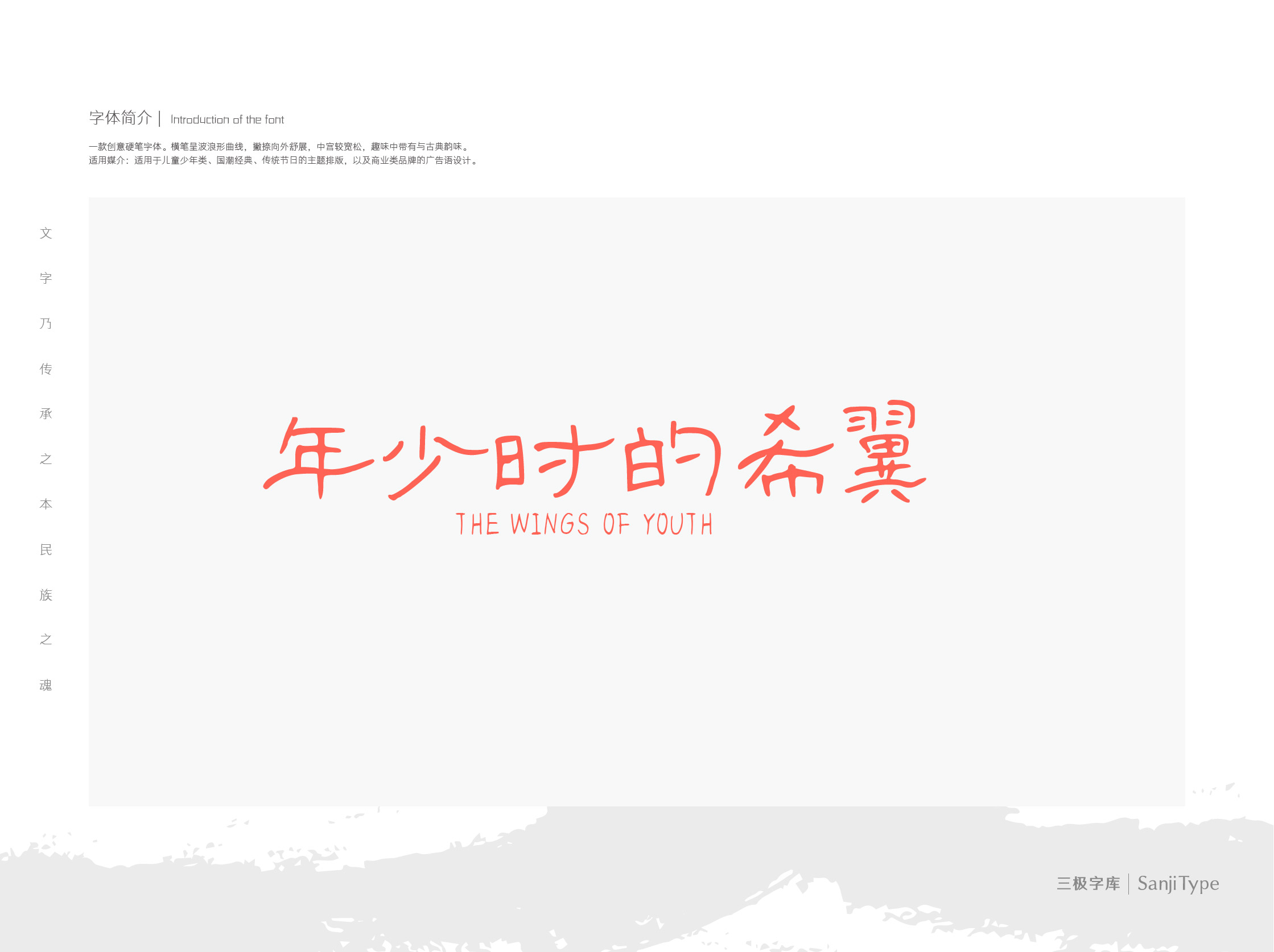 年少时的希翼是一款创意硬笔字体。横笔呈波浪形曲线,撇捺向外舒展,中宫较宽松,趣味中带有与古典韵味。适用于儿童少年类、国潮经典、传统节日的主题排版,以及商业类品牌的广告语设计。