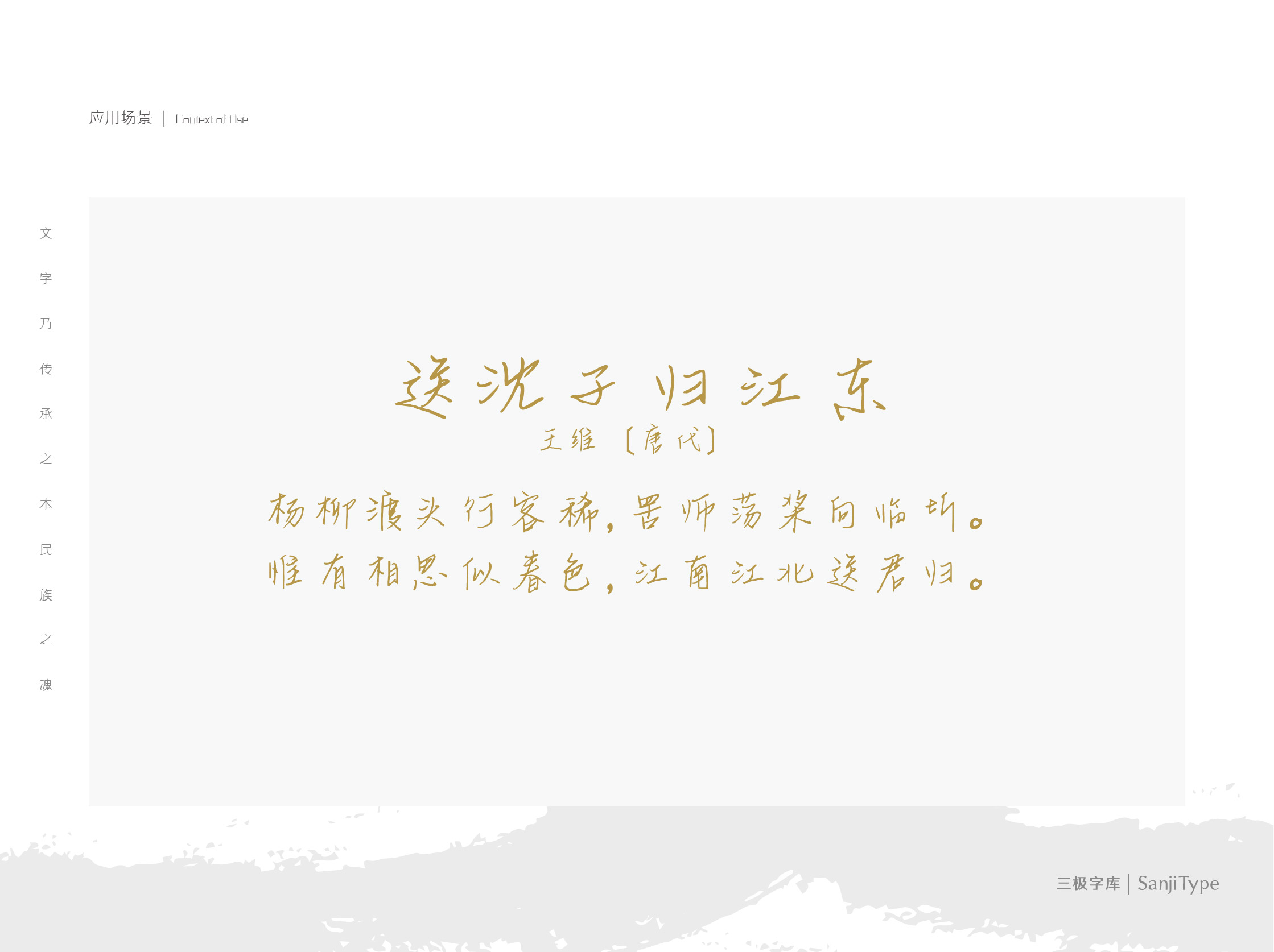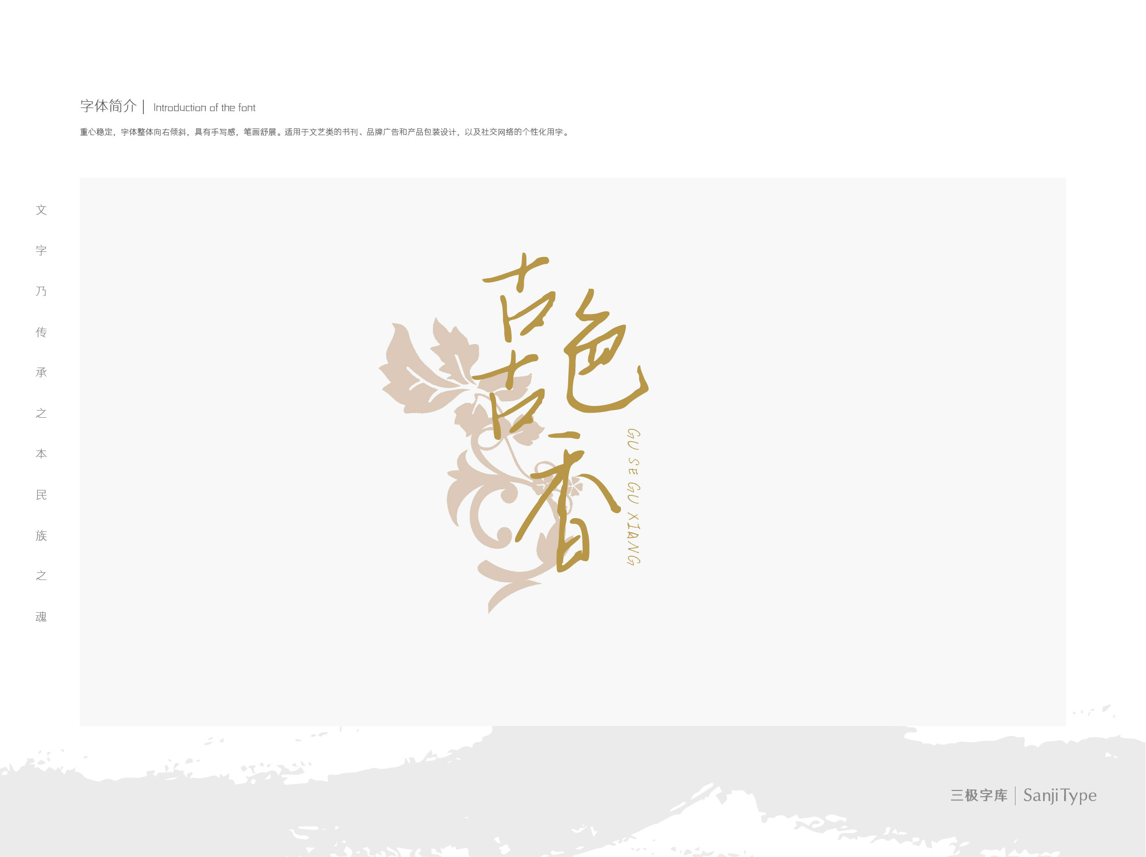 重心稳定,字体整体向右倾斜,具有手写感,笔画舒展。适用于文艺类的书刊、品牌广告和产品包装设计,以及社交网络的个性化用字。