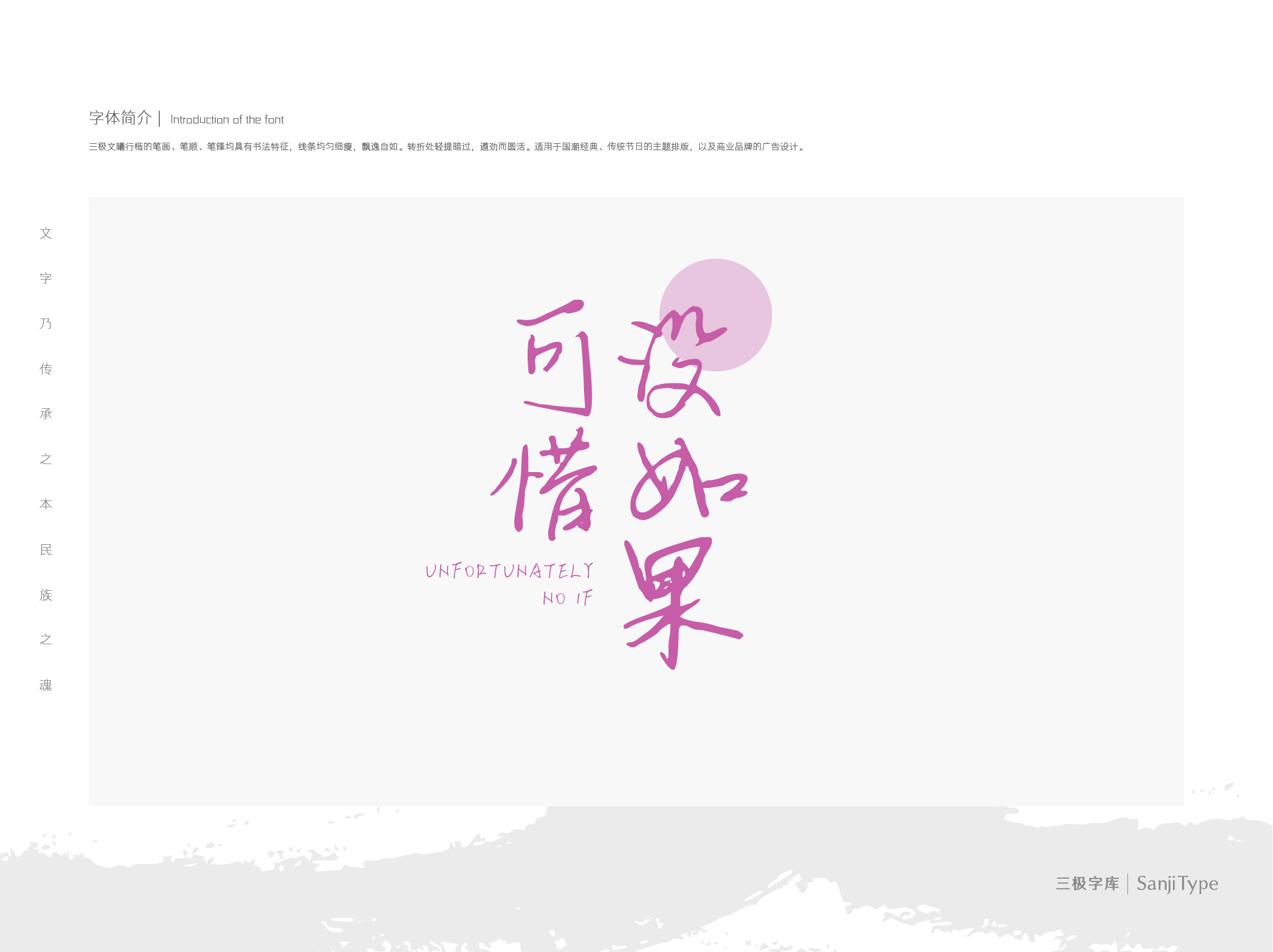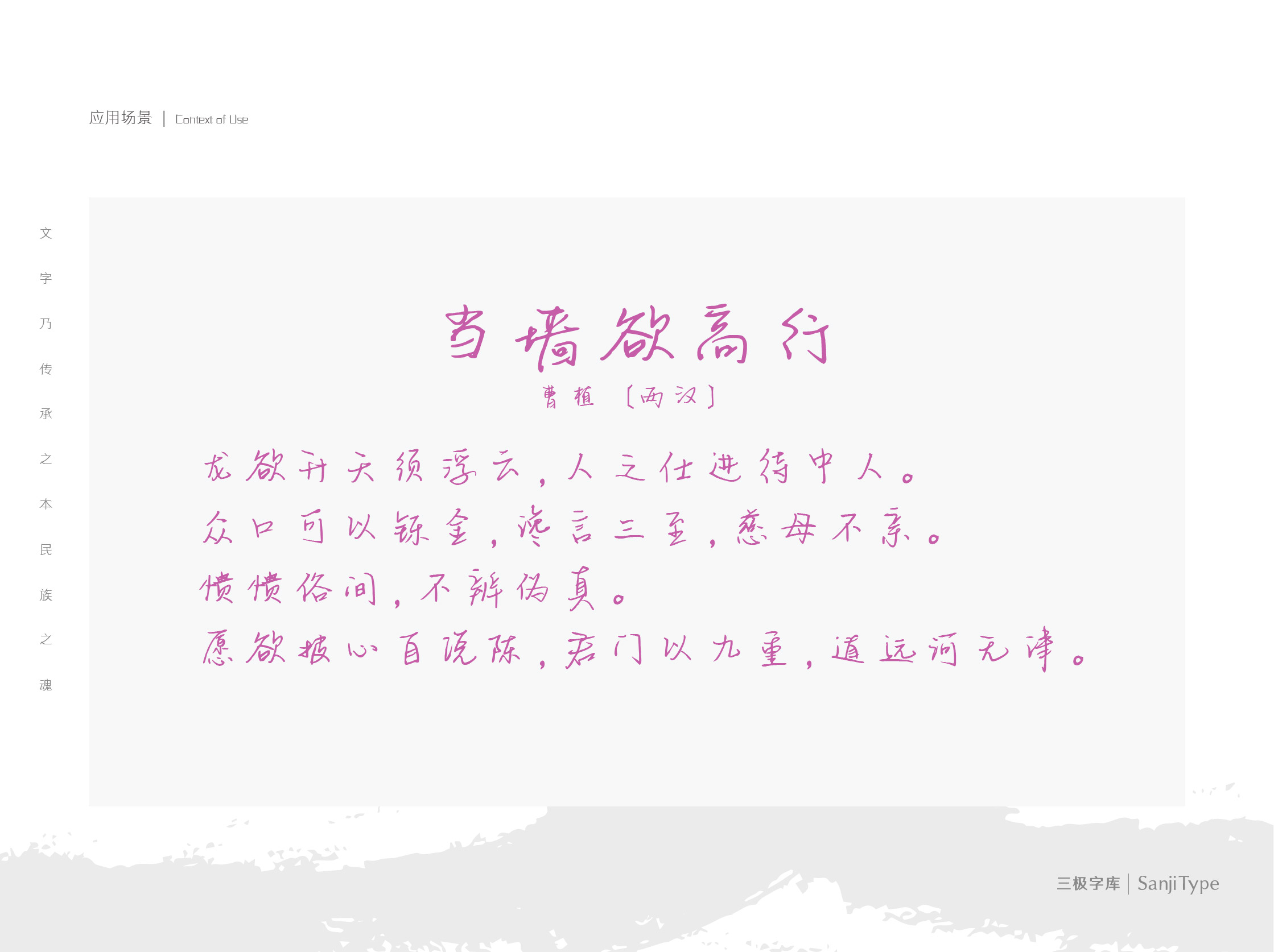 三极文曦行楷的笔画、笔顺、笔锋均具有书法特征,线条均匀细瘦,飘逸自如。转折处轻提暗过,遒劲而圆活。适用于国潮经典、传统节日的主题排版,以及商业品牌的广告设计。