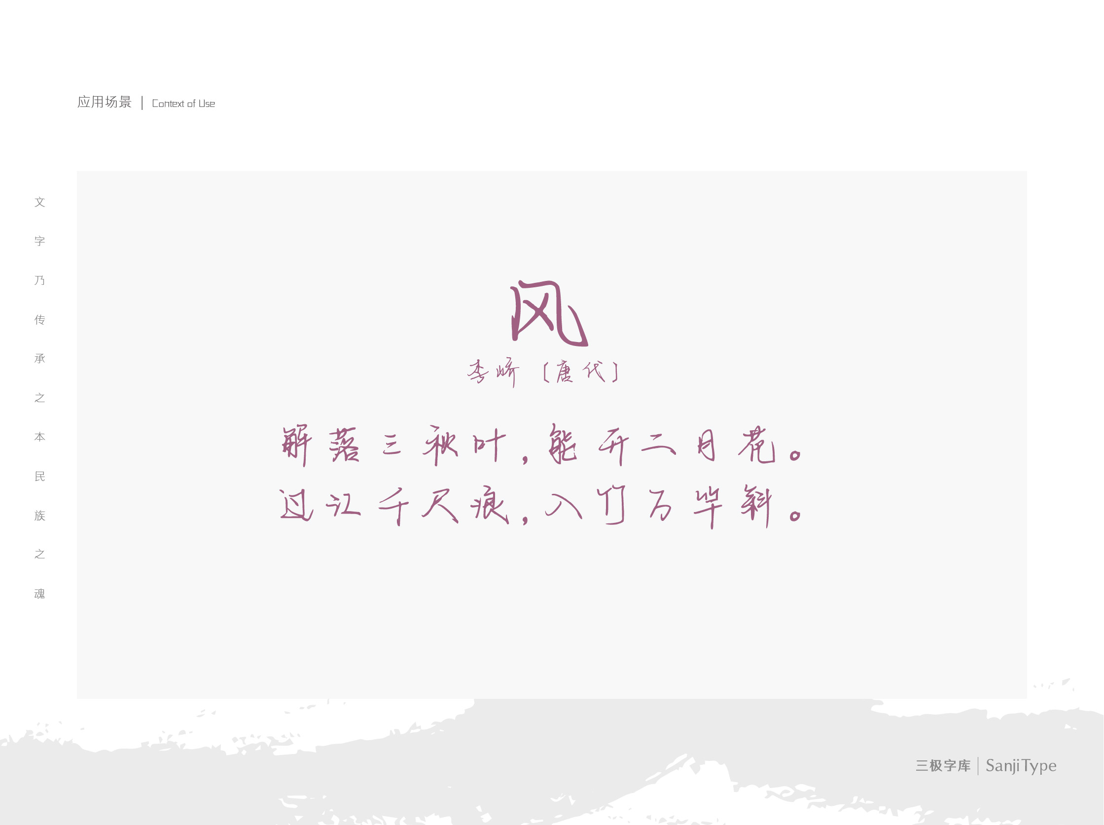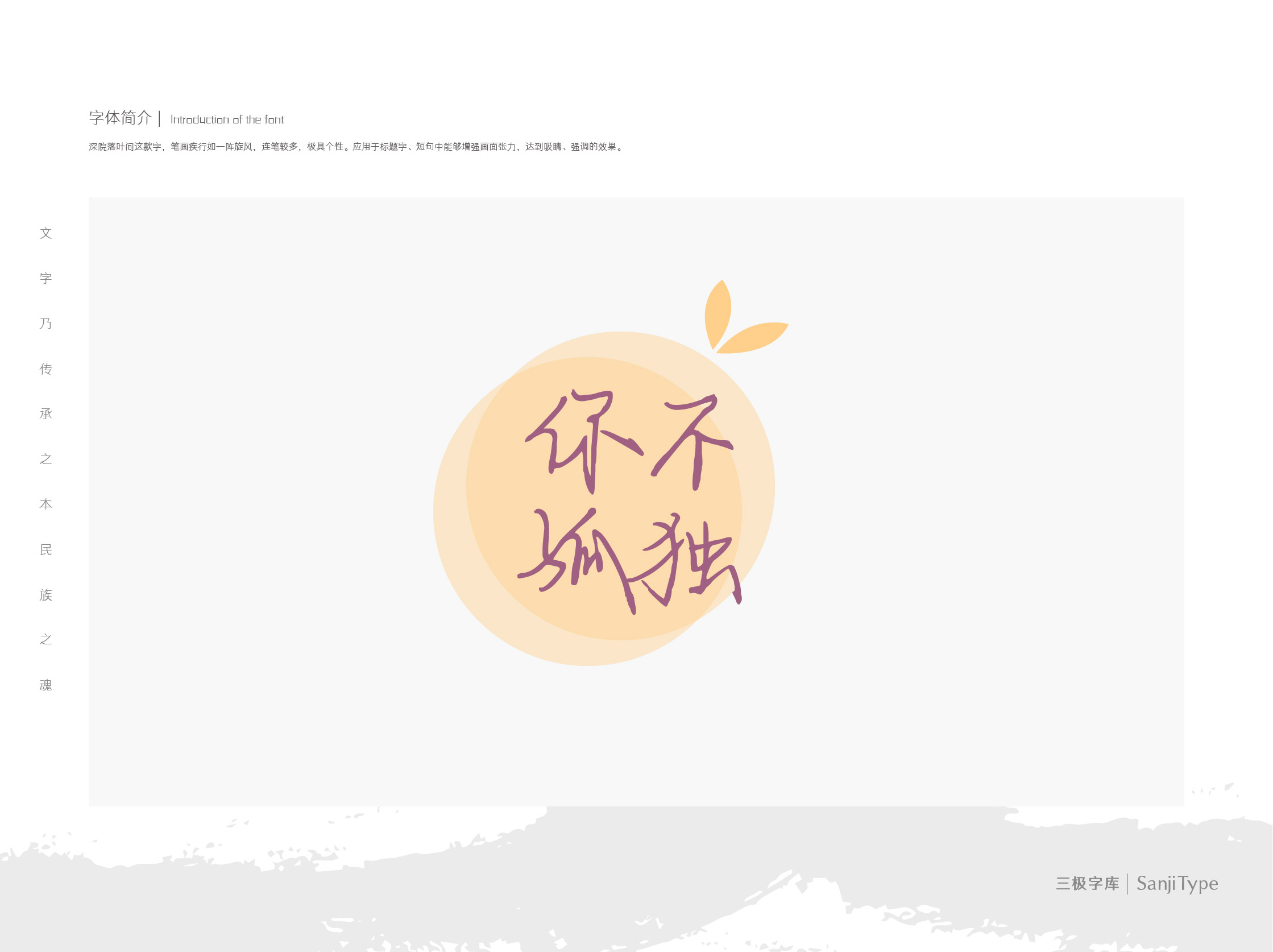 深院落叶间这款字,笔画疾行如一阵旋风,连笔较多,极具个性。应用于标题字、短句中能够增强画面张力,达到吸睛、强调的效果。