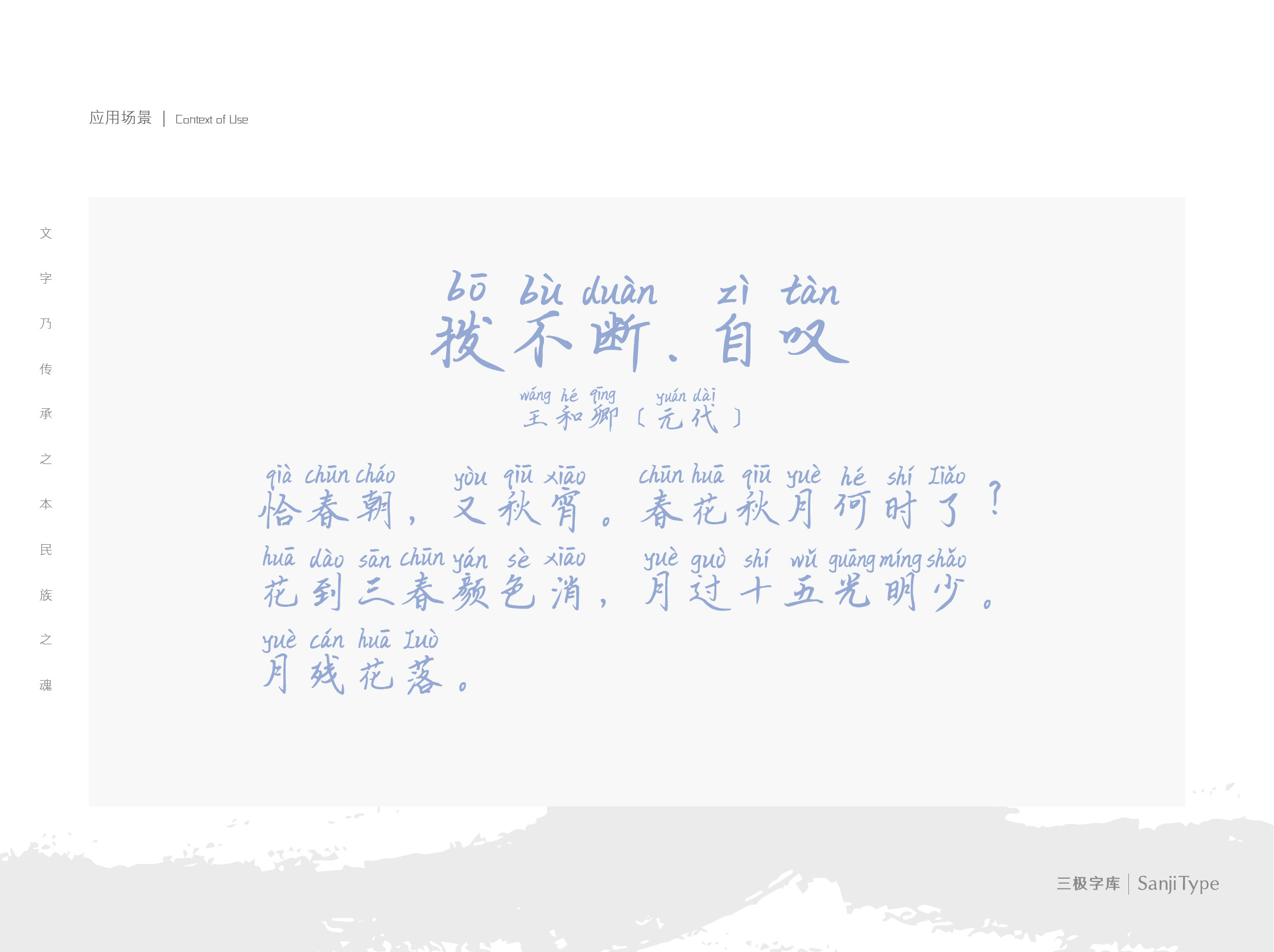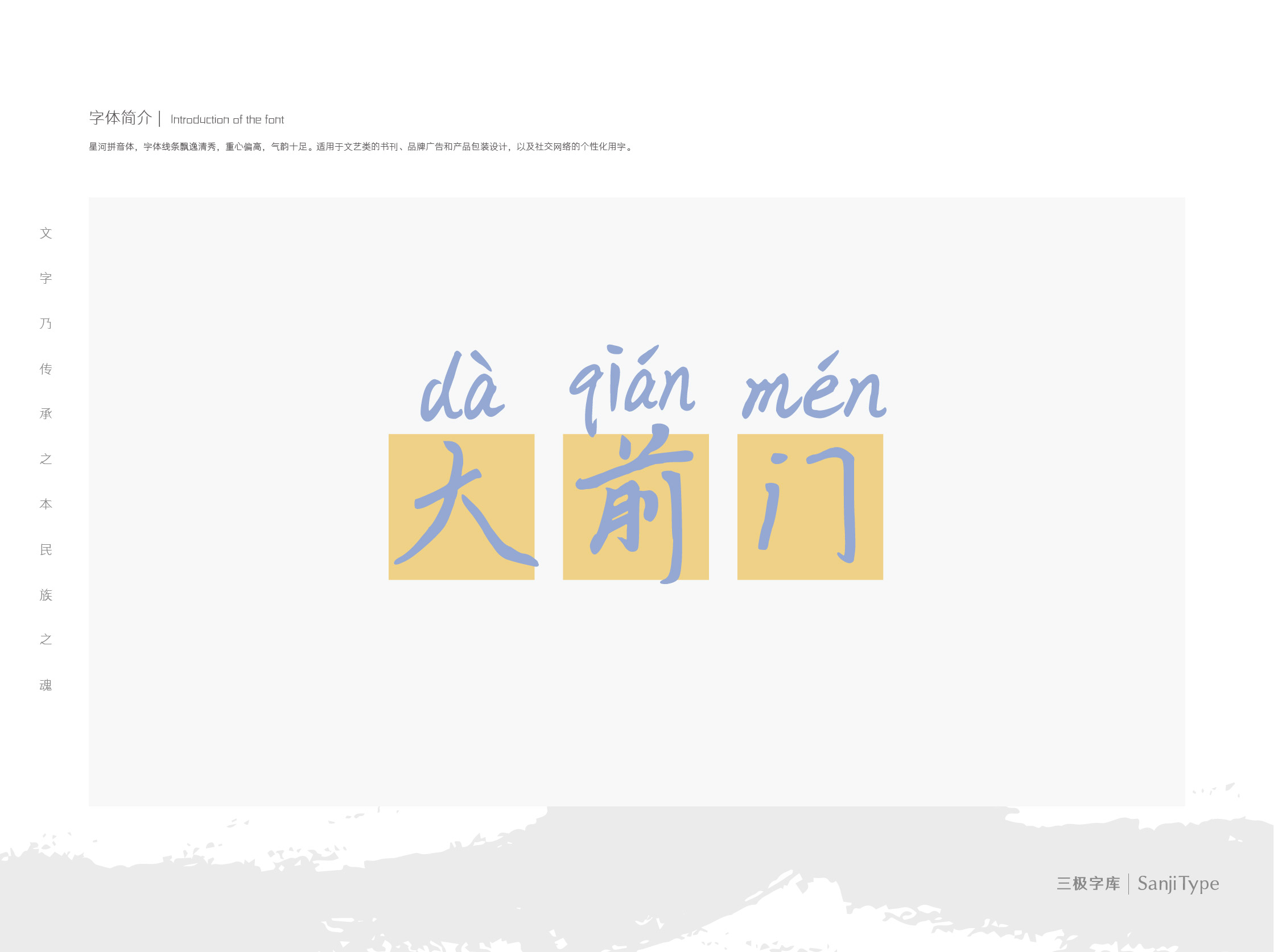 星河拼音体,字体线条飘逸清秀,重心偏高,气韵十足。适用于文艺类的书刊、品牌广告和产品包装设计,以及社交网络的个性化用字。
