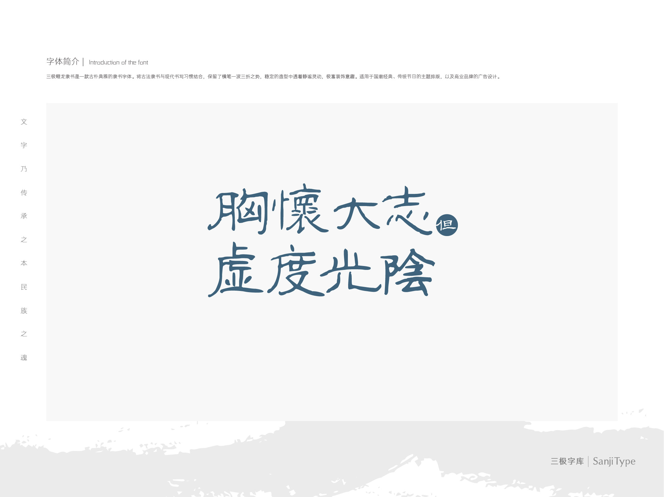 三极鲤龙隶书是一款古朴典雅的隶书字体。将古法隶书与现代书写习惯结合,保留了横笔一波三折之势,稳定的造型中透着静谧灵动,极富装饰意趣。适用于国潮经典、传统节日的主题排版,以及商业品牌的广告设计。
