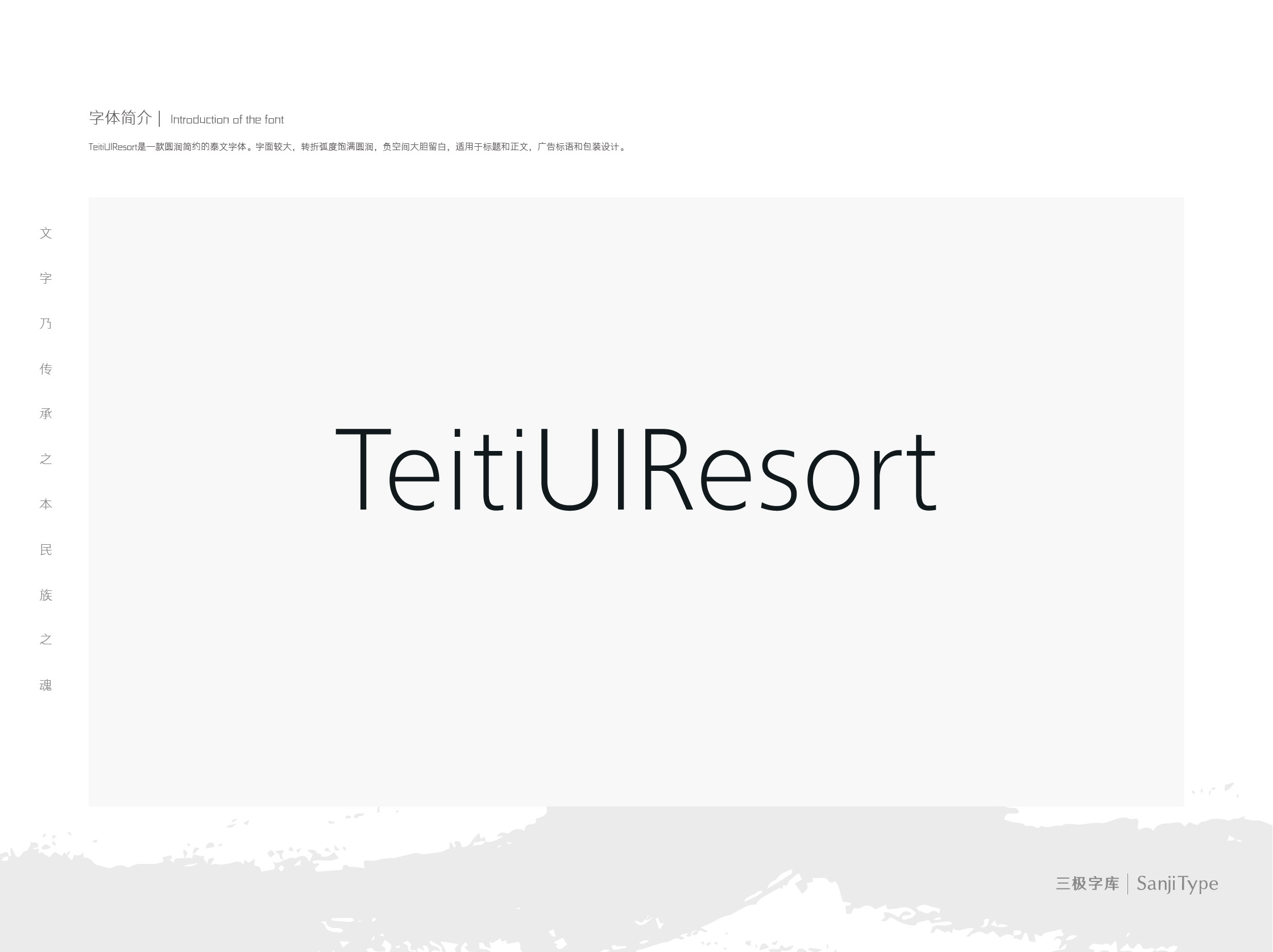 TeitiUIResort是一款圆润简约的泰文、英文字体。字面较大,转折弧度饱满圆润,负空间大胆留白,适用于标题和正文,广告标语和包装设计。