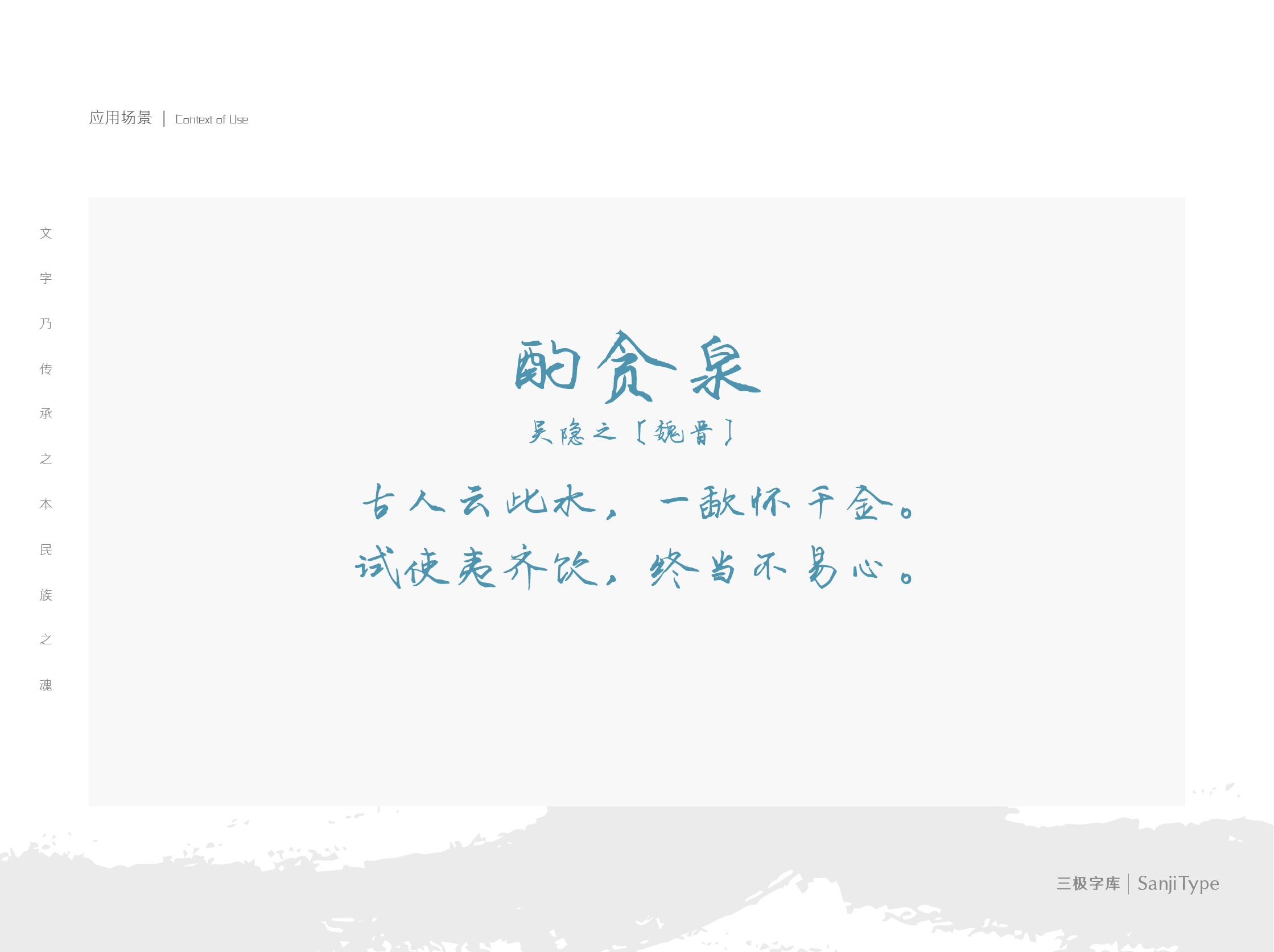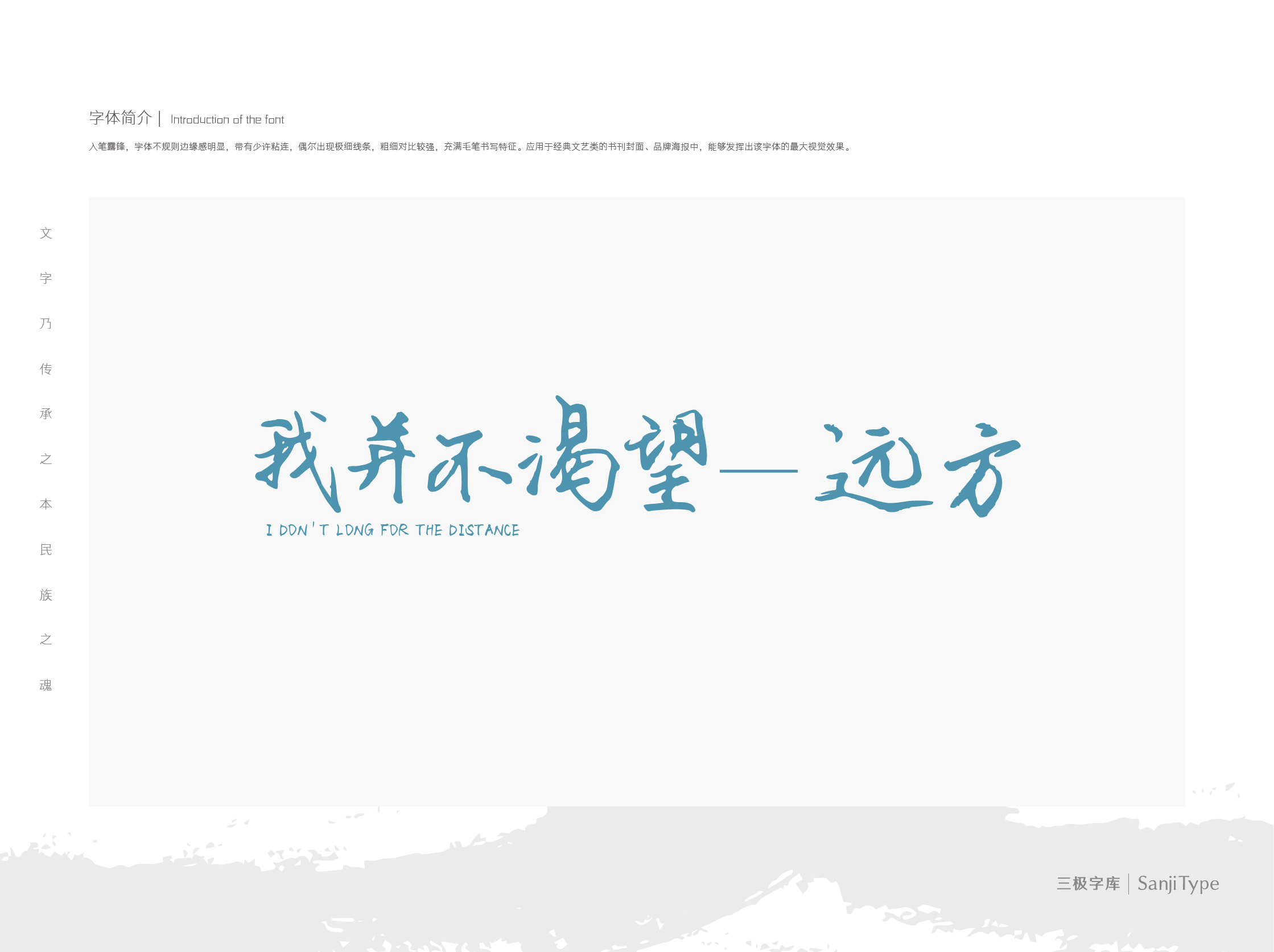 入笔露锋,字体不规则边缘感明显,带有少许粘连,偶尔出现极细线条,粗细对比较强,充满毛笔书写特征。应用于经典文艺类的书刊封面、品牌海报中,能够发挥出该字体的最大视觉效果。