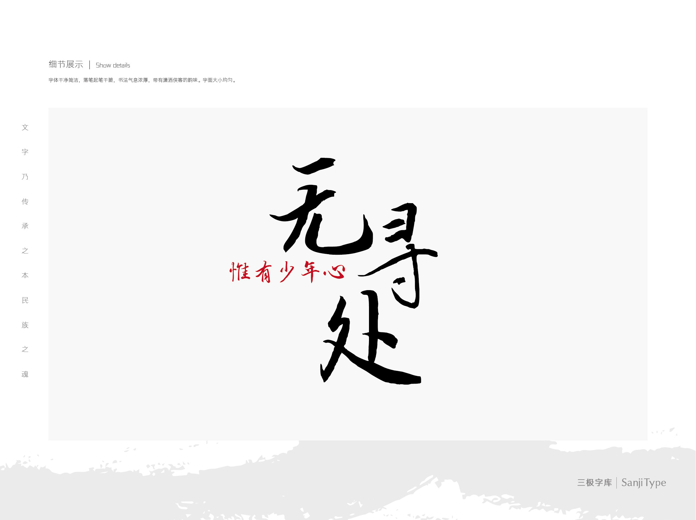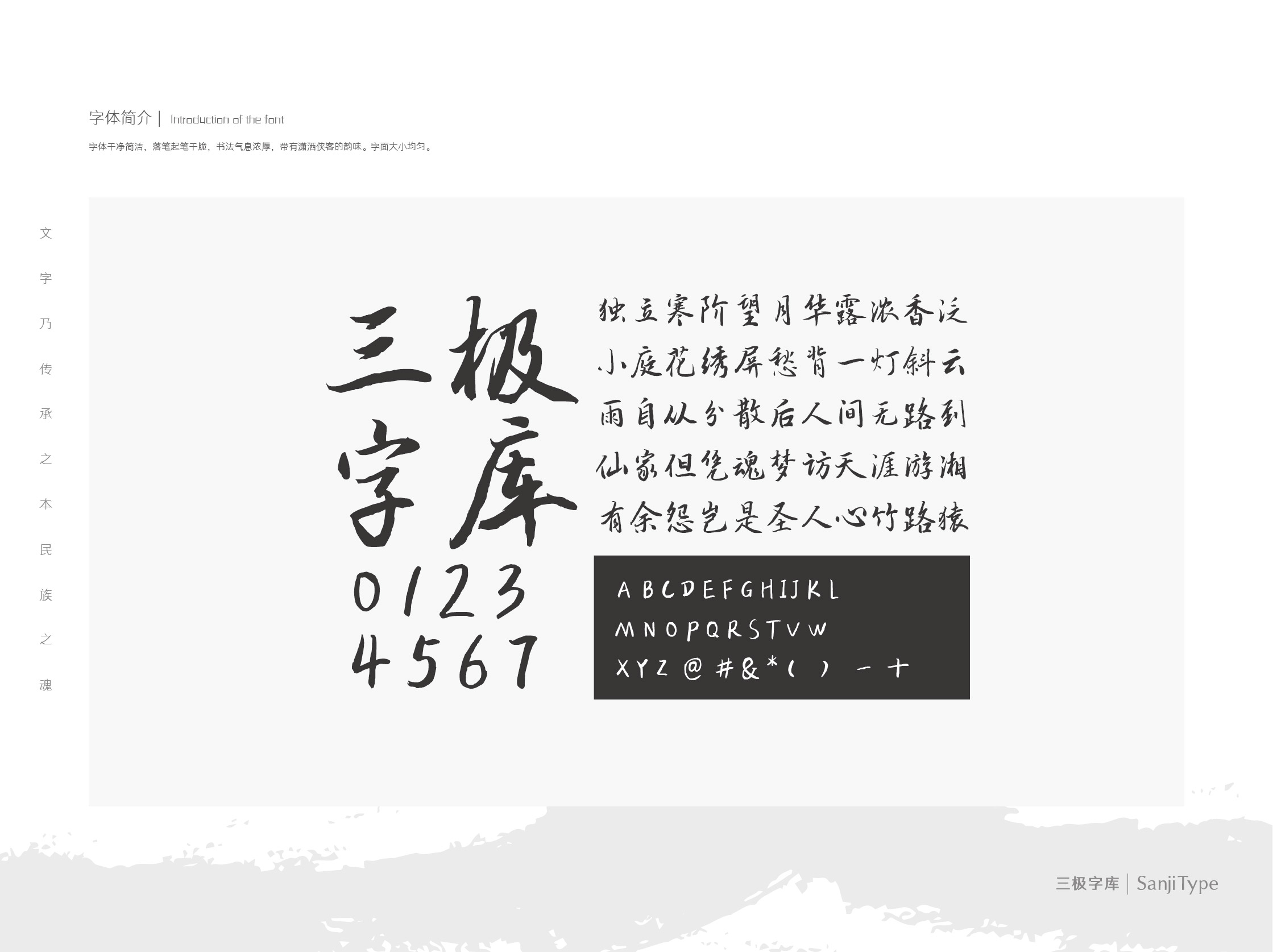 字体干净简洁,落笔起笔干脆,书法气息浓厚,带有潇洒侠客的韵味。字面大小均匀。适用于标题,宣传海报,页面设计等