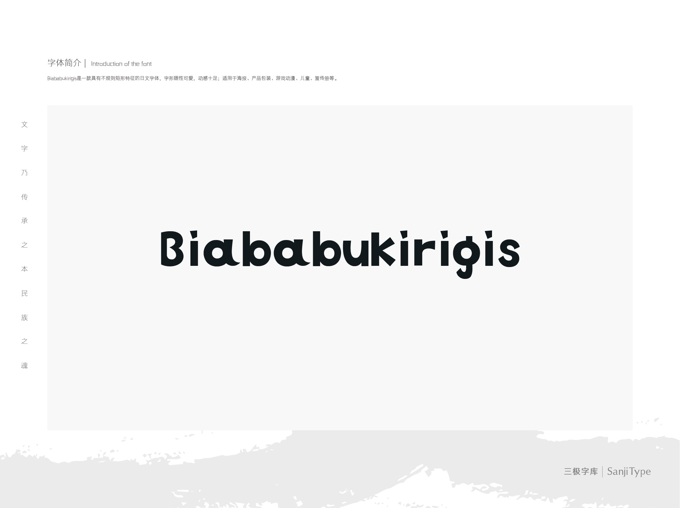 Biababukirigis是一款具有不规则矩形特征的日文字体,同时包含中、英字符。字形随性可爱,动感十足;适用于海报、产品包装、游戏动漫、儿童、宣传册等。