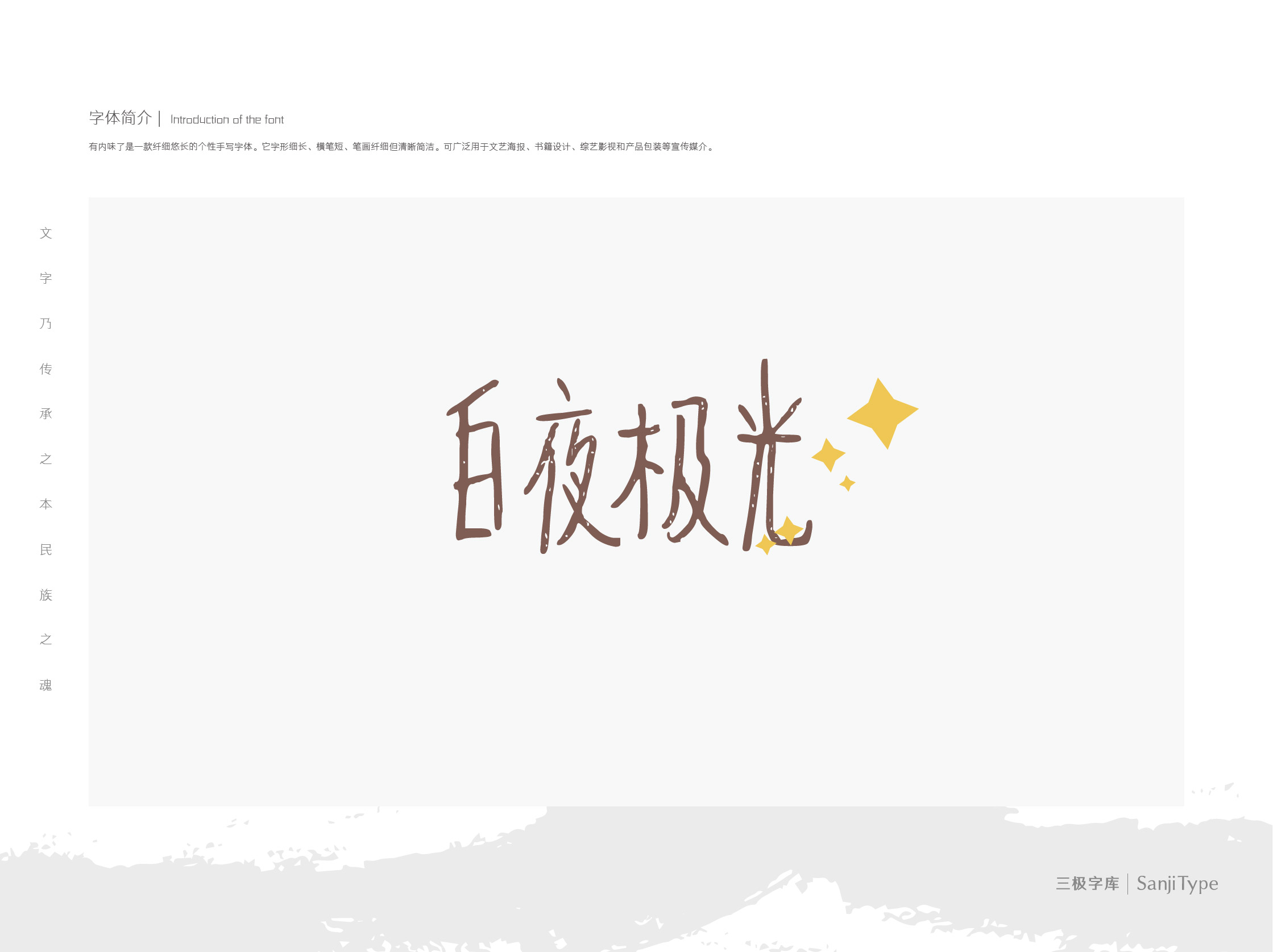 有内味了是一款纤细悠长的个性手写字体。它字形细长、横笔短、笔画纤细但清晰简洁。可广泛用于文艺海报、书籍设计、综艺影视和产品包装等宣传媒介。