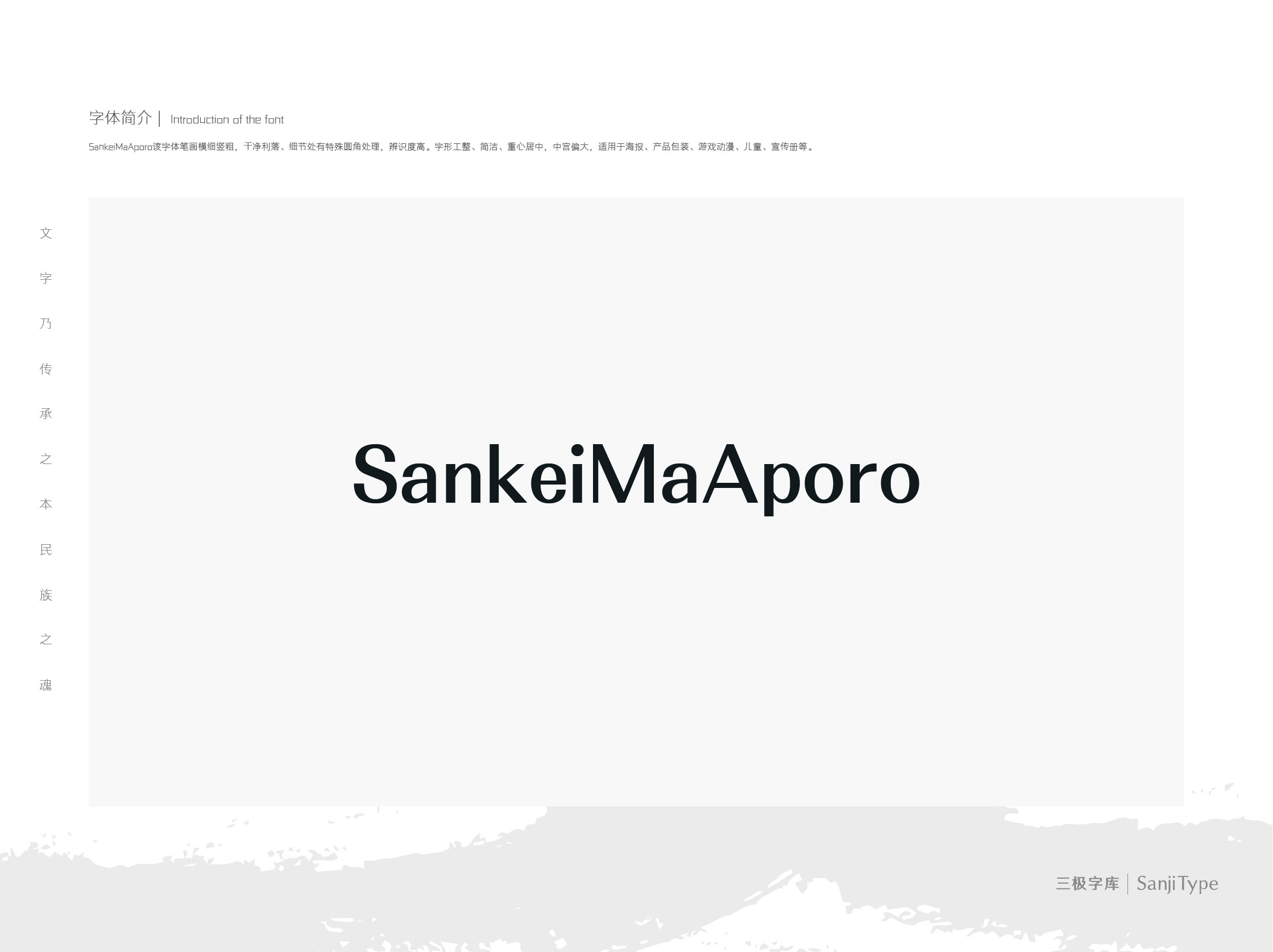 SankeiMaAporo包含中、日字符,该字体笔画横细竖粗,⼲净利落、细节处有特殊圆角处理,辨识度高。字形工整、简洁、重心居中,中宫偏大,适用于海报、产品包装、游戏动漫、儿童、宣传册等。
