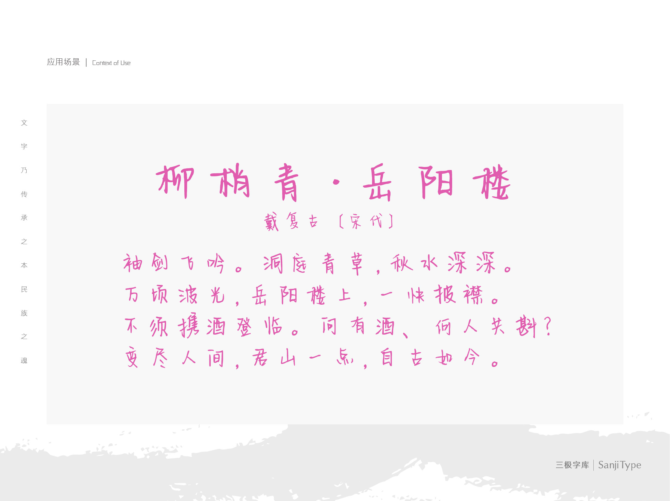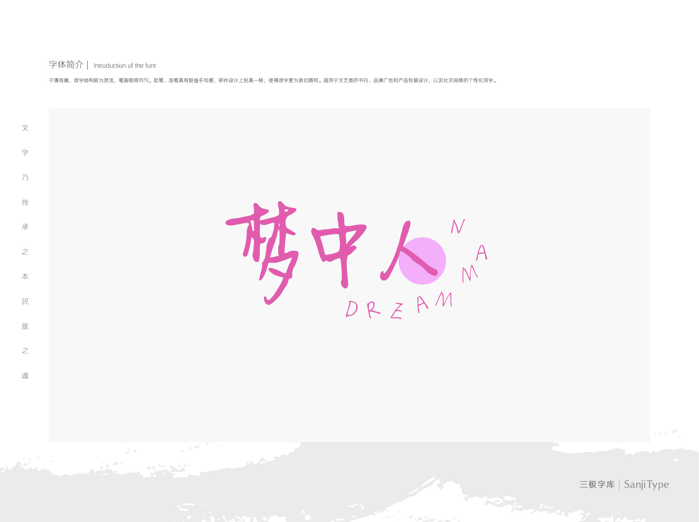 子清有晴,该字结构较为灵活,笔画粗细均匀。起笔、连笔具有较强手写感,部件设计上别具一格,使得该字更为亲切随和。适用于文艺类的书刊、品牌广告和产品包装设计,以及社交网络的个性化用字。