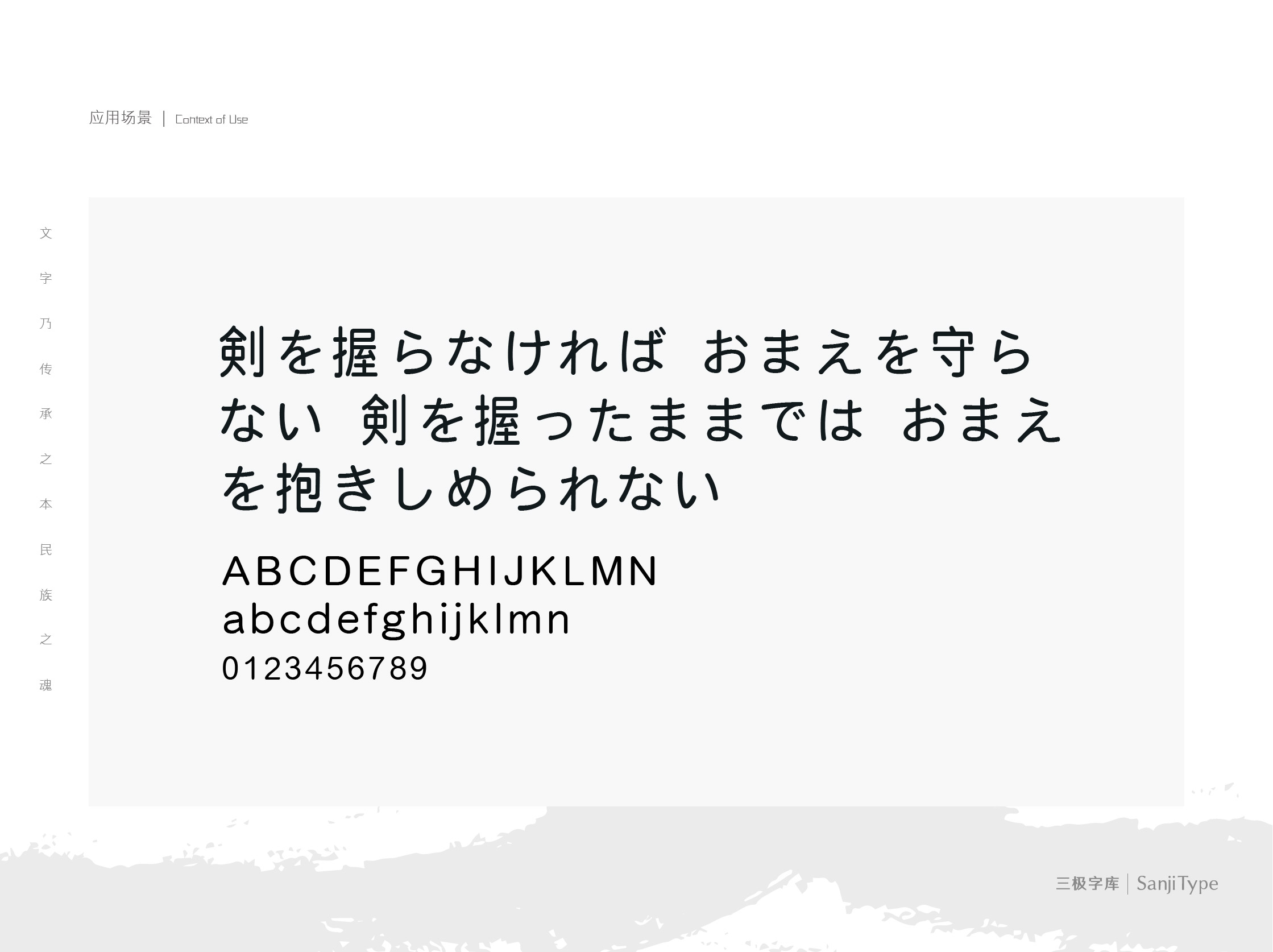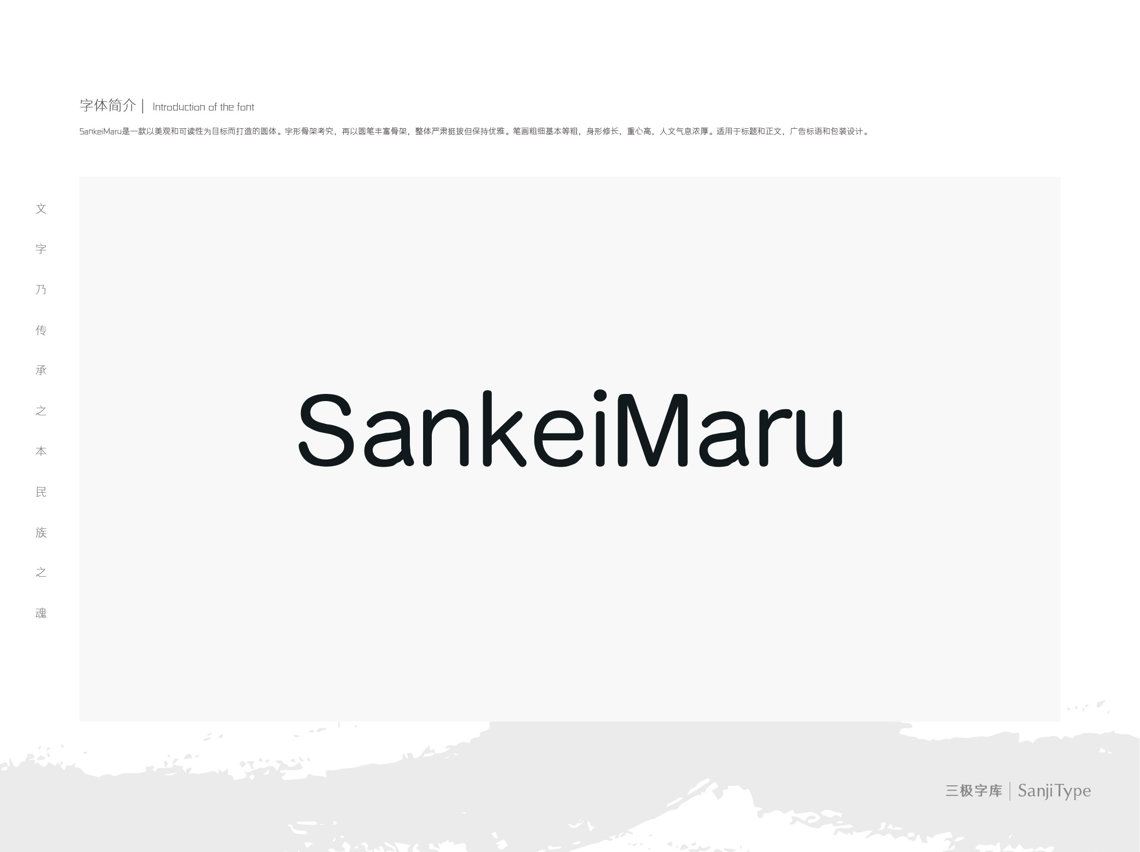 SankeiMaru是一款以美观和可读性为目标而打造的的日文圆体。字形骨架考究,再以圆笔丰富骨架,整体严肃挺拔但保持优雅。笔画粗细基本等粗,身形修长,重心高,人文气息浓厚。适用于标题和正文,广告标语和包装设计。