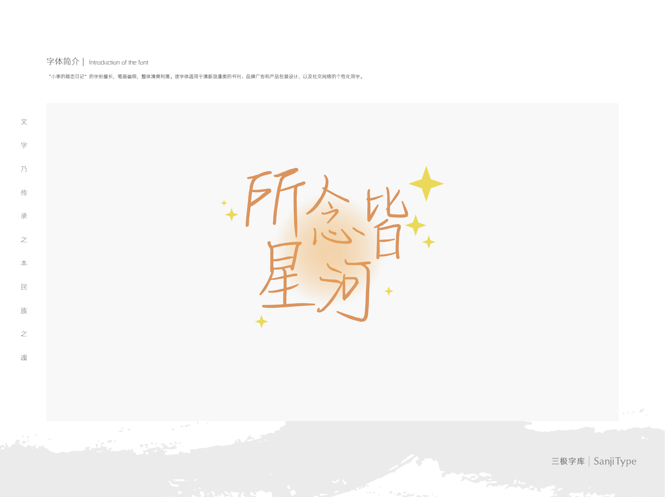 “小李的暗恋日记”的字形瘦长,笔画偏细,整体清爽利落。该字体适用于清新浪漫类的书刊、品牌广告和产品包装设计,以及社交网络的个性化用字。