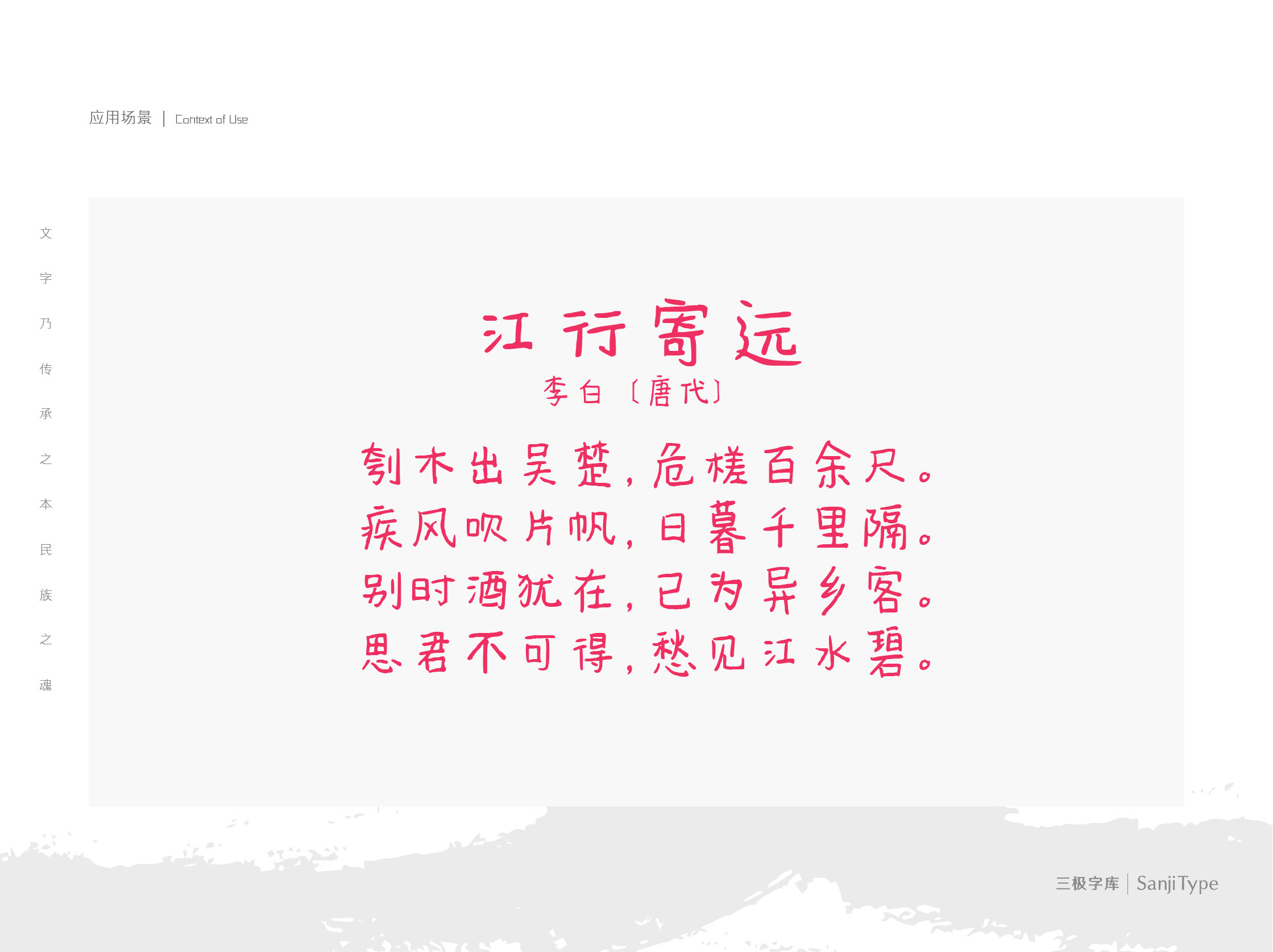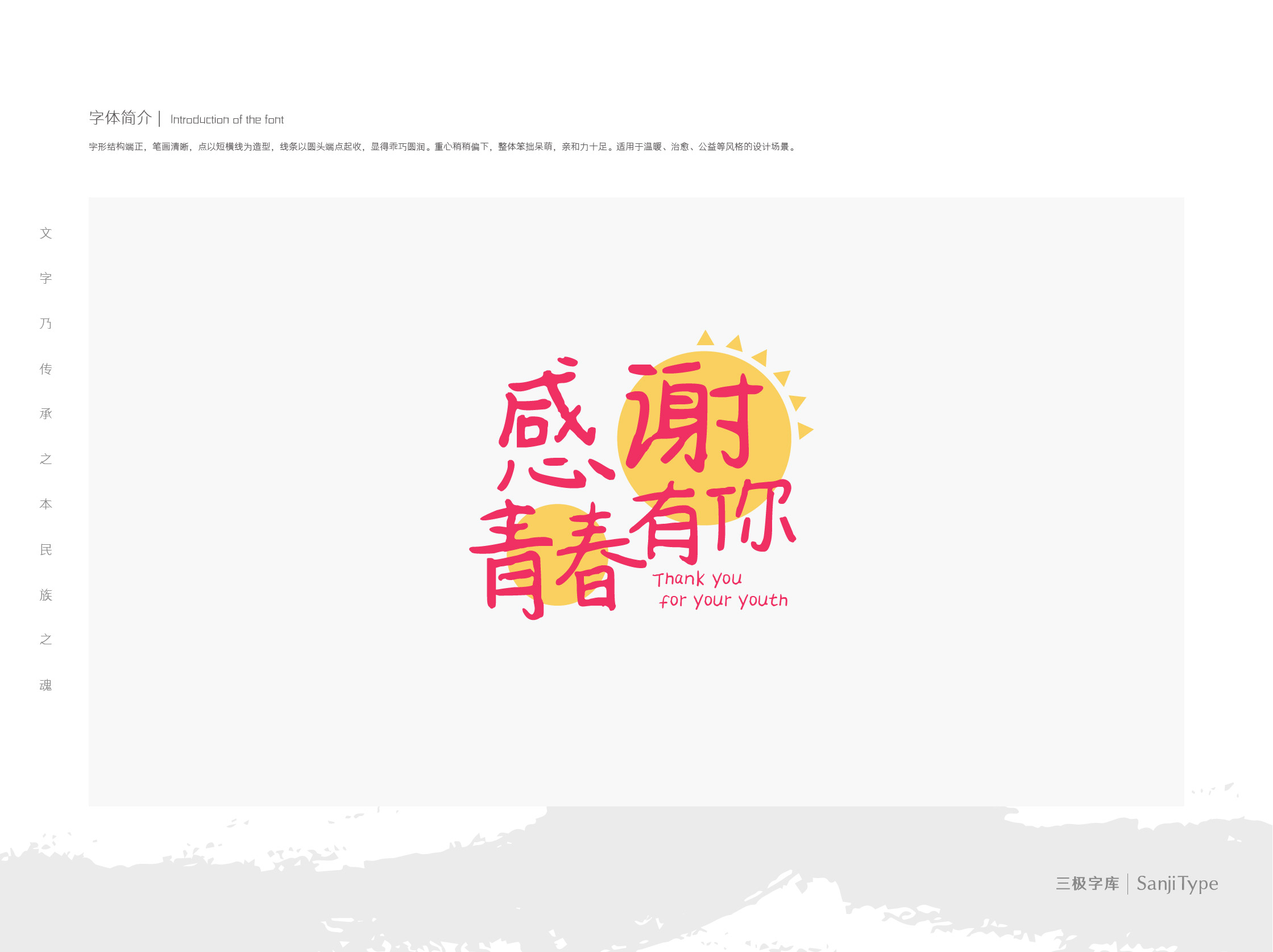 字形结构端正,笔画清晰,点以短横线为造型,线条以圆头端点起收,显得乖巧圆润。重心稍稍偏下,整体笨拙呆萌,亲和力十足。适用于温暖、治愈、公益等风格的设计场景。