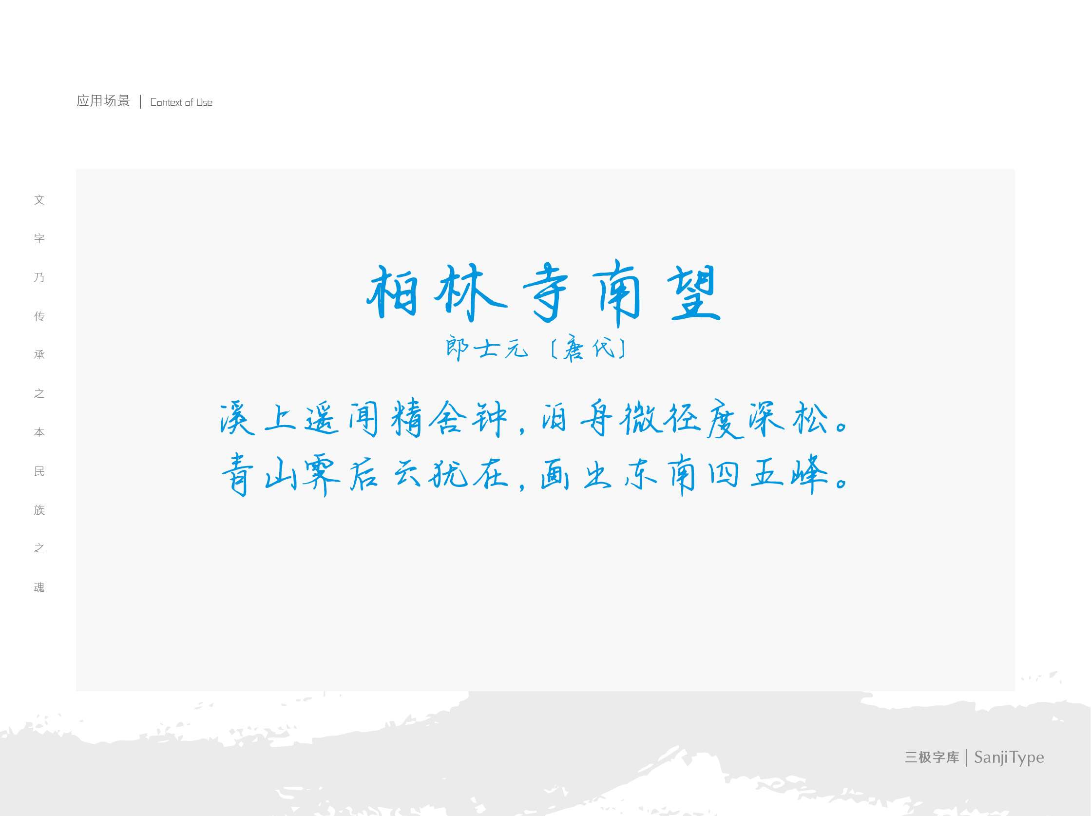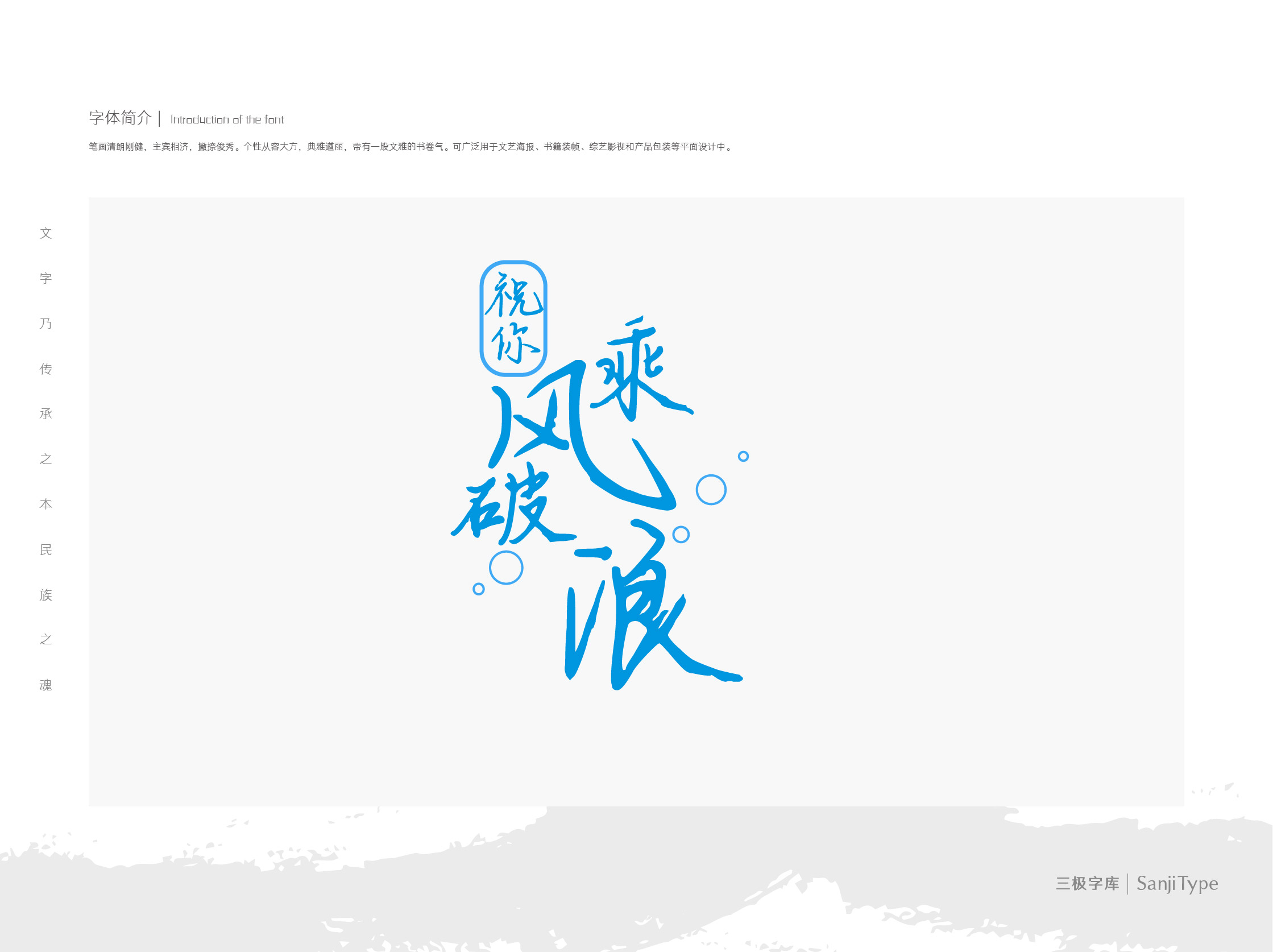 笔画清朗刚健,主宾相济,撇捺俊秀。个性从容大方,典雅遒丽,带有一股文雅的书卷气。可广泛用于文艺海报、书籍装帧、综艺影视和产品包装等平面设计中。