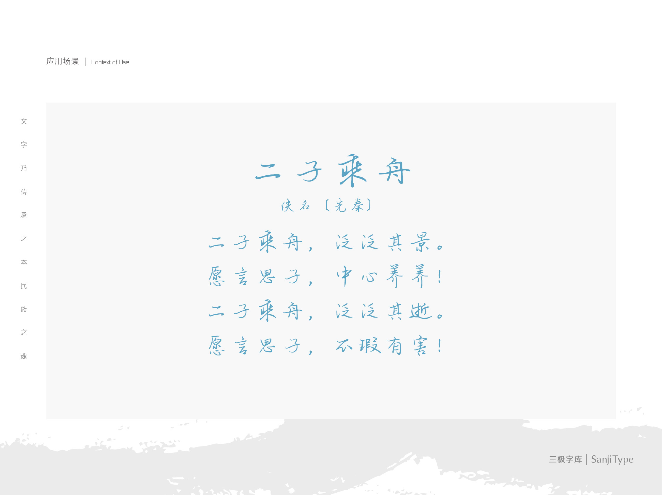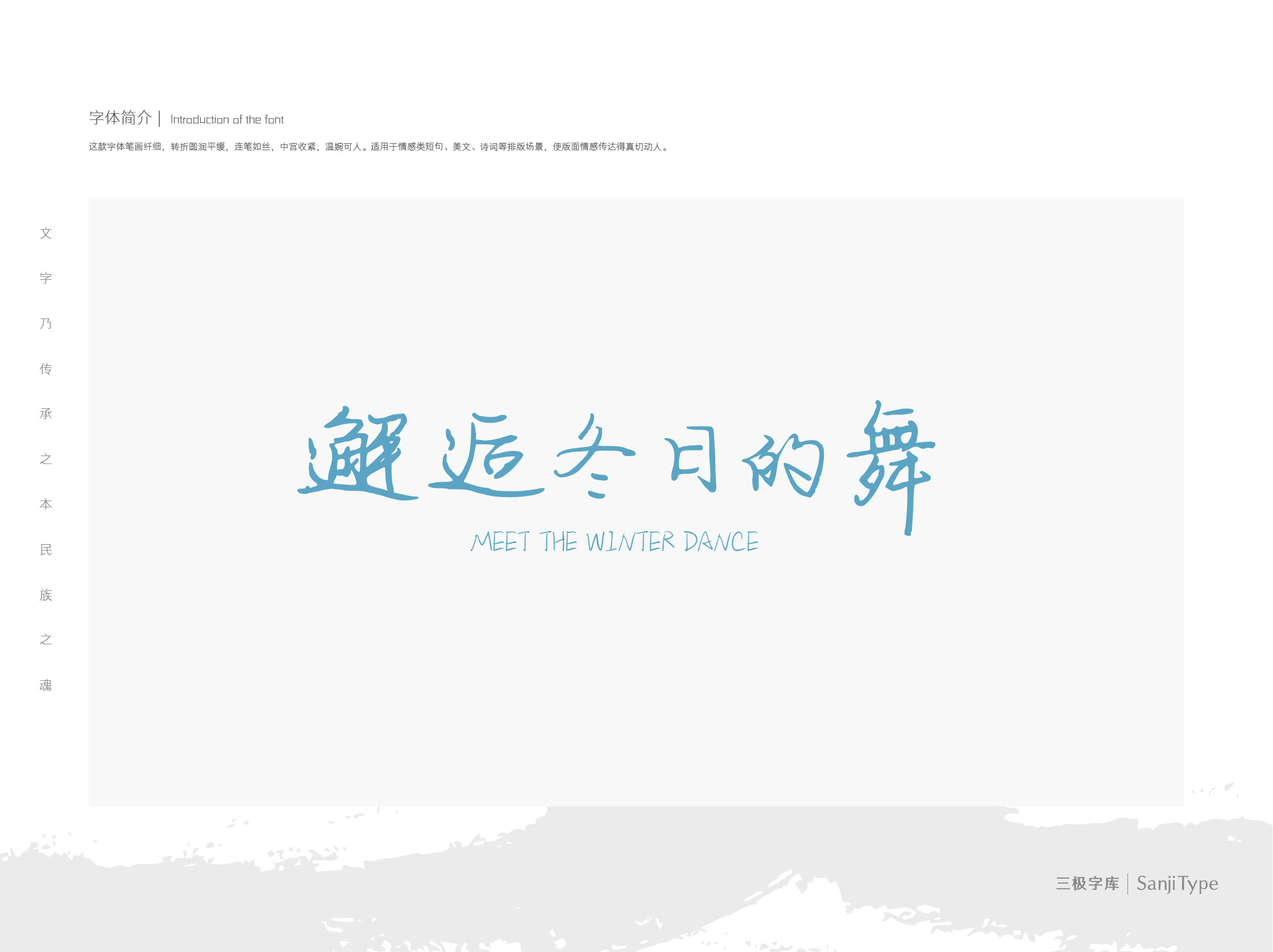 冬日的初舞这款字体笔画纤细,转折圆润平缓,连笔如丝,中宫收紧,温婉可人。适用于情感类短句、美文、诗词等排版场景,使版面情感传达得真切动人。