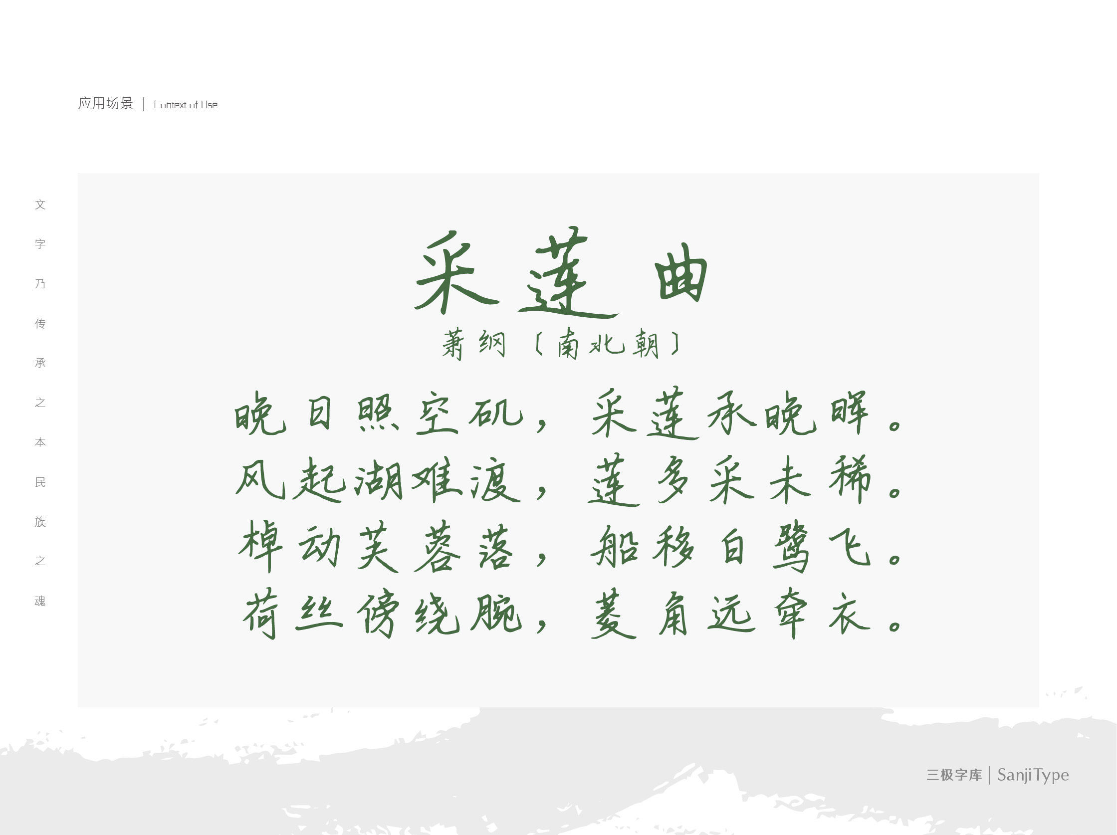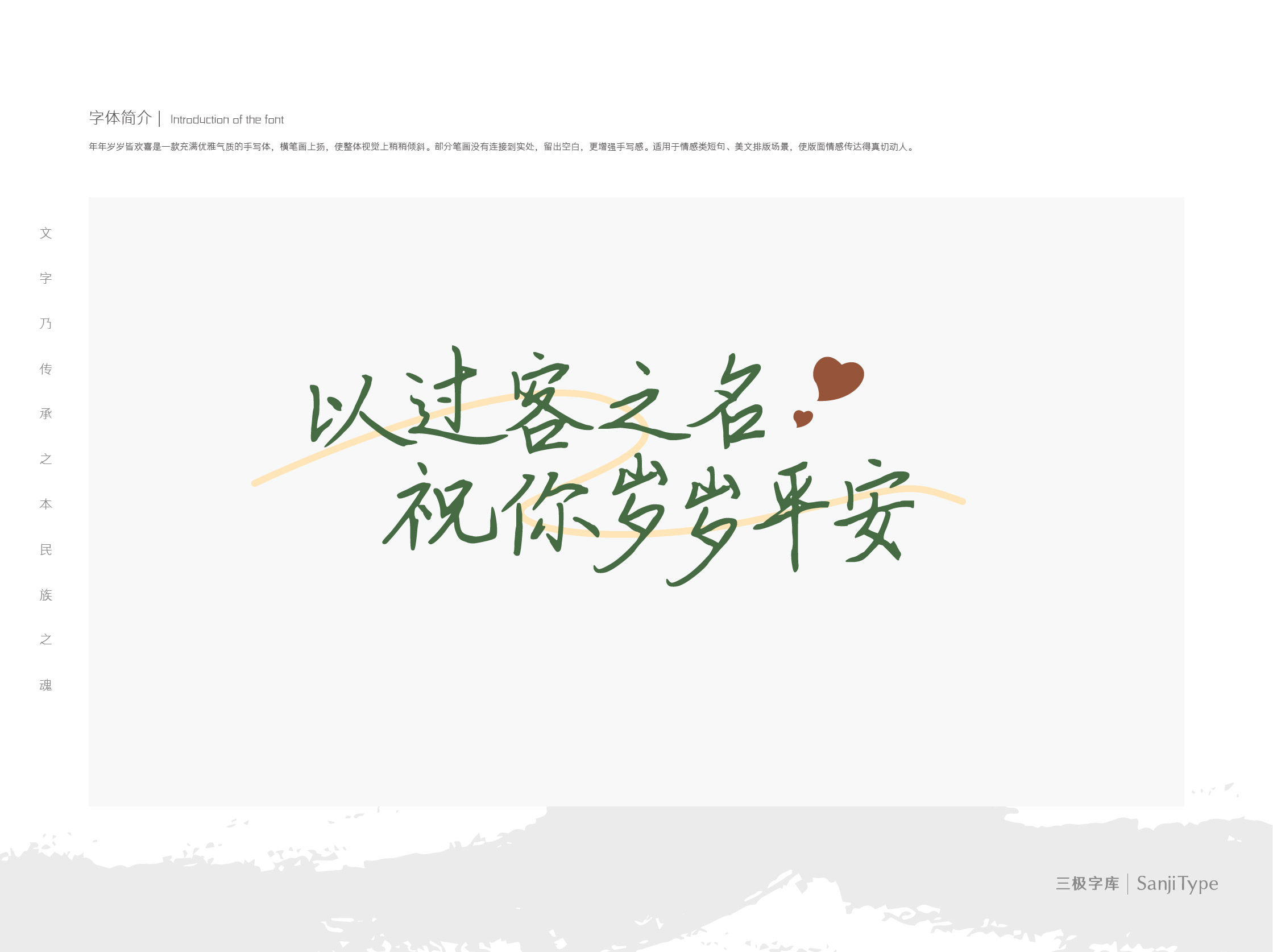 年年岁岁皆欢喜是一款充满优雅气质的手写体,横笔画上扬,使整体视觉上稍稍倾斜。部分笔画没有连接到实处,留出空白,更增强手写感。适用于情感类短句、美文排版场景,使版面情感传达得真切动人。