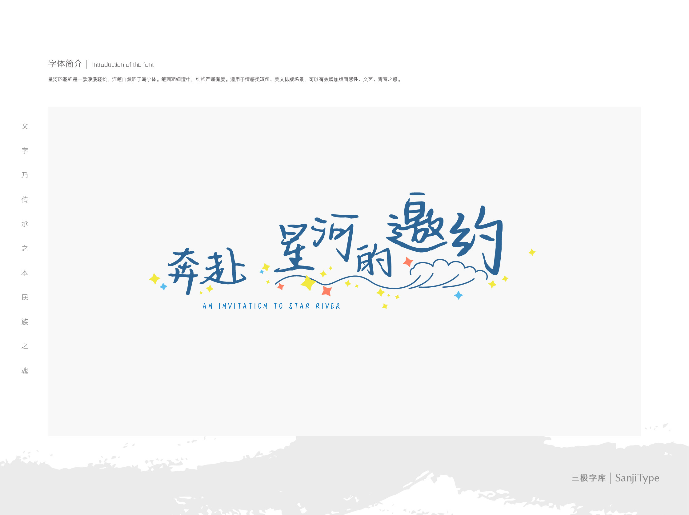 星河的邀约是一款浪漫轻松,连笔自然的手写字体。笔画粗细适中,结构严谨有度。适用于情感类短句、美文排版场景,可以有效增加版面感性、文艺、青春之感。