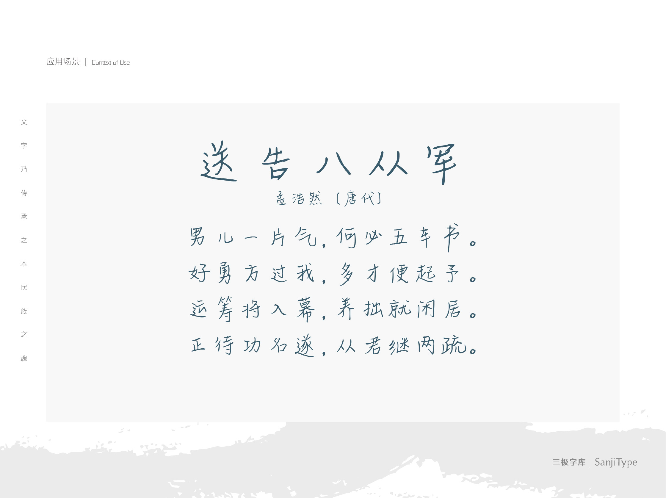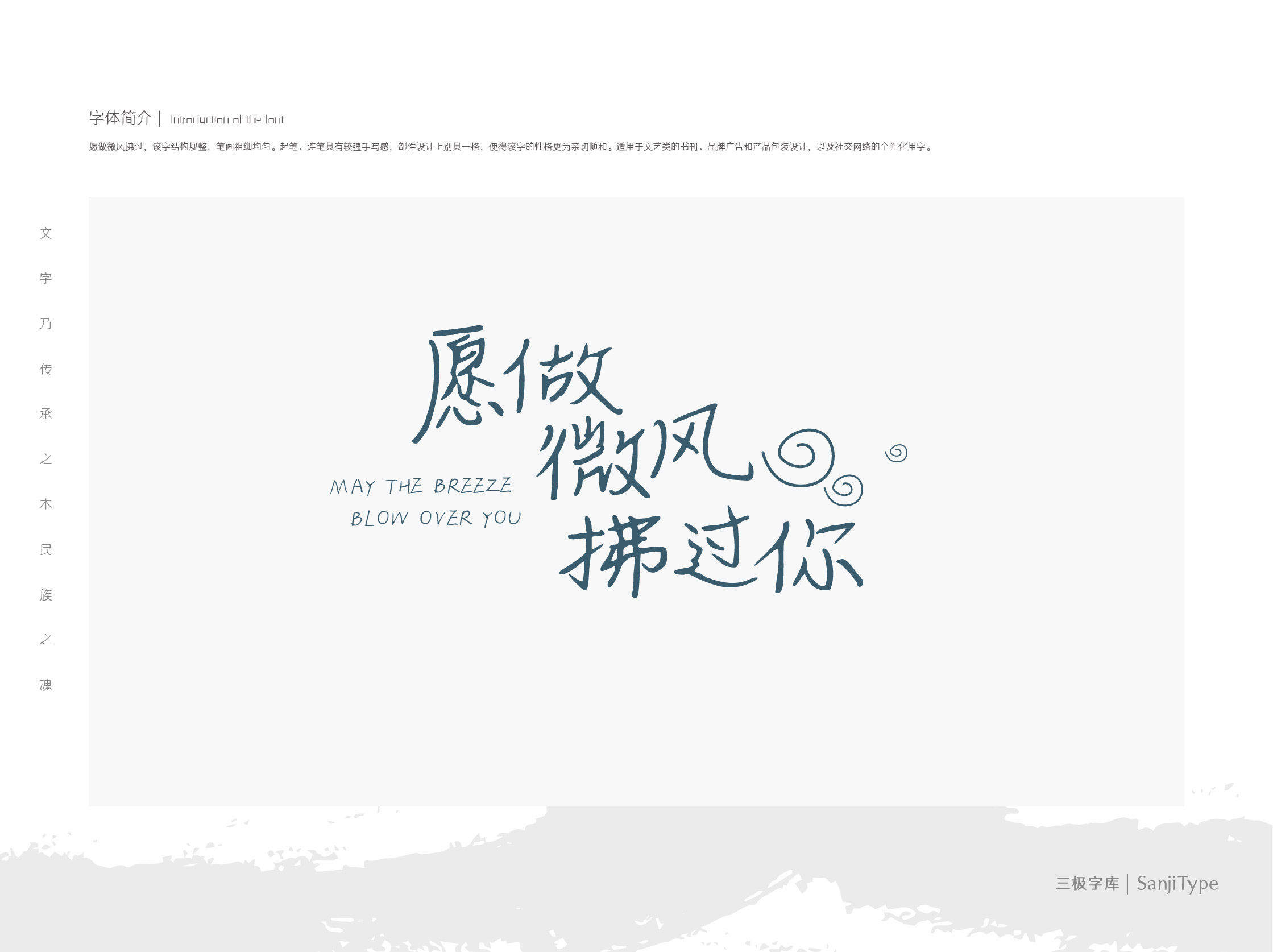 愿做微风拂过,该字结构规整,笔画粗细均匀。起笔、连笔具有较强手写感,部件设计上别具一格,使得该字的性格更为亲切随和。适用于文艺类的书刊、品牌广告和产品包装设计,以及社交网络的个性化用字。