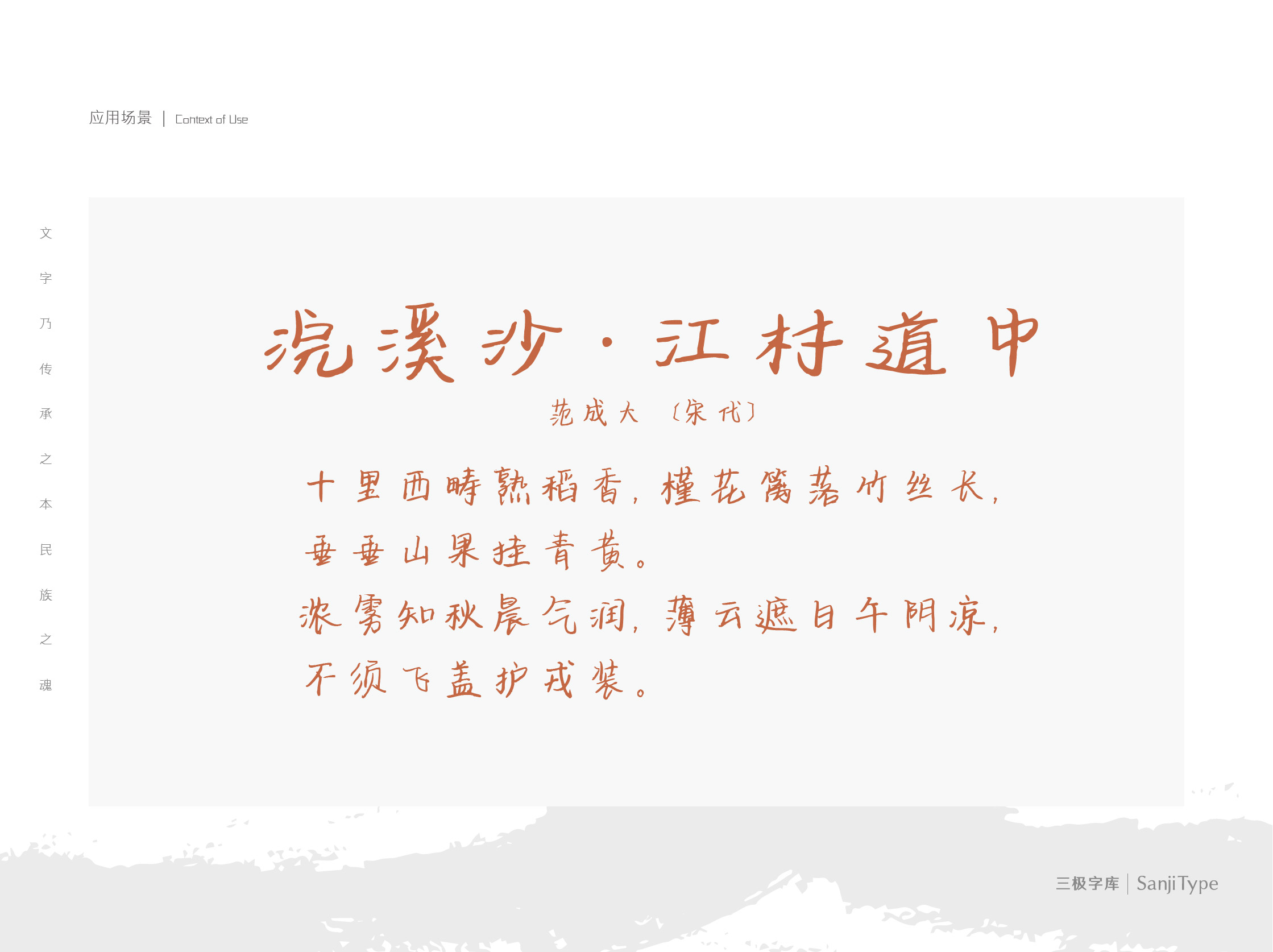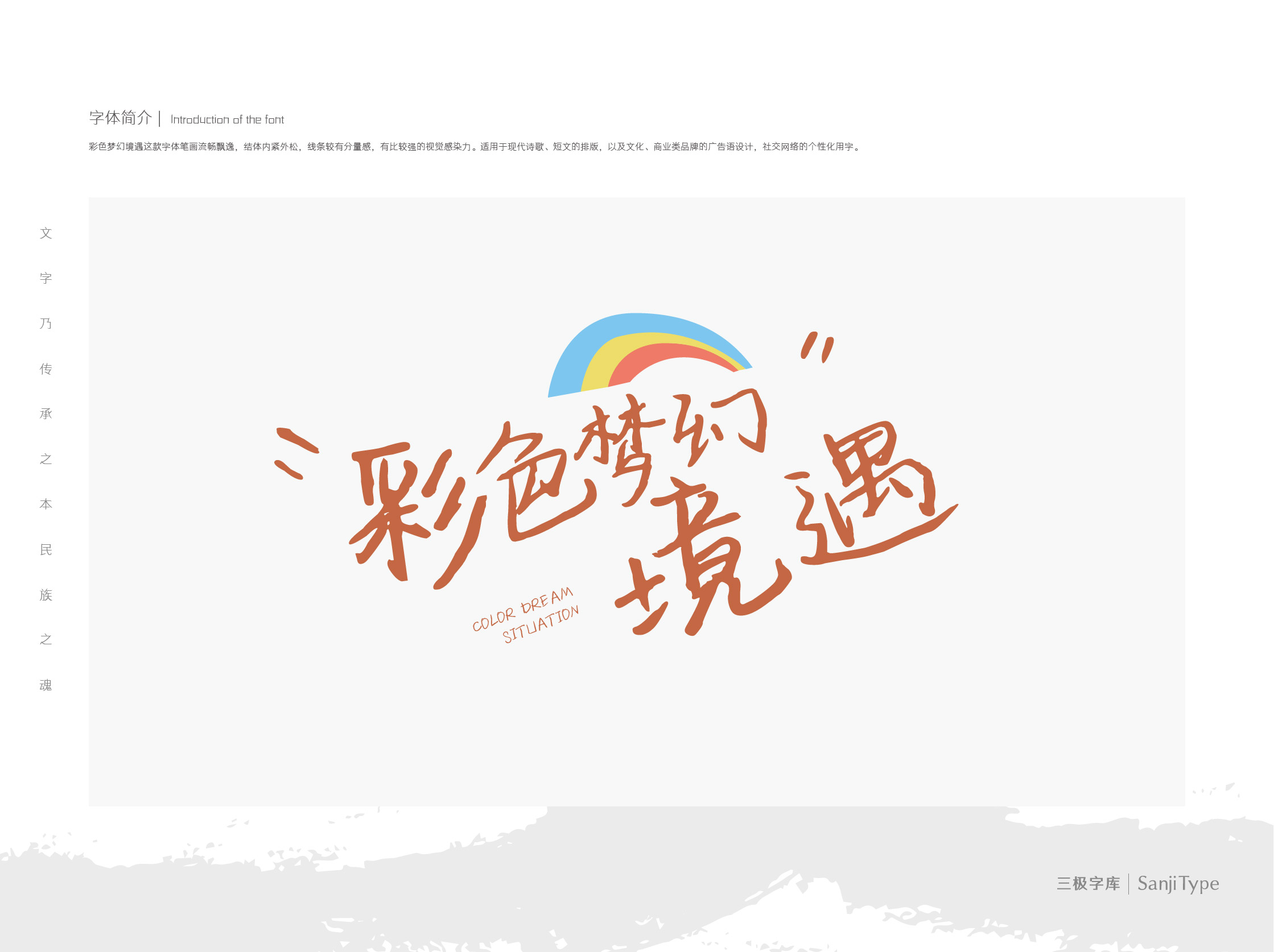 彩色梦幻境遇这款字体笔画流畅飘逸,结体内紧外松,线条较有分量感,有比较强的视觉感染力。适用于现代诗歌、短文的排版,以及文化、商业类品牌的广告语设计,社交网络的个性化用字。