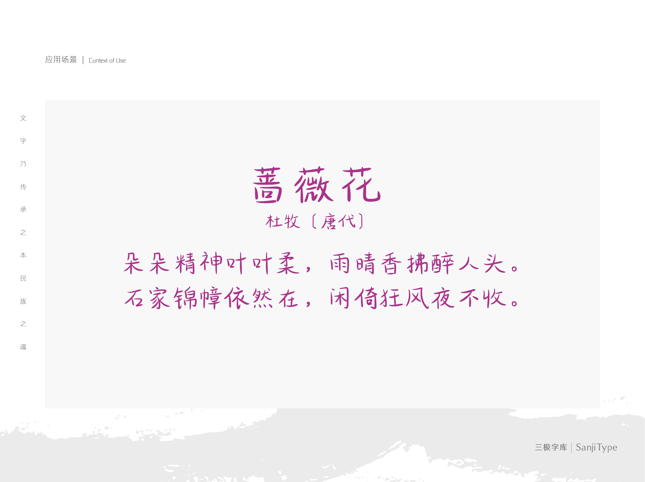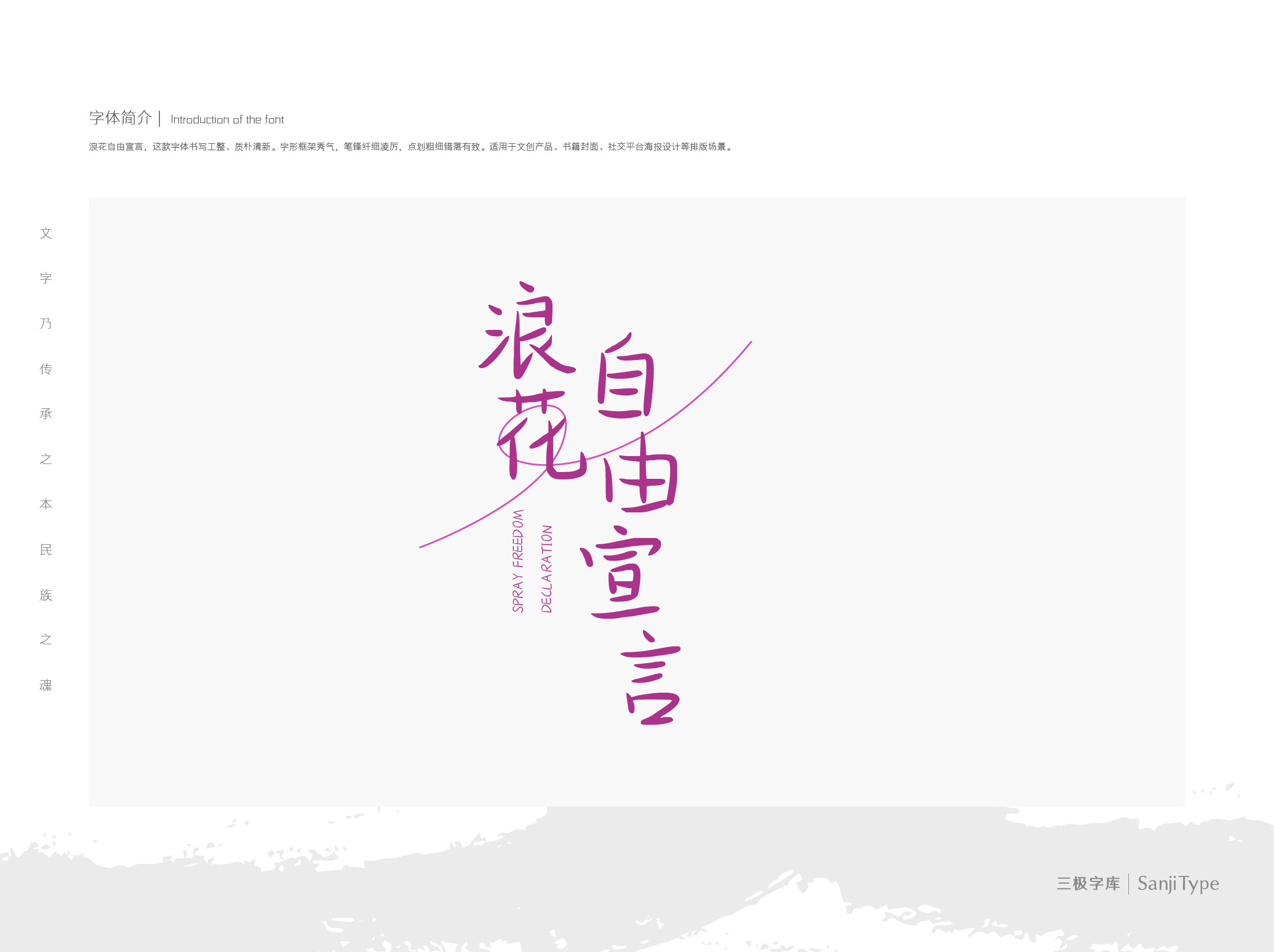 浪花自由宣言,这款字体书写工整、质朴清新。字形框架秀气,笔锋纤细凌厉,点划粗细错落有致。适用于文创产品、书籍封面、社交平台海报设计等排版场景。