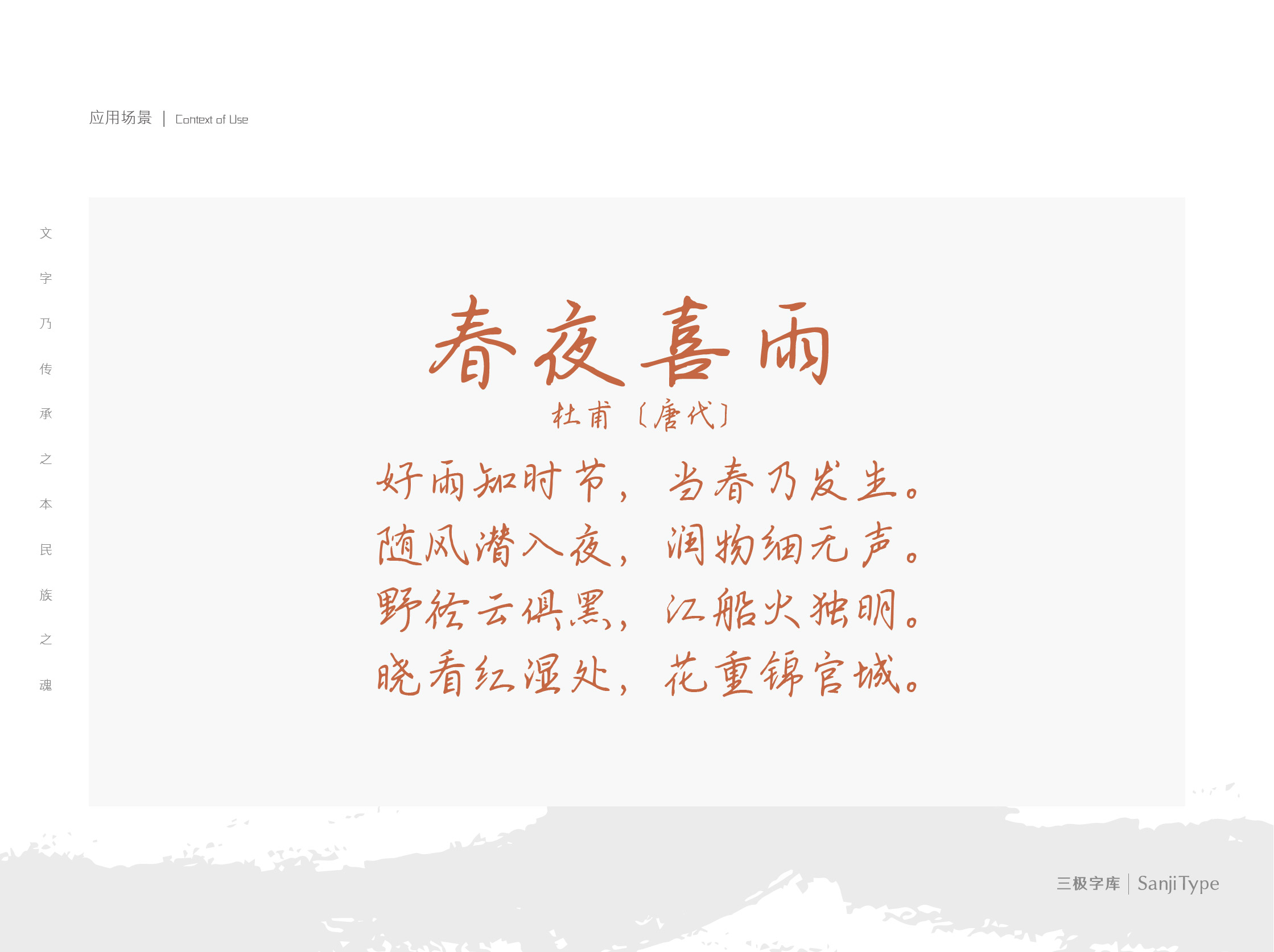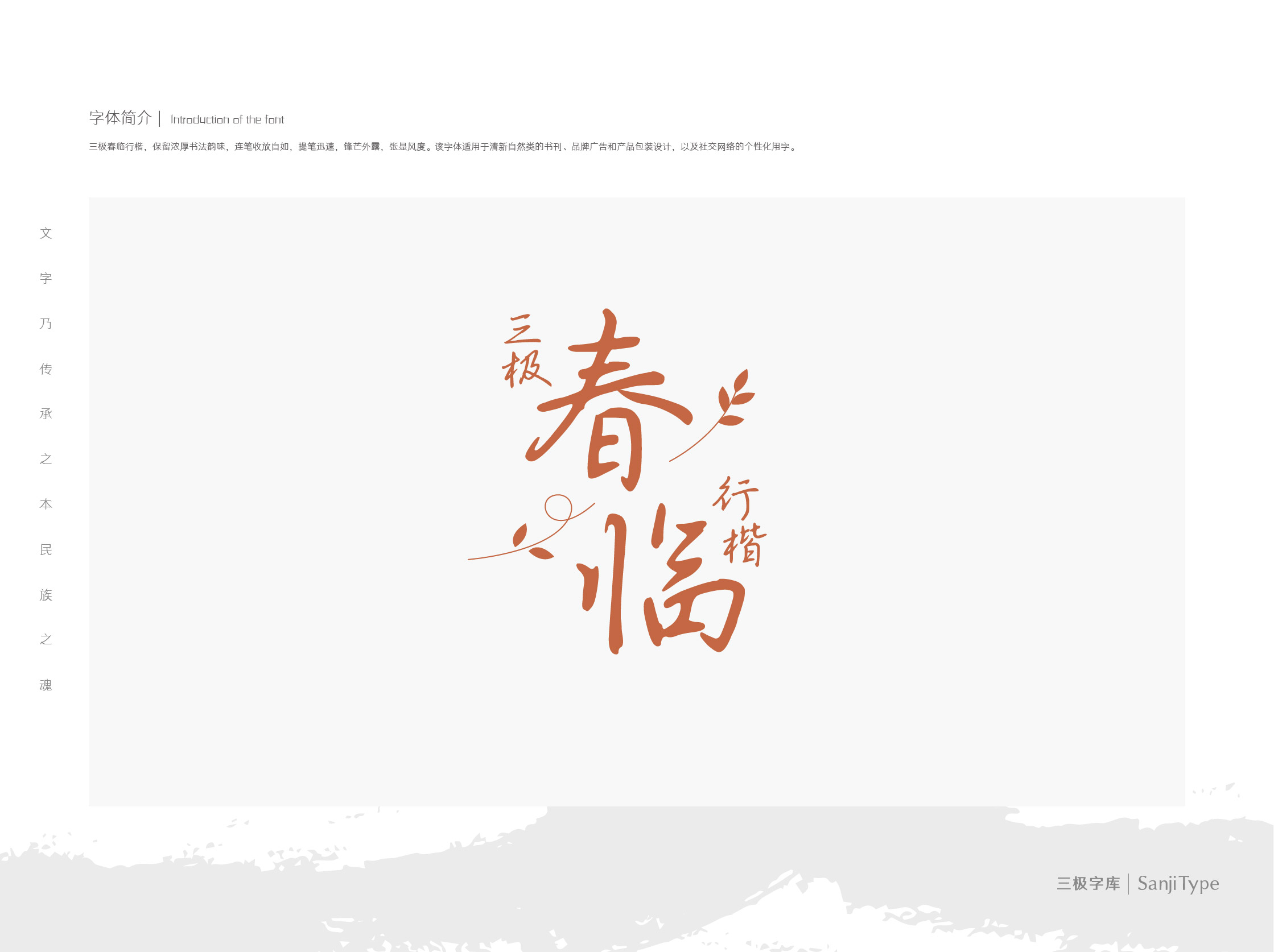 三极春临行楷,保留浓厚书法韵味,连笔收放自如,提笔迅速,锋芒外露,张显风度。该字体适用于清新自然类的书刊、品牌广告和产品包装设计,以及社交网络的个性化用字。