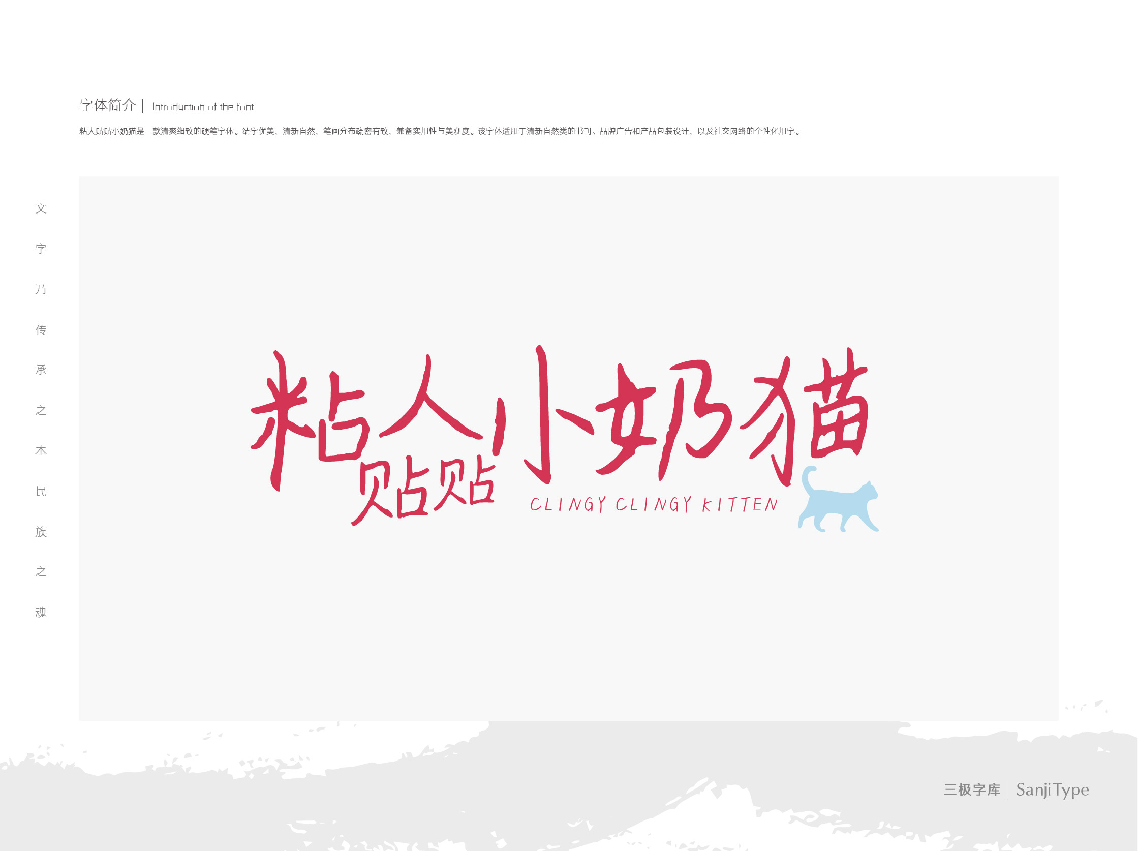 粘人贴贴小奶猫是一款清爽细致的硬笔字体。结字优美,清新自然,笔画分布疏密有致,兼备实用性与美观度。该字体适用于清新自然类的书刊、品牌广告和产品包装设计,以及社交网络的个性化用字。
