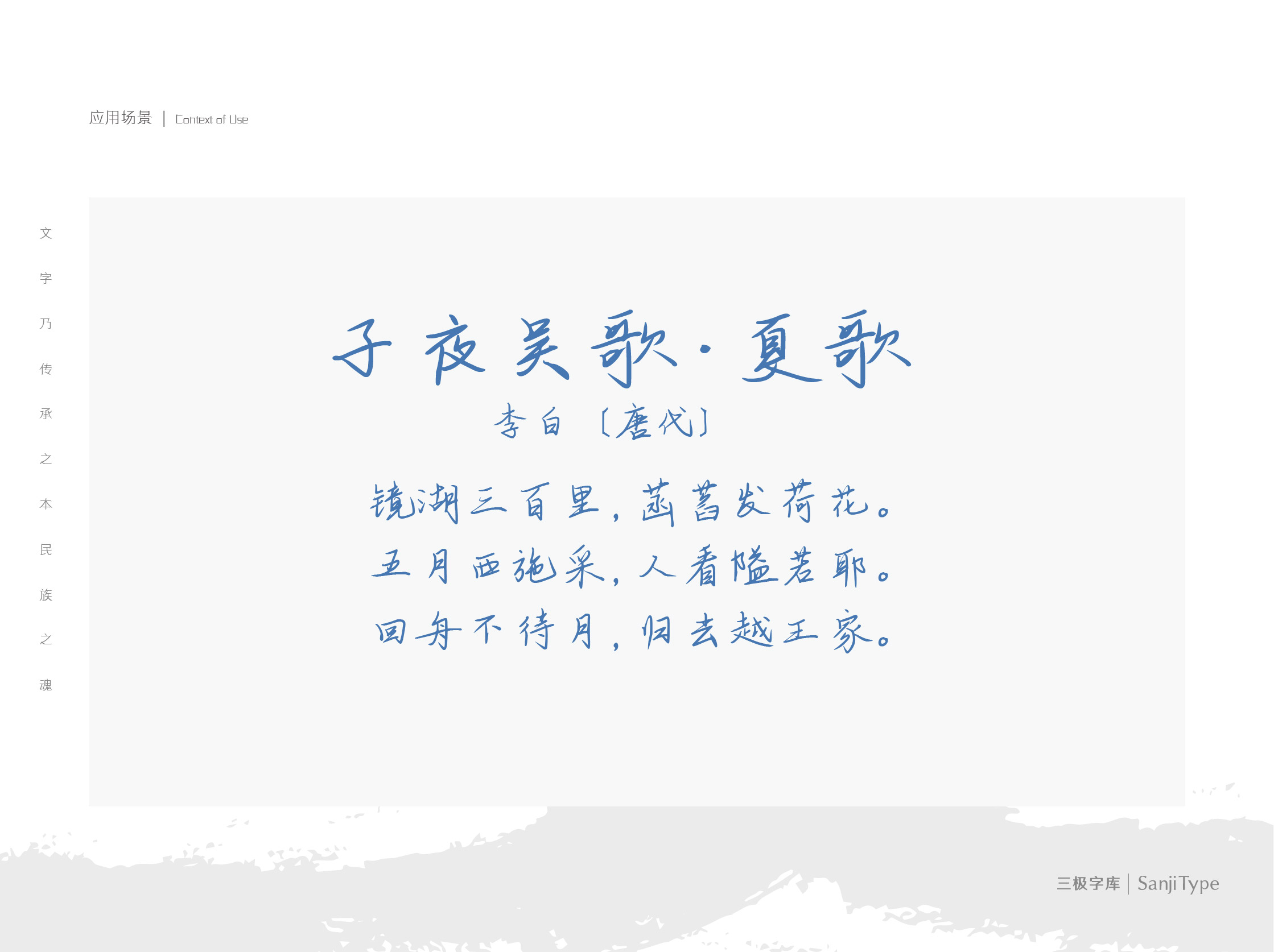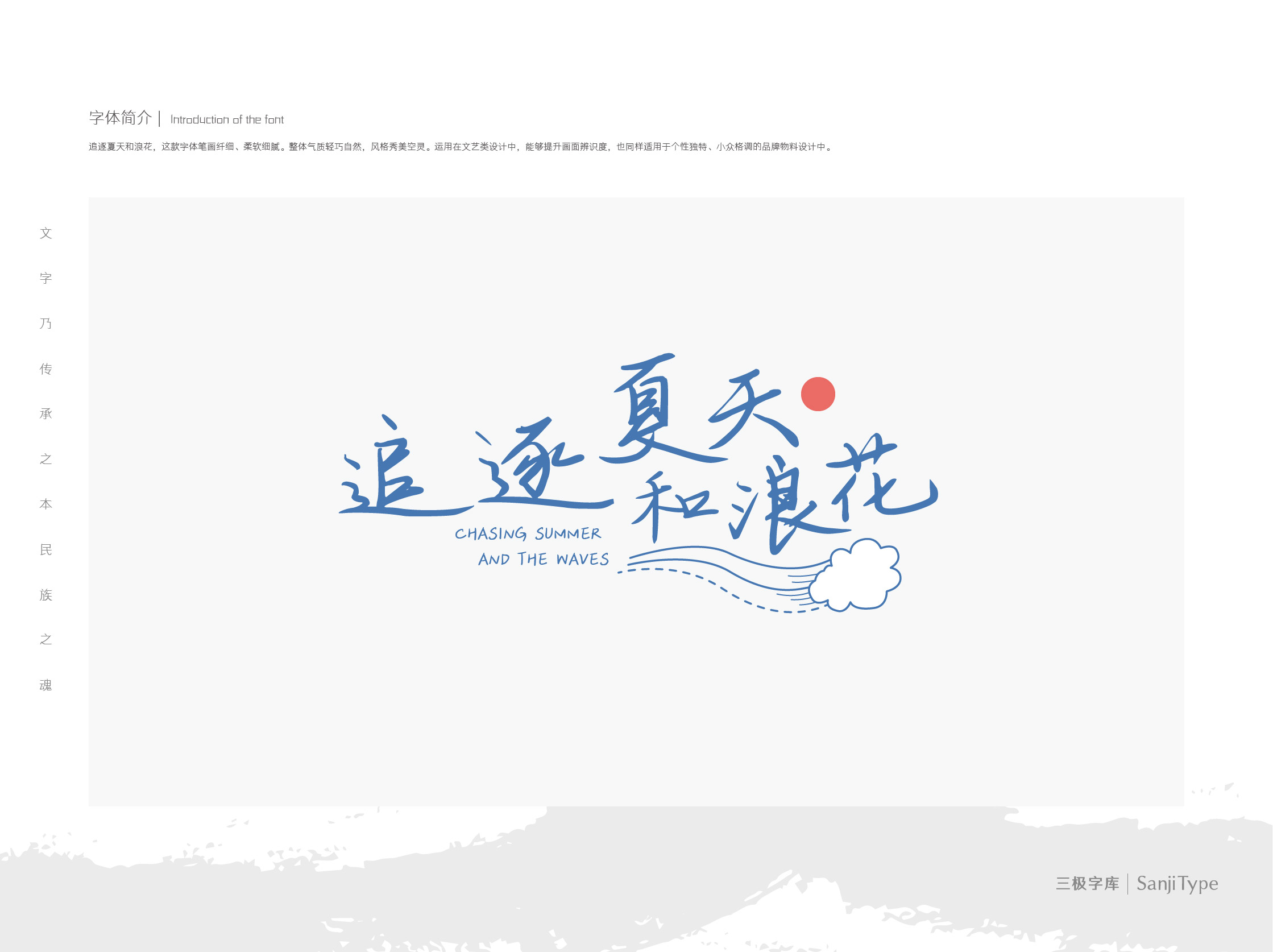 追逐夏天和浪花,这款字体笔画纤细、柔软细腻。整体气质轻巧自然,风格秀美空灵。运用在文艺类设计中,能够提升画面辨识度,也同样适用于个性独特、小众格调的品牌物料设计中。