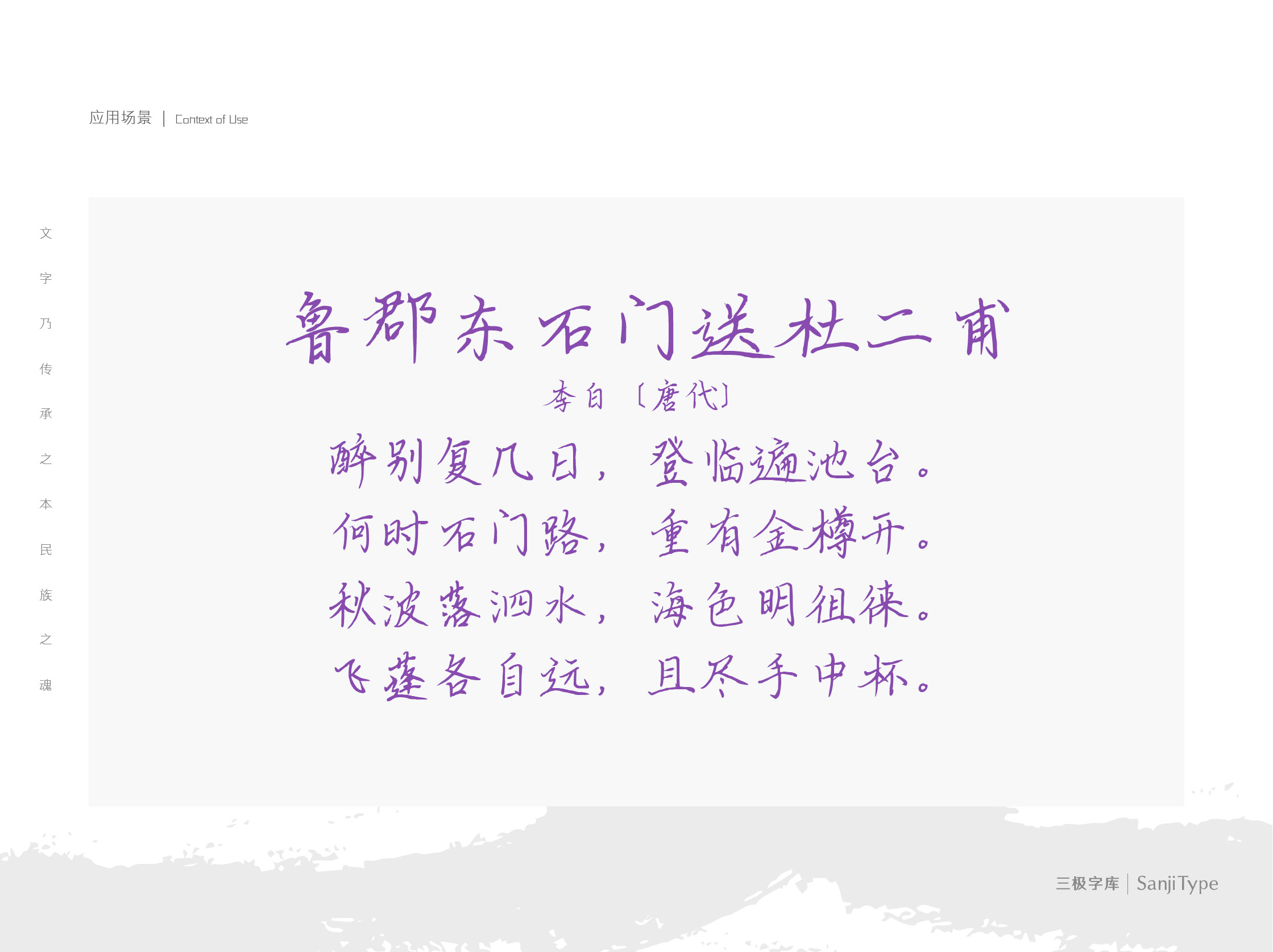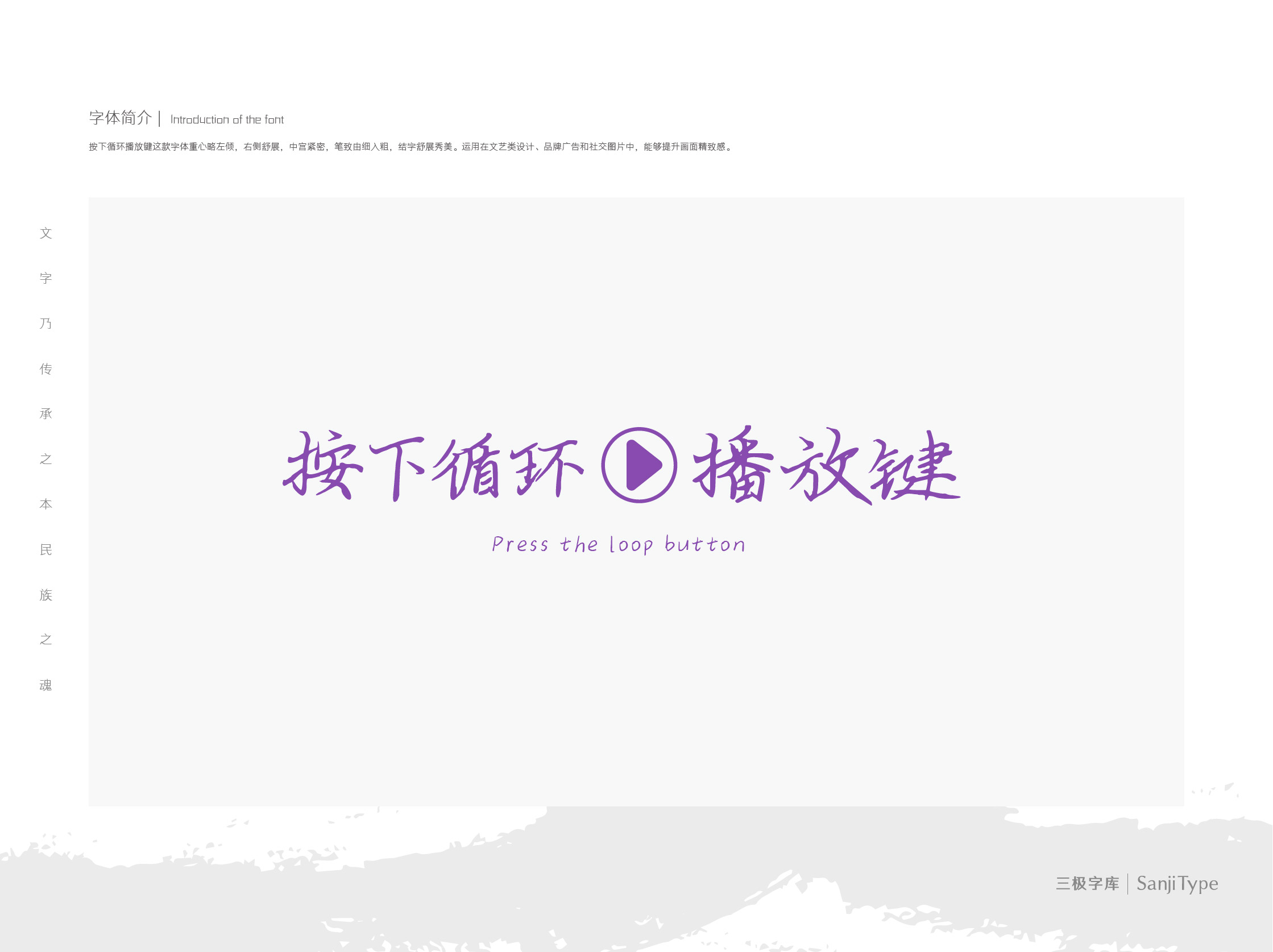 按下循环播放键这款字体重心略左倾,右侧舒展,中宫紧密,笔致由细入粗,结字舒展秀美。运用在文艺类设计、品牌广告和社交图片中,能够提升画面精致感。