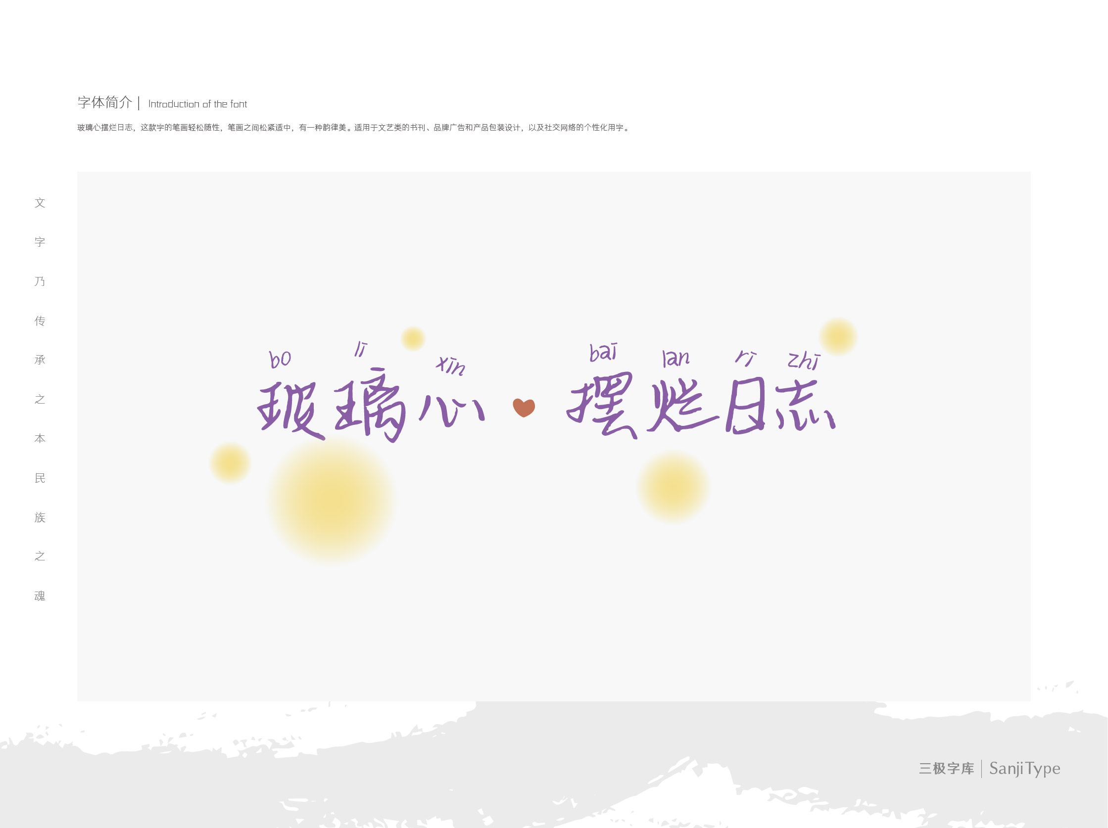 玻璃心摆烂日志,这款字的笔画轻松随性,笔画之间松紧适中,有一种韵律美。适用于文艺类的书刊、品牌广告和产品包装设计,以及社交网络的个性化用字。