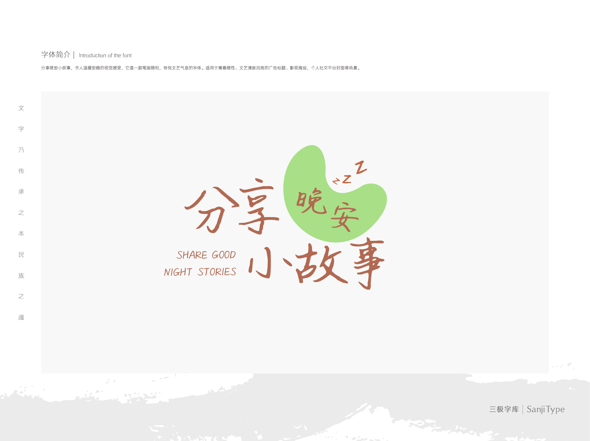 分享晚安小故事,予人温暖安稳的视觉感受,它是一款笔画随和,带有文艺气息的字体。适用于青春随性、文艺清新风格的广告标题、影视海报,个人社交平台封面等场景。