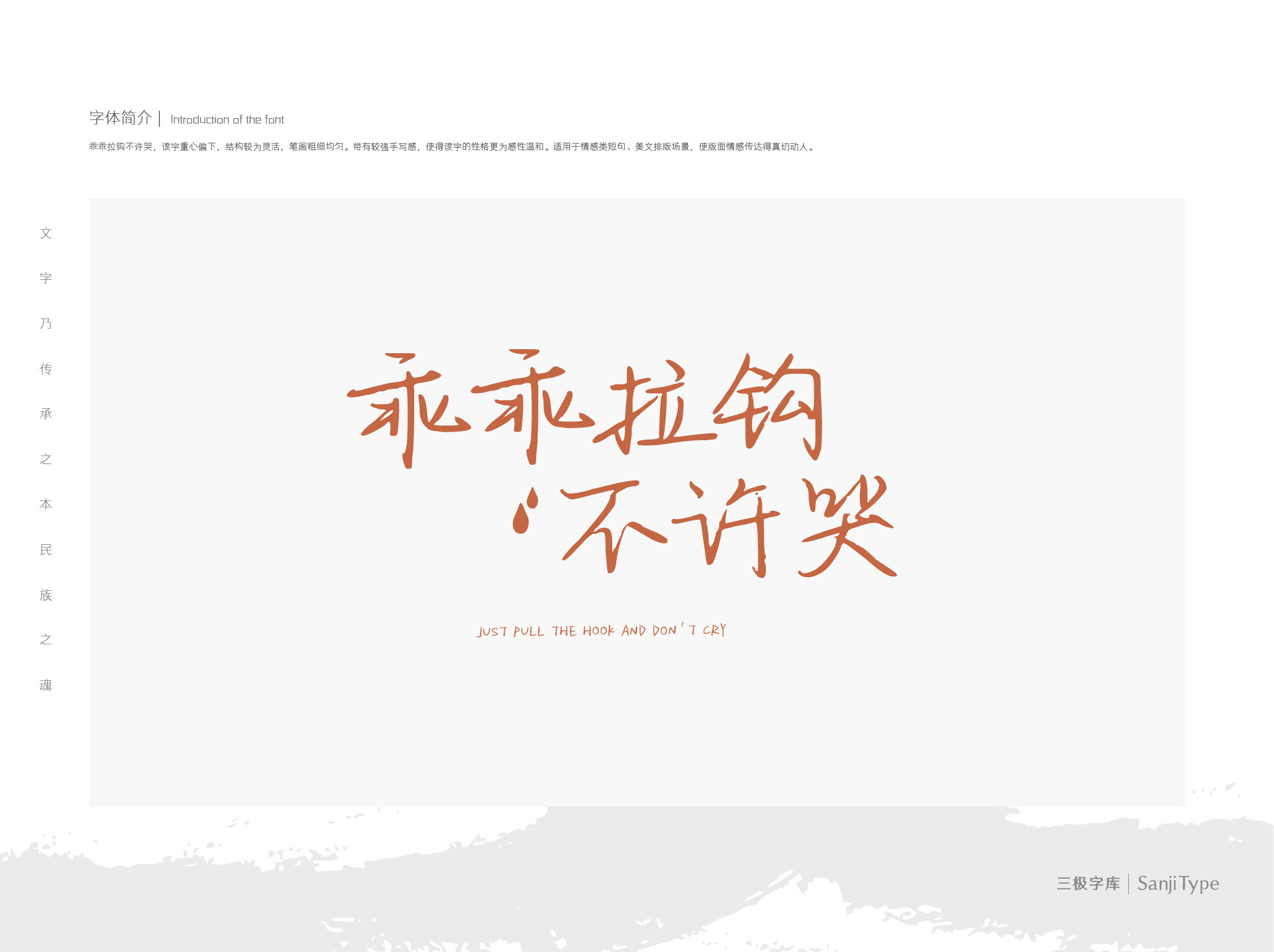 乖乖拉钩不许哭,该字重心偏下,结构较为灵活,笔画粗细均匀。带有较强手写感,使得该字的性格更为感性温和。适用于情感类短句、美文排版场景,使版面情感传达得真切动人。