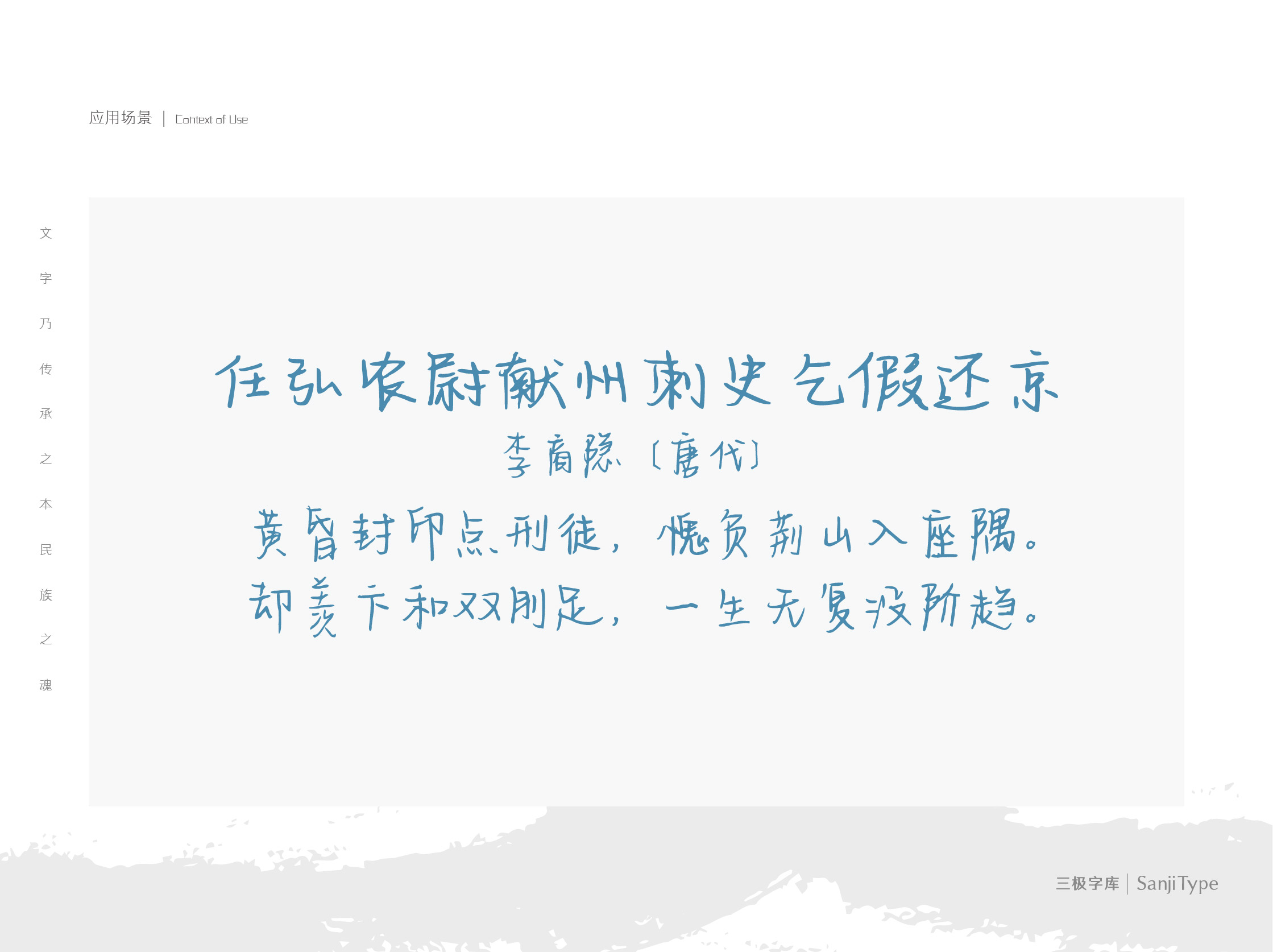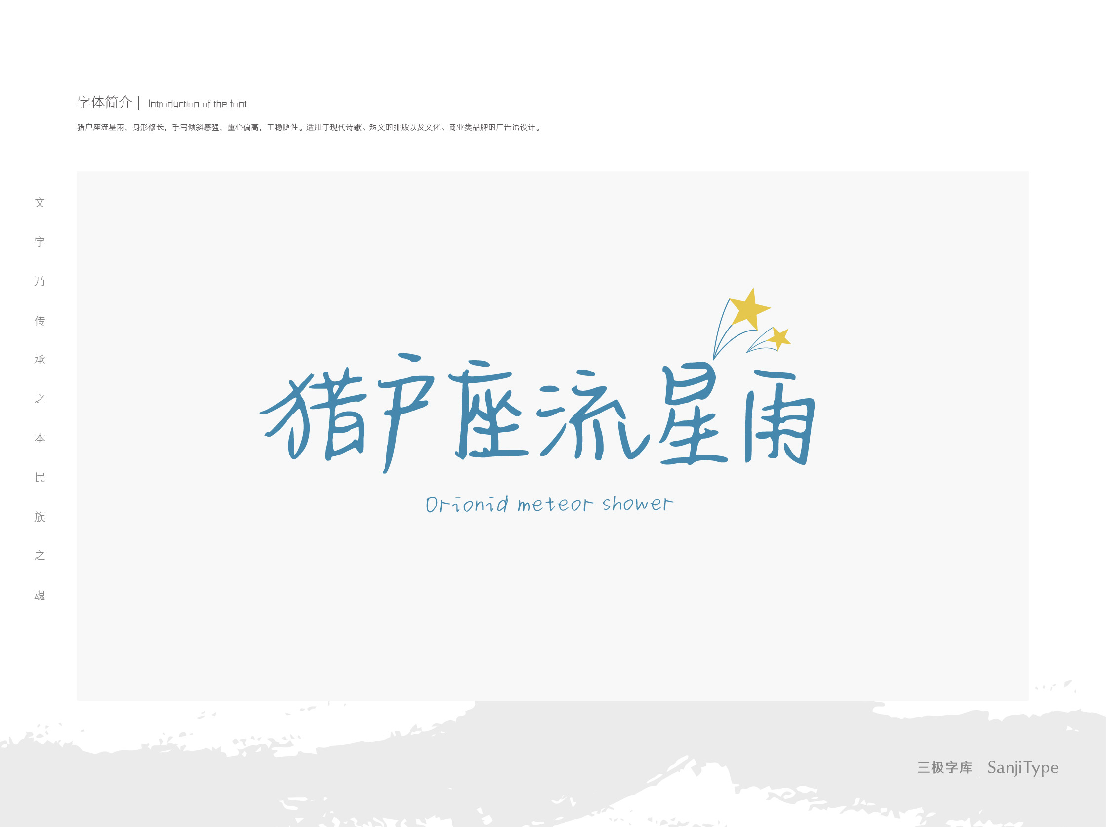 猎户座流星雨,身形修长,手写倾斜感强,重心偏高,工稳随性。适用于现代诗歌、短文的排版以及文化、商业类品牌的广告语设计。