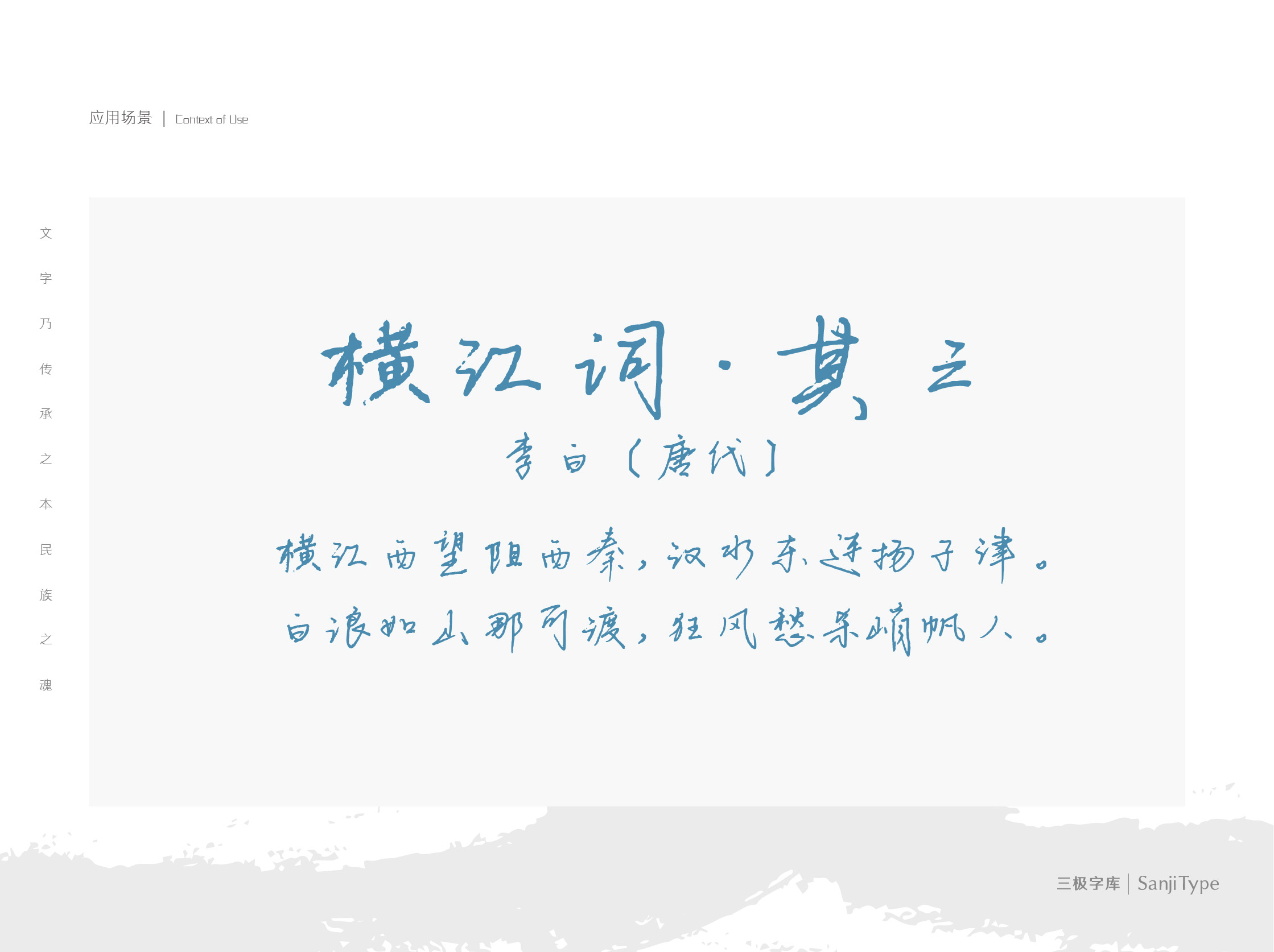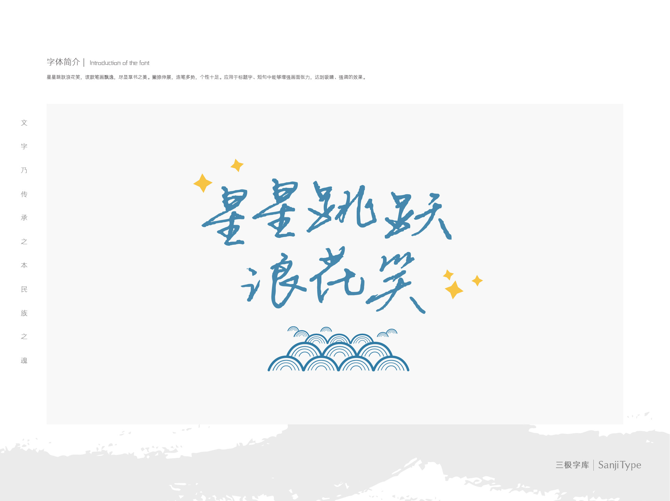 星星跳跃浪花笑,该款笔画飘逸,尽显草书之美。撇捺伸展,连笔多势,个性十足。应用于标题字、短句中能够增强画面张力,达到吸睛、强调的效果。