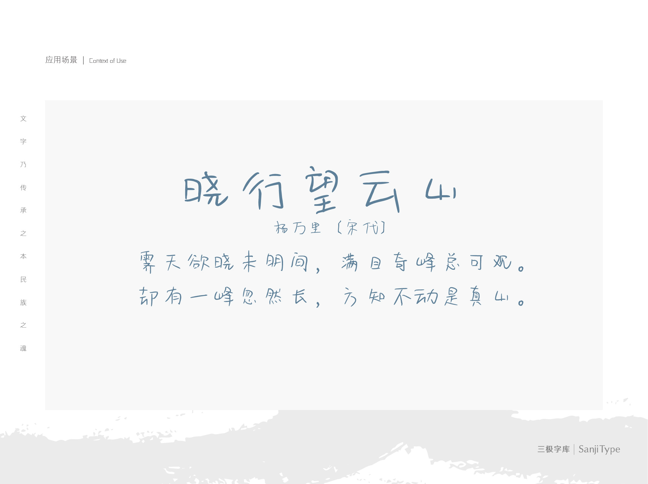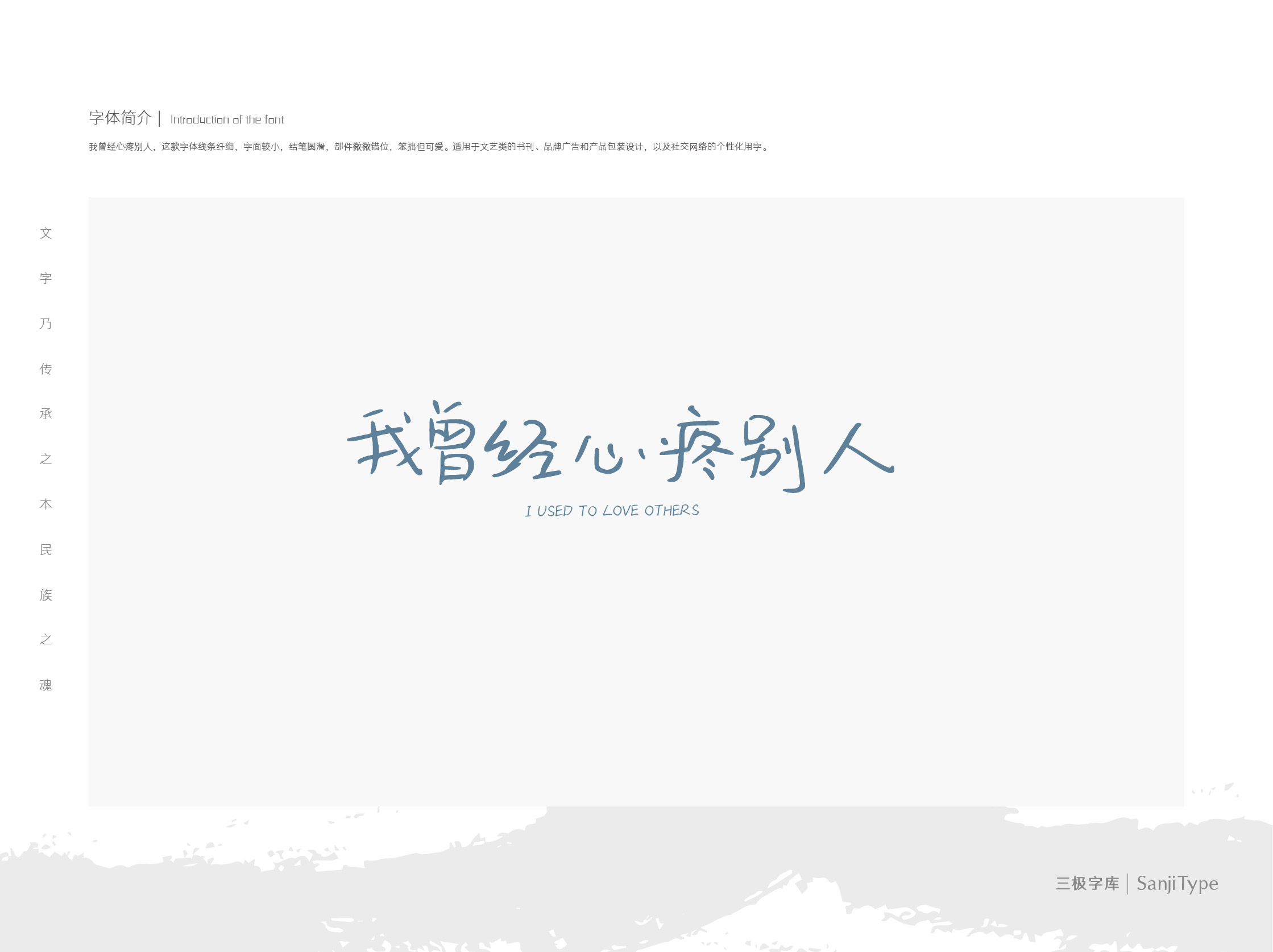 我曾经心疼别人,这款字体线条纤细,字面较小,结笔圆滑,部件微微错位,笨拙但可爱。适用于文艺类的书刊、品牌广告和产品包装设计,以及社交网络的个性化用字。
